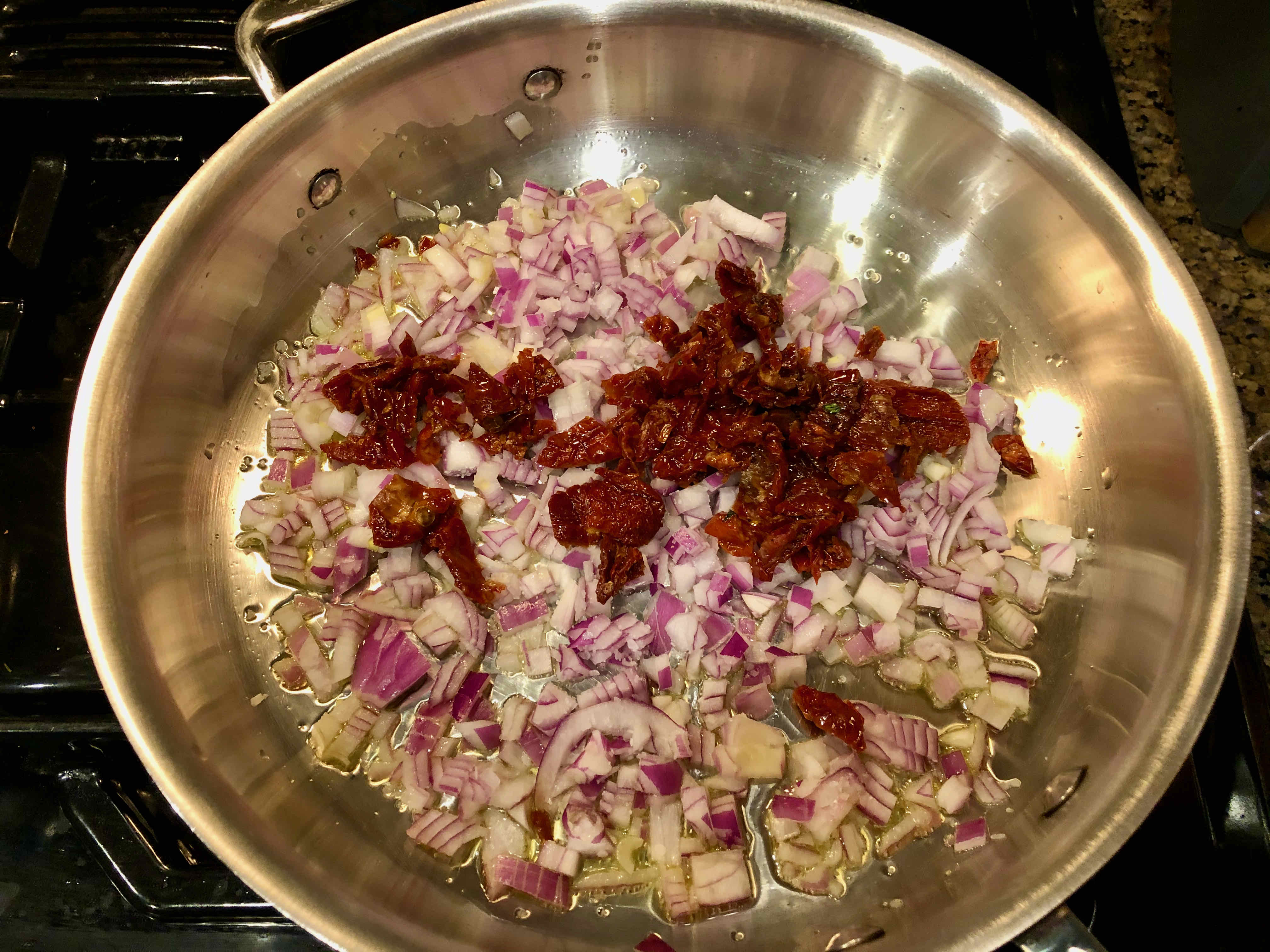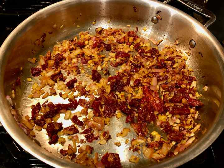 Sautéing the onion and sun-dried tomatoes