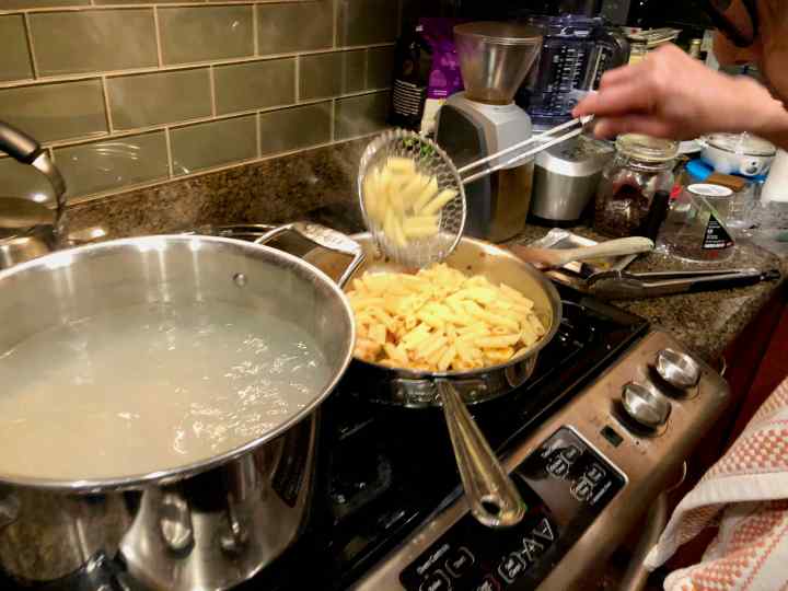 2. Bring a large pot of water to a boil; season water generously with salt. Add pasta; cook 2 minutes less than directed on package, about 6 minutes. Reserve ½ cup pasta cooking water. Drain pasta. If using gluten-free pasta, rinse under cool running water; drain again. (I recommend transferring the pasta from the pot with a spider.)