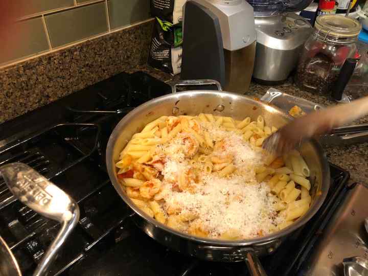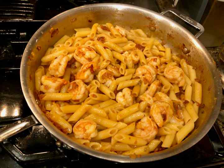 5. Add shrimp, spreading them evenly so they all make contact with bottom of pan. Cook 3–4 minutes, stirring often, or until shrimp are bright pink and opaque all the way through. (I stopped preparing the sauce after cooking the onions. After the pasta reached the midway point, I added the shrimp to the sauté pan and resumed cooking the sauce.)