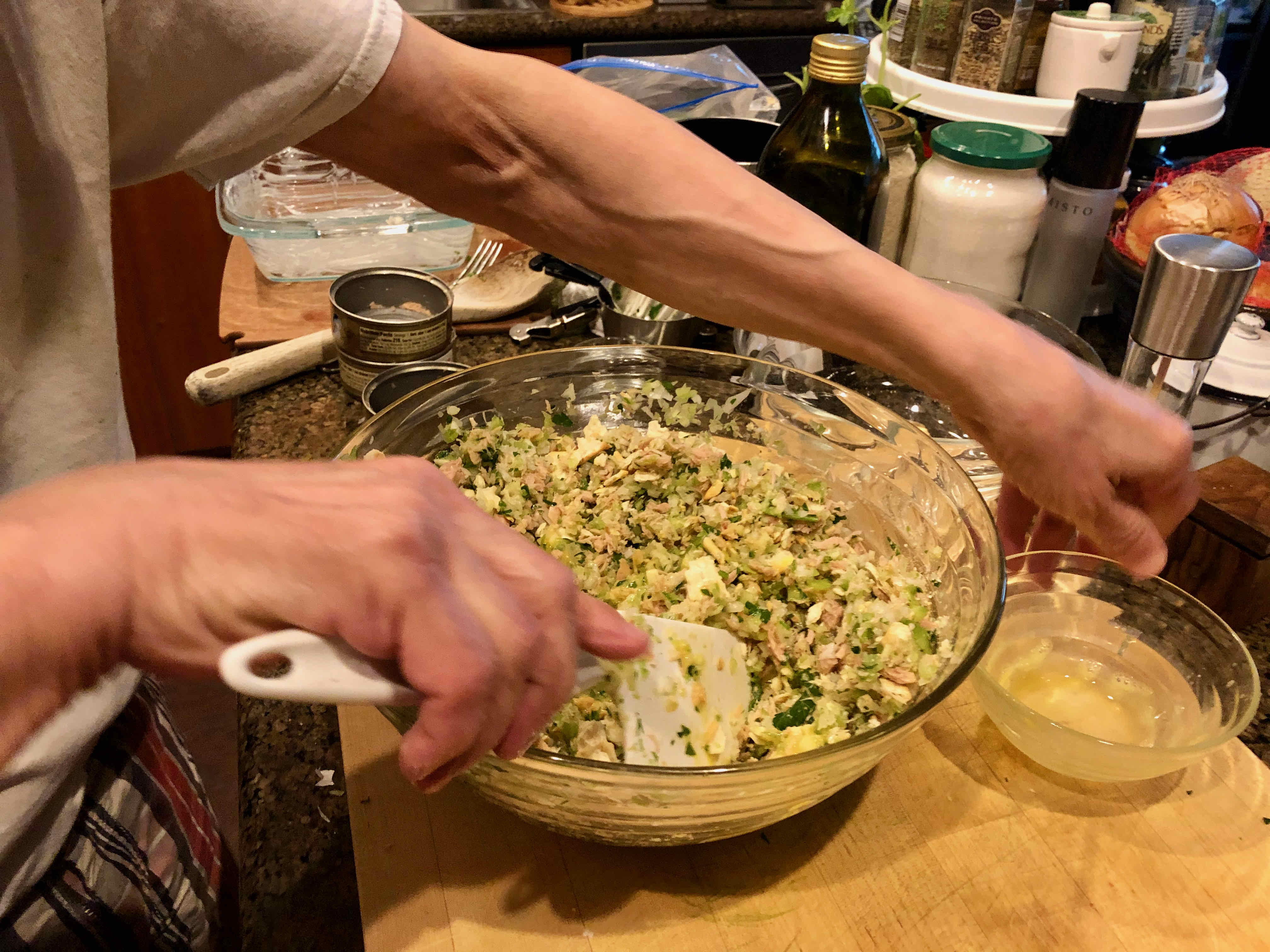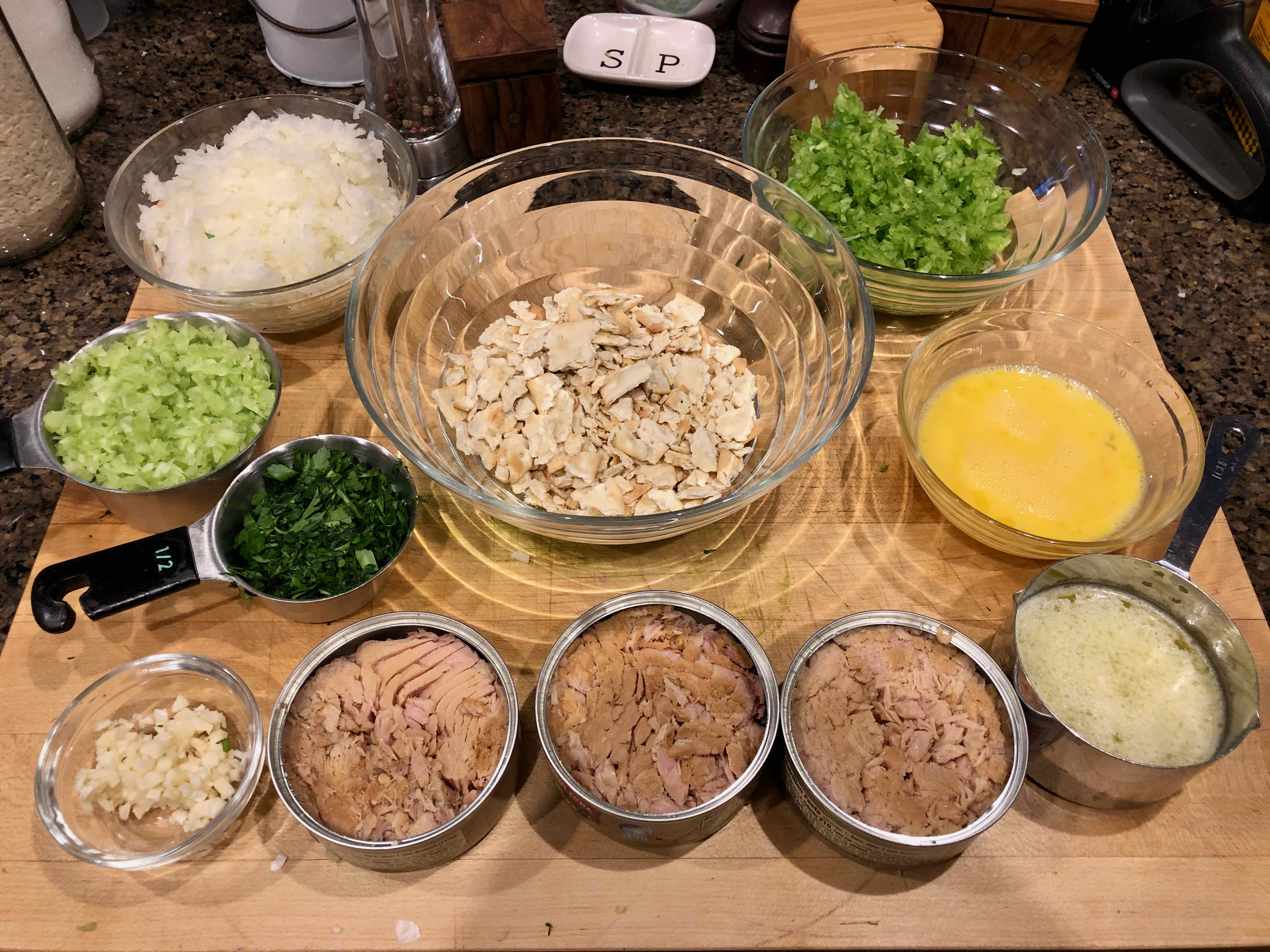 So now, some sixty years later, I decided to fulfill my desire for this classic dish and make this staple American cooking. Beard’s recipe called for readily available ingredients and the directions comprised all of five sentences. Because the amount of tuna in a can slowly decreased from 6 or 7 ounces to 4 ounces, however, I used three cans rather than two. Similarly, the call for two large onions from the 50s was fulfilled by a one colossal Spanish onion.