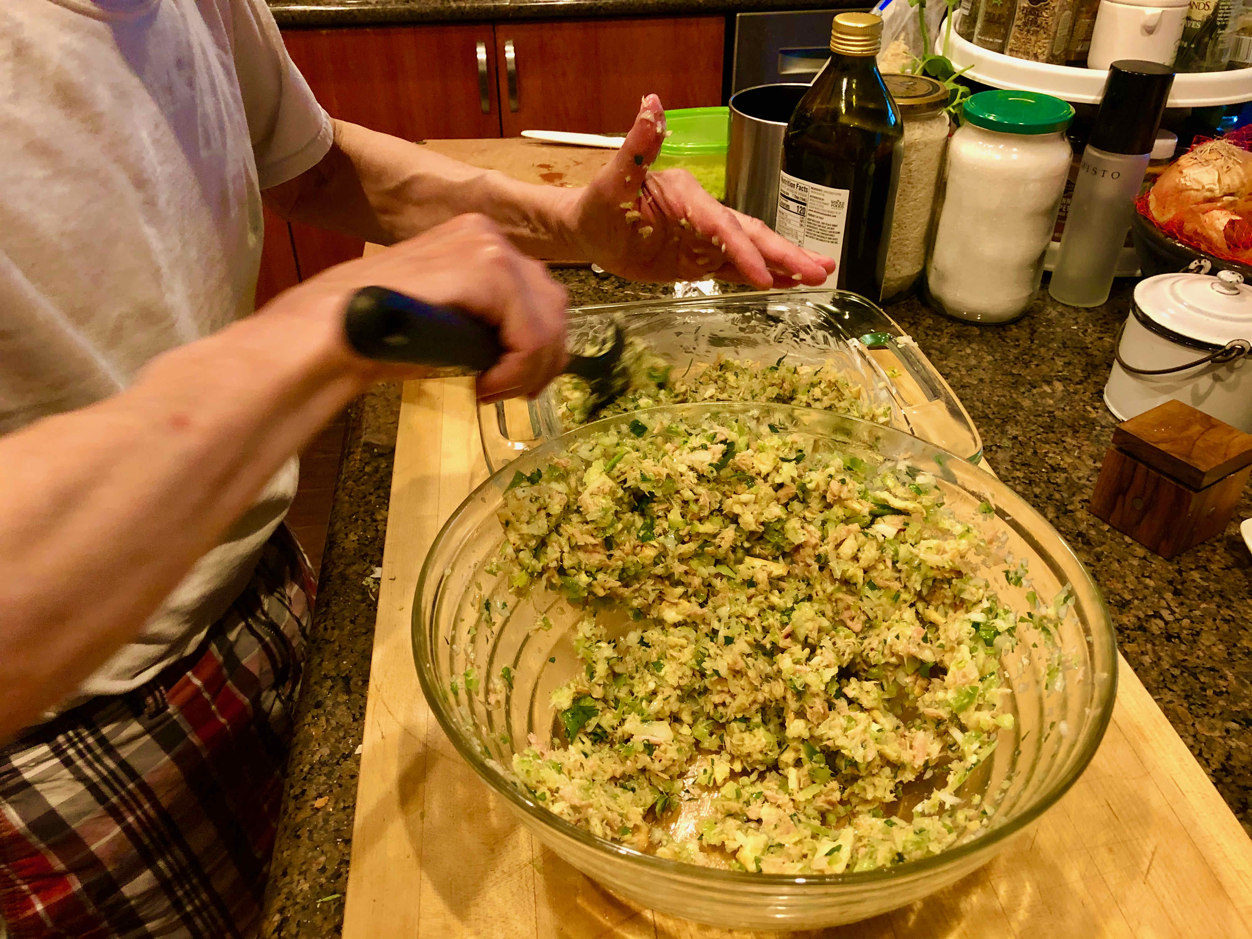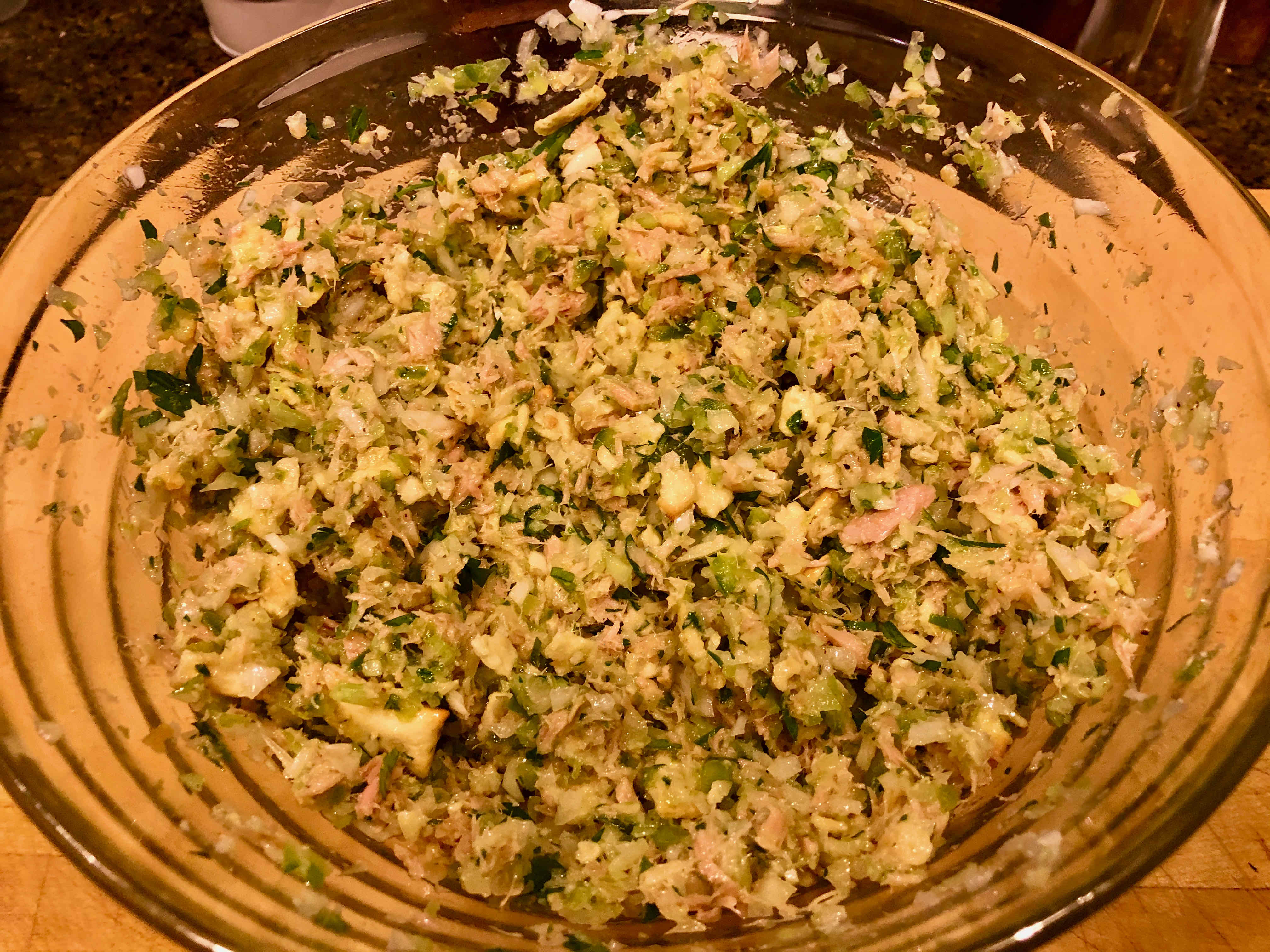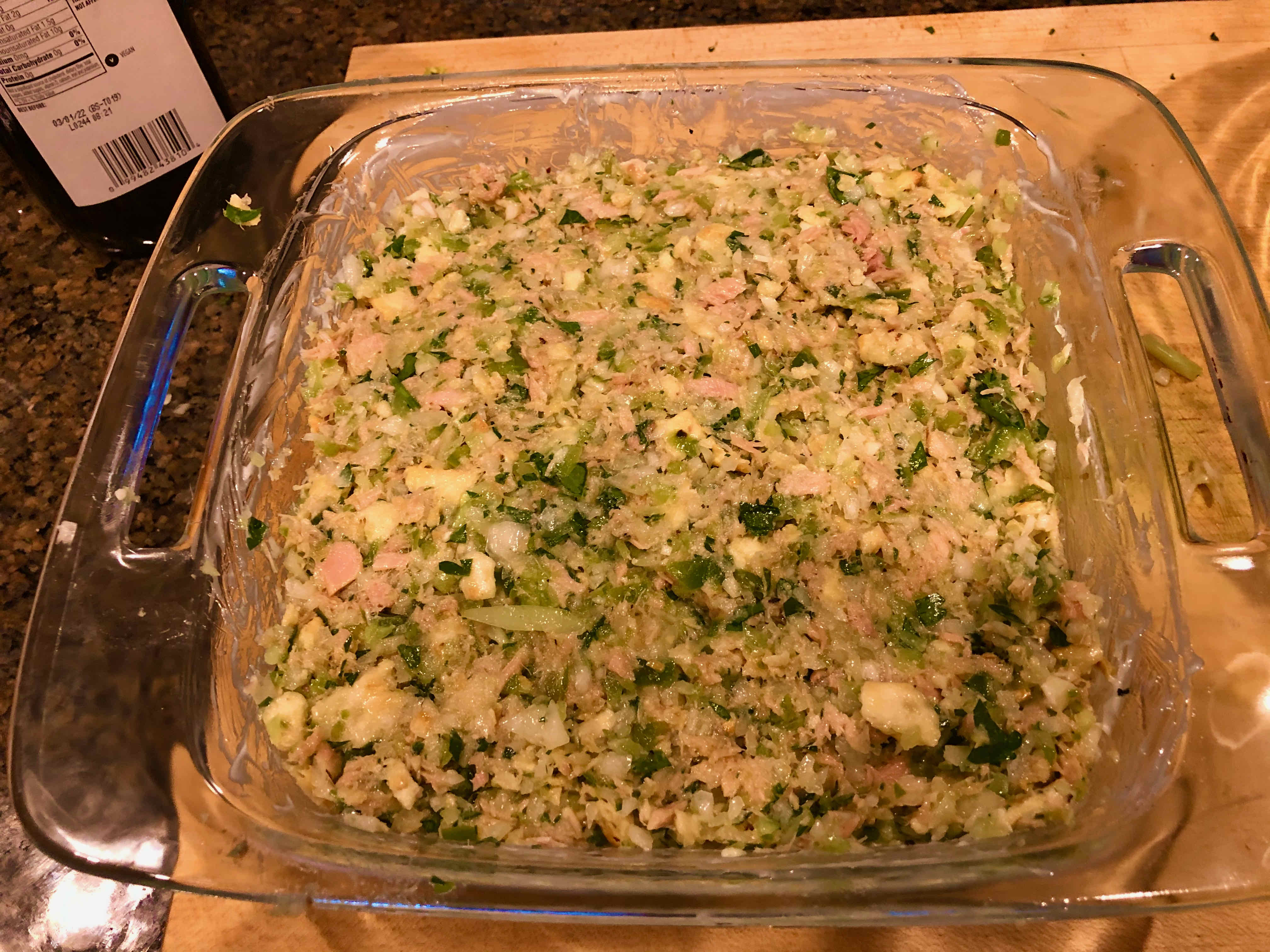 I prepped the ingredients (there was a lot of chopping—celery, garlic, onions, bell pepper, parsley), combined as directed with smashed crackers, melted butter, and beaten egg, poured everything into a buttered Pyrex casserole (couldn’t get more American than that) and baked. To indulge my husband’s ask for a crusty top, I sprinkled the top of the casserole with some of the left-over cracker crumbs before the required dotting with butter.
