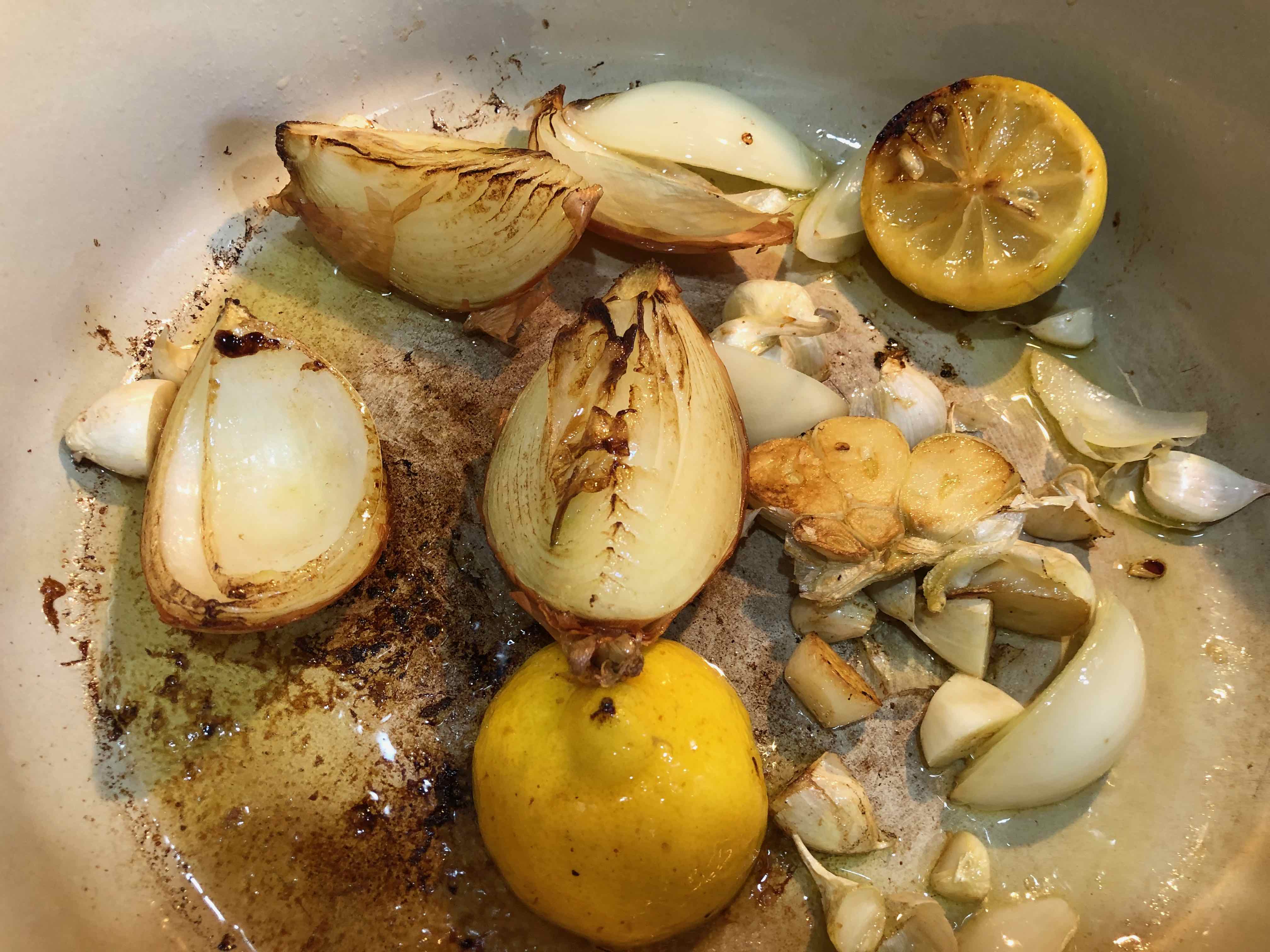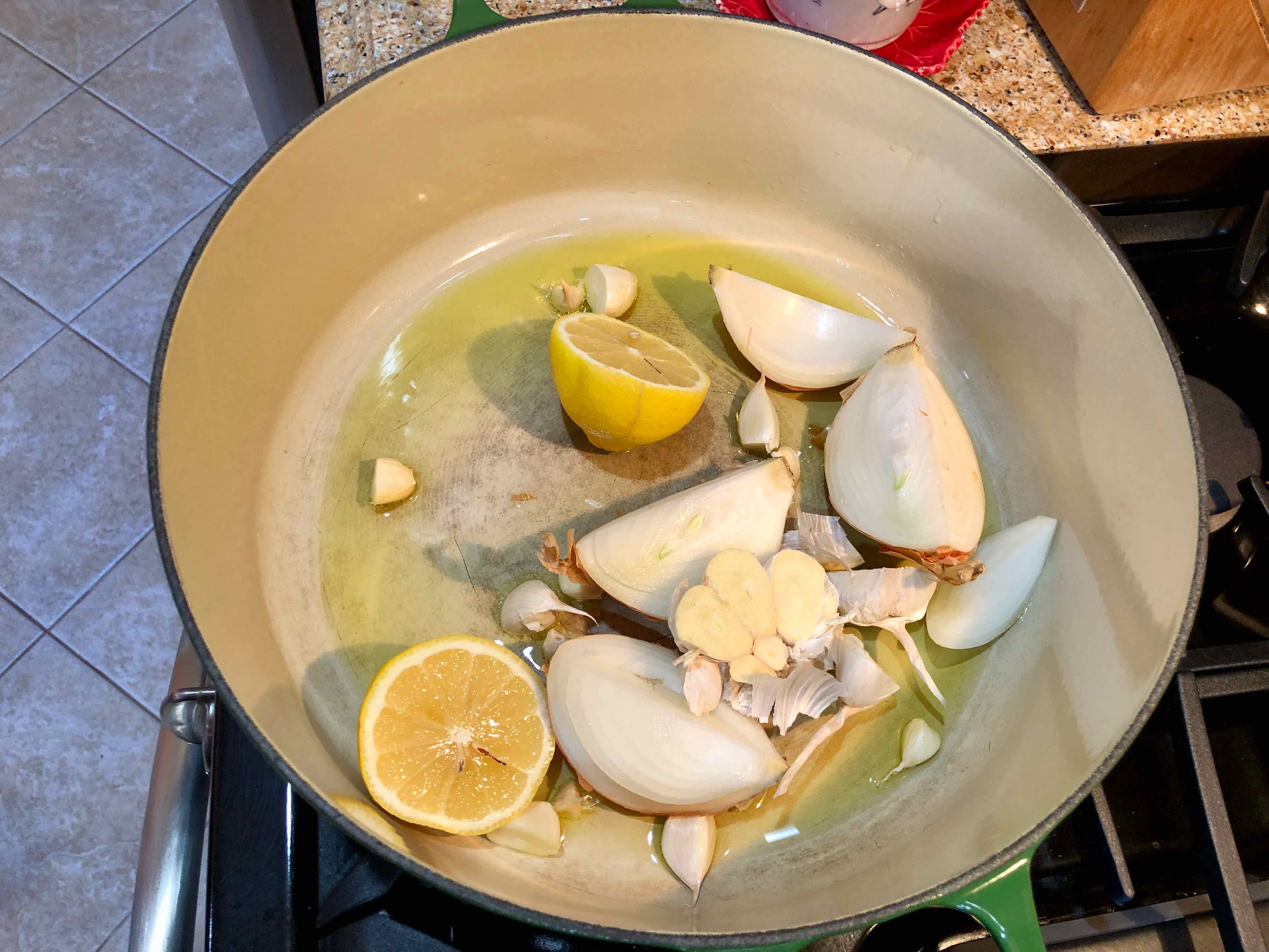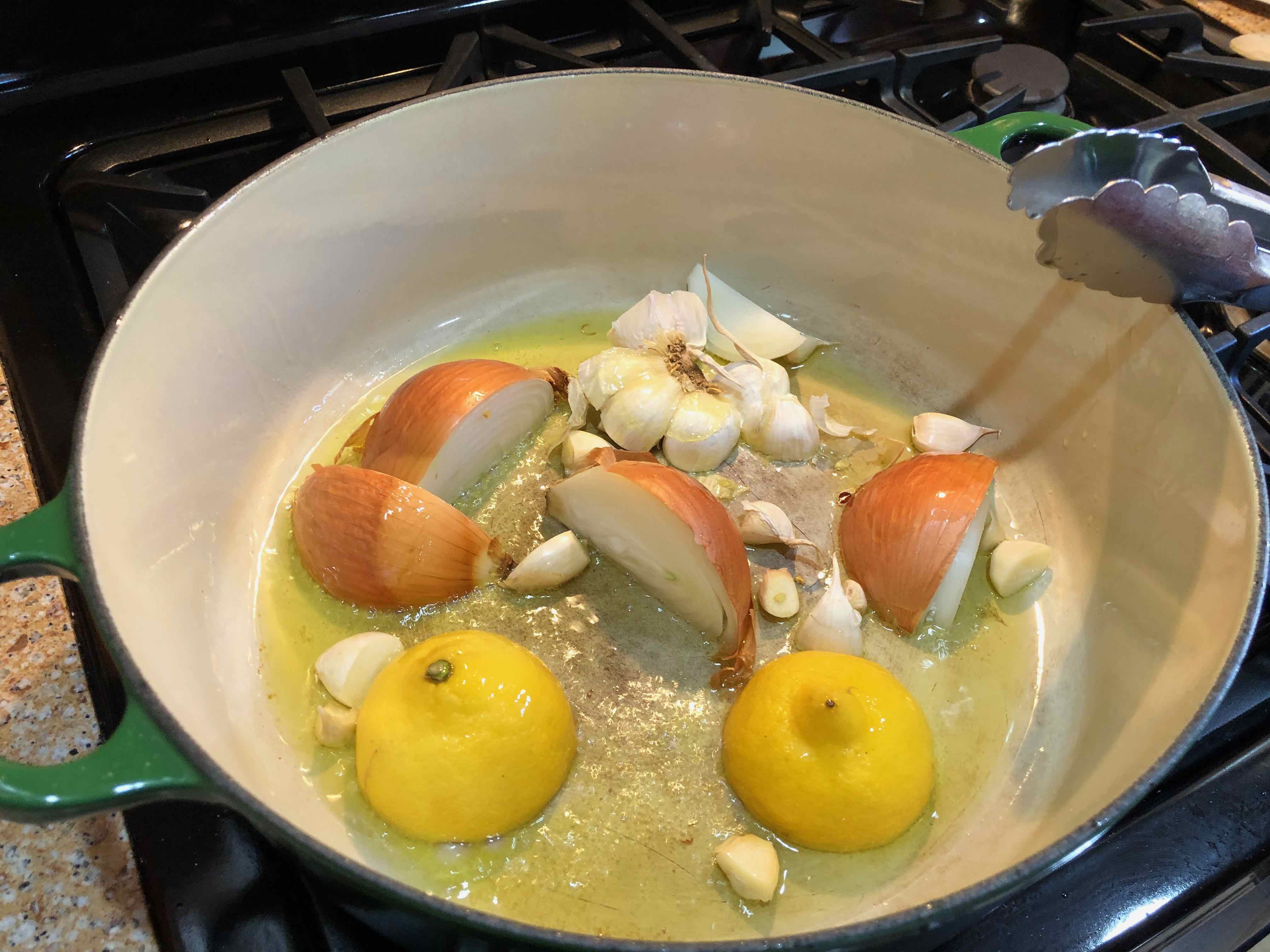 1. Heat olive oil over medium heat in a large pot. Add onions, garlic and lemon. Cook until they’re caramelized and nicely browned, about 5 to 6 minutes.