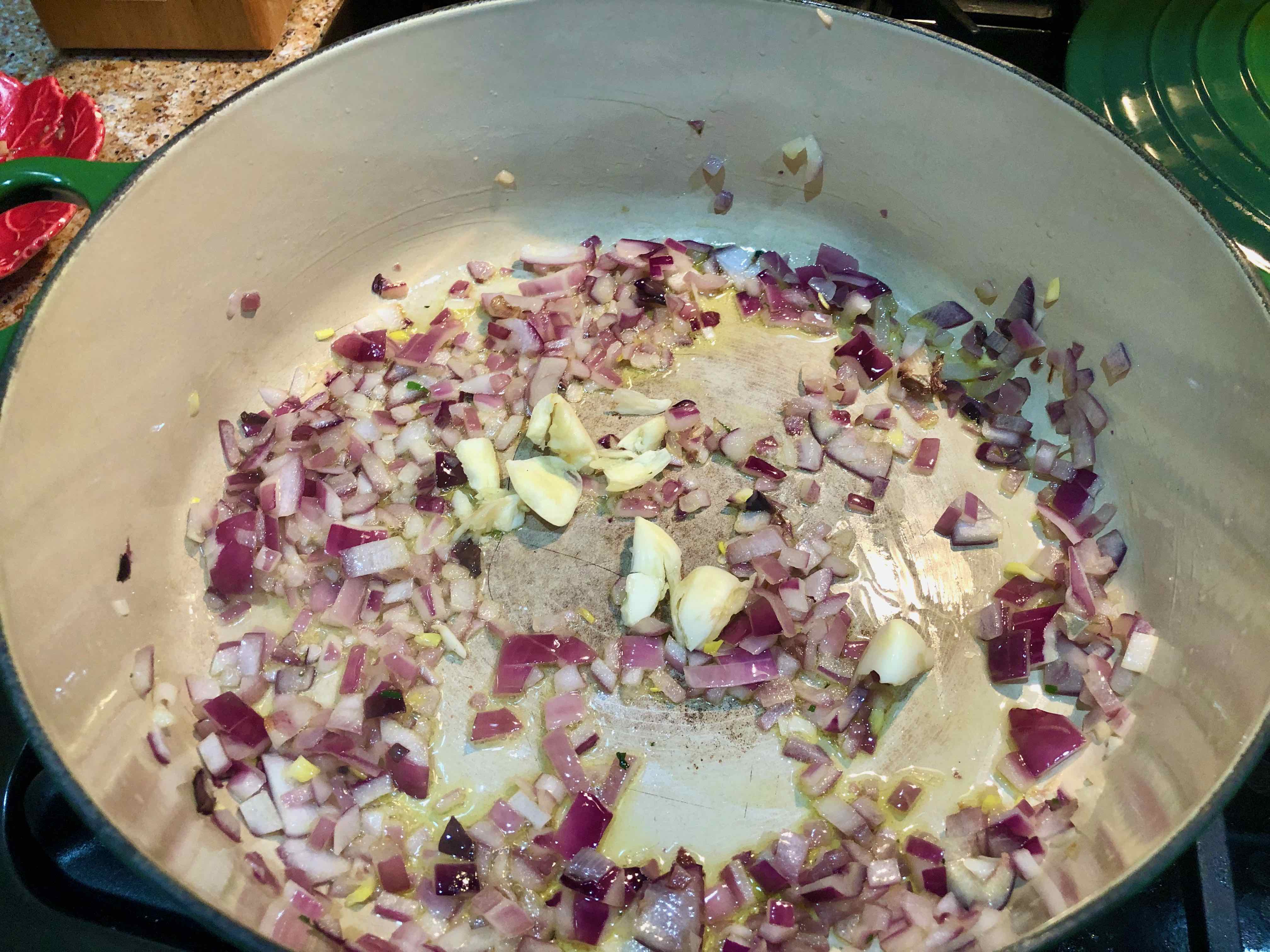 2. Add the onions and cook until lightly browned, about 7 to 10 minutes. Add the garlic and cook until fragrant, about 2 minutes.