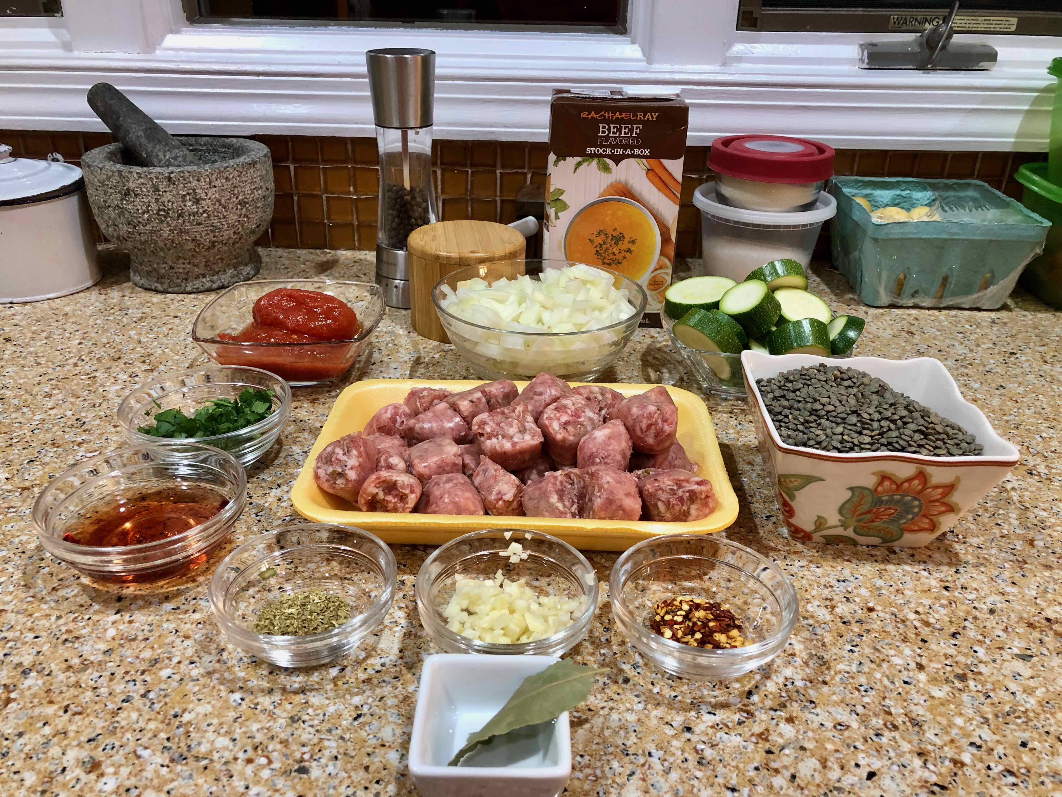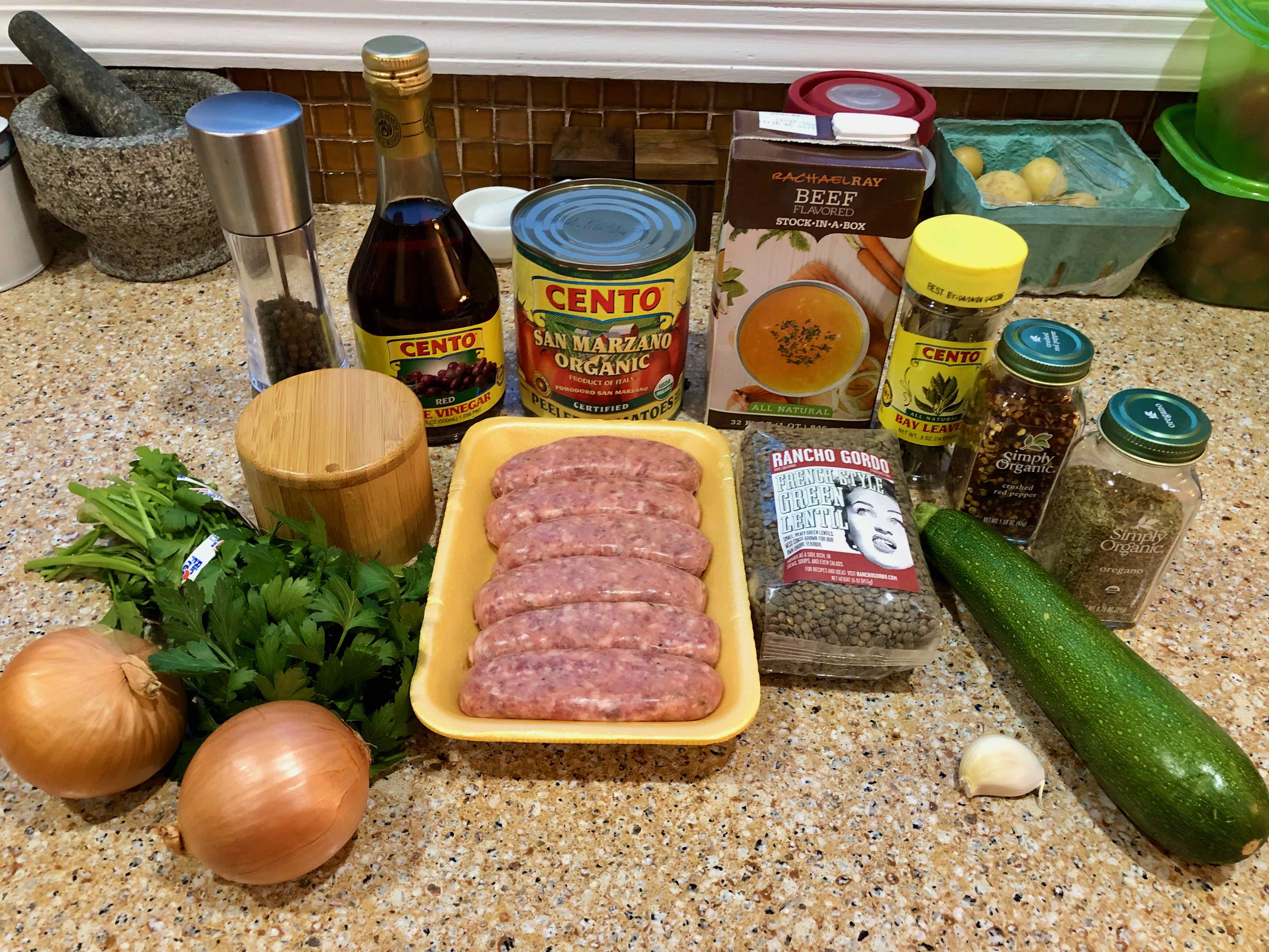 Fortunately, we had almost everything required–even a fresh zucchini, which was intended for another purpose. The only ingredients lacking were plum tomatoes, for which we substituted the Italian canned plum variety, and a quarter pound of hot sausage, which we made up for by adding some crushed red-pepper flakes to our expiring pound of sweet.