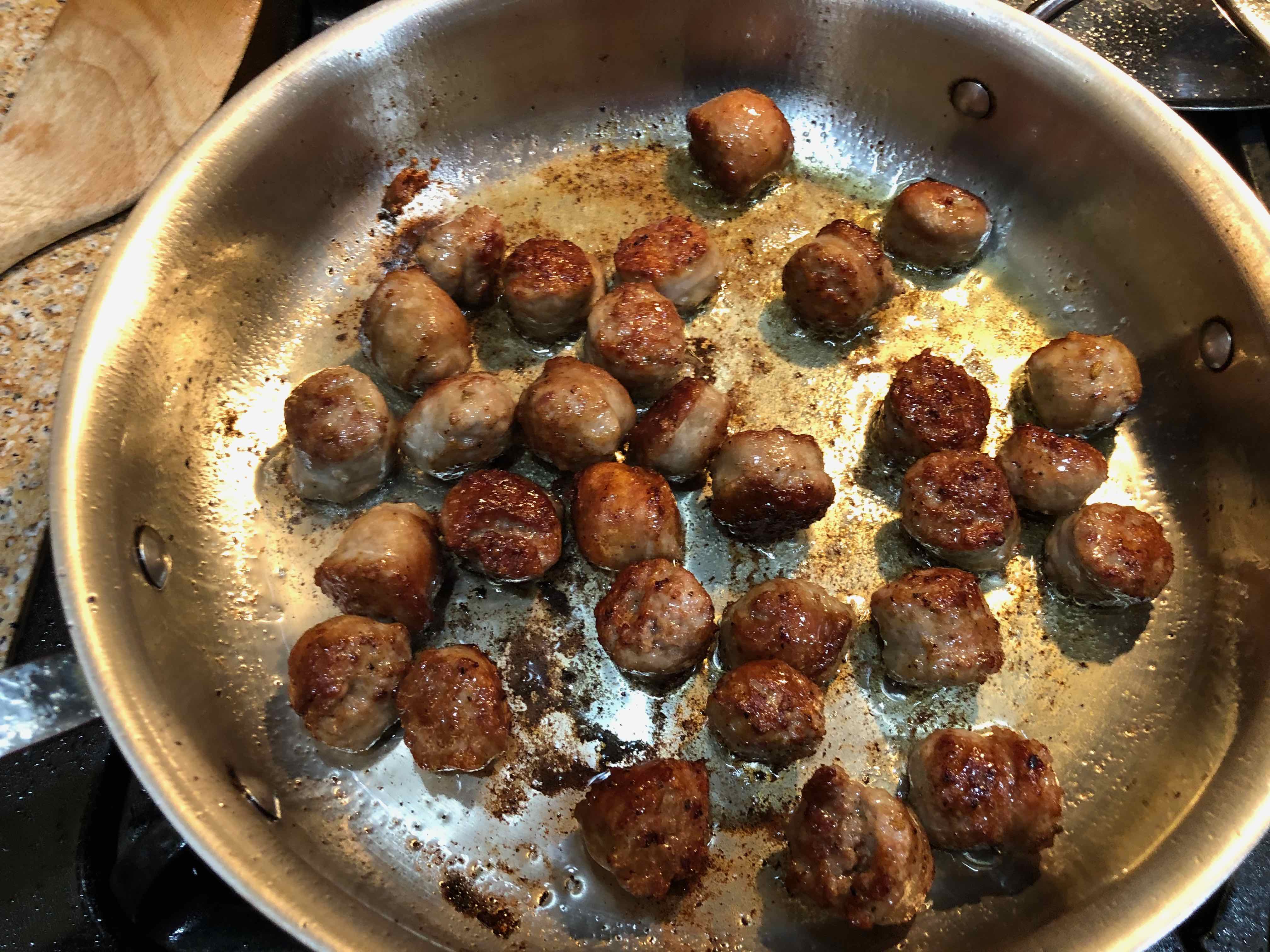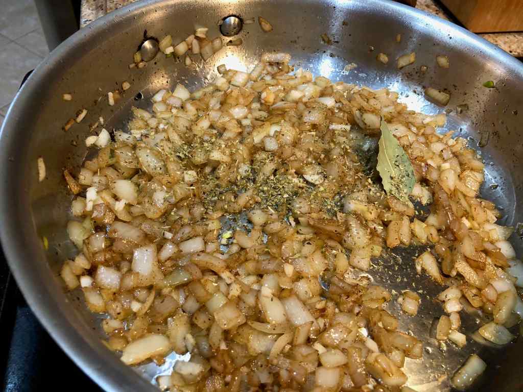 2. In the sausage fat remaining in the skillet, sauté the onions over medium heat until tender, but not browned, about 5 minutes.  While sautéing scrape up any browned bits from the bottom of the pan.