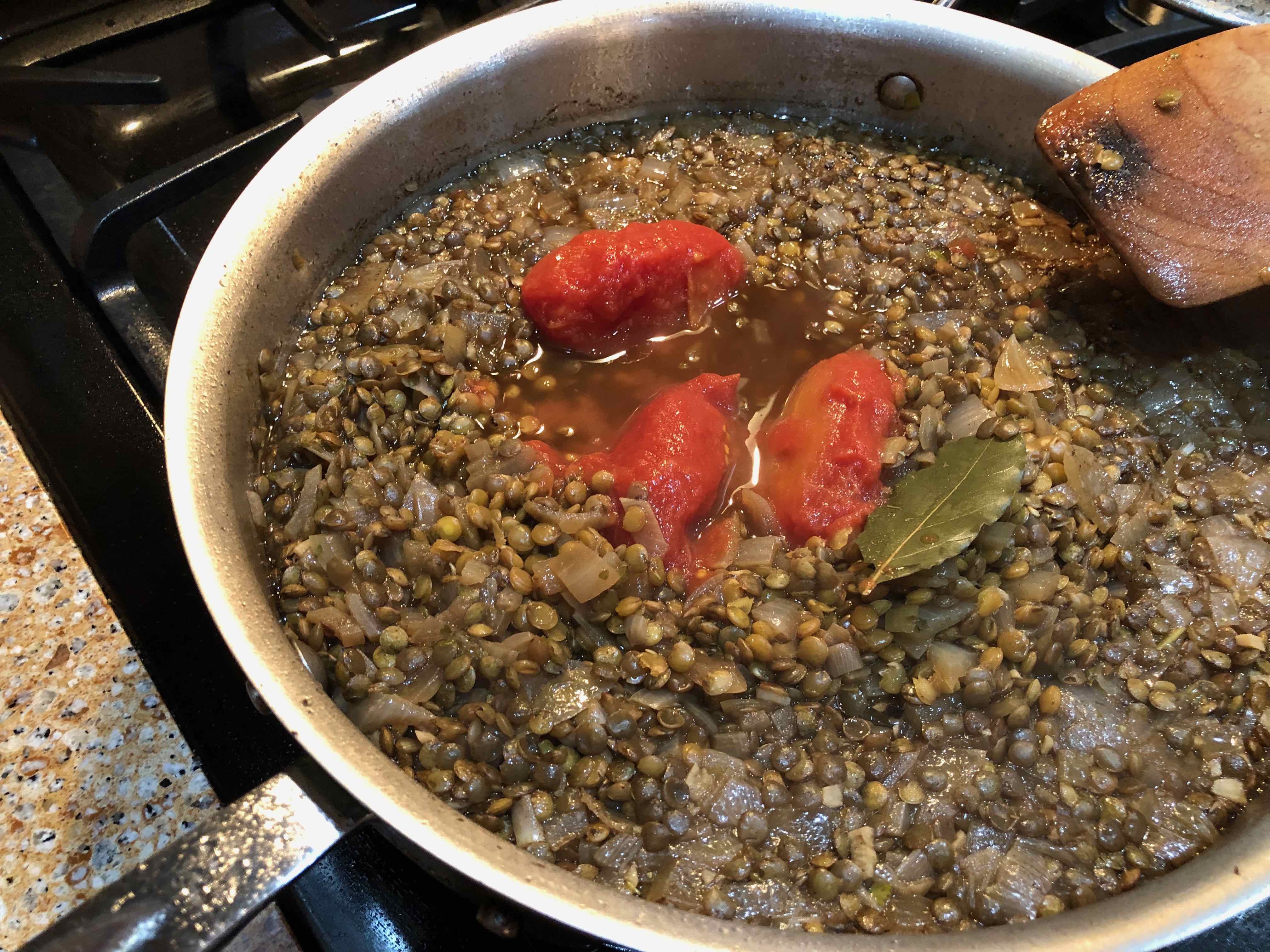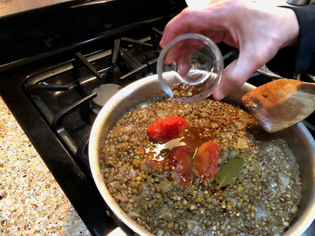 4. Add the bay leaf, oregano, stock, vinegar, and lentils.