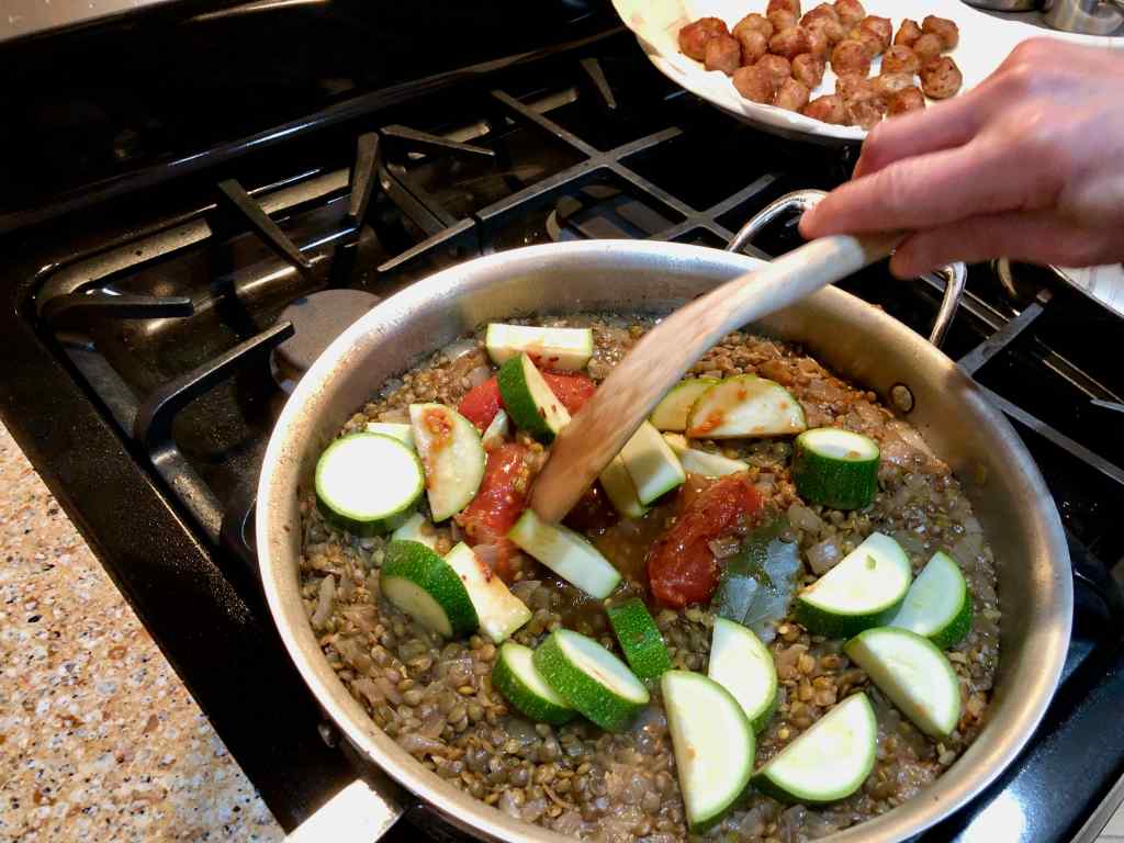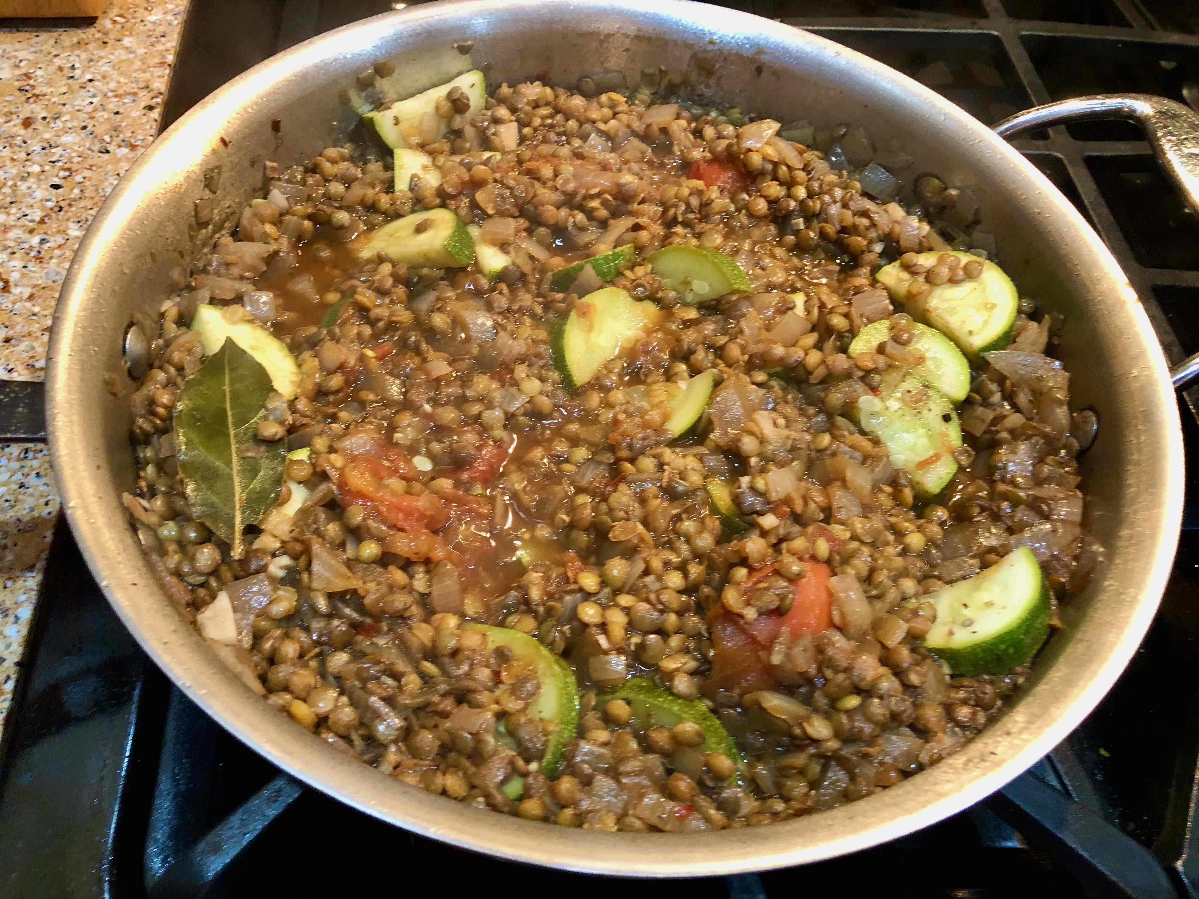7. Cover and continue simmering until the lentils and zucchini are tender but still retain their shapes, about 15 to 20 minutes.