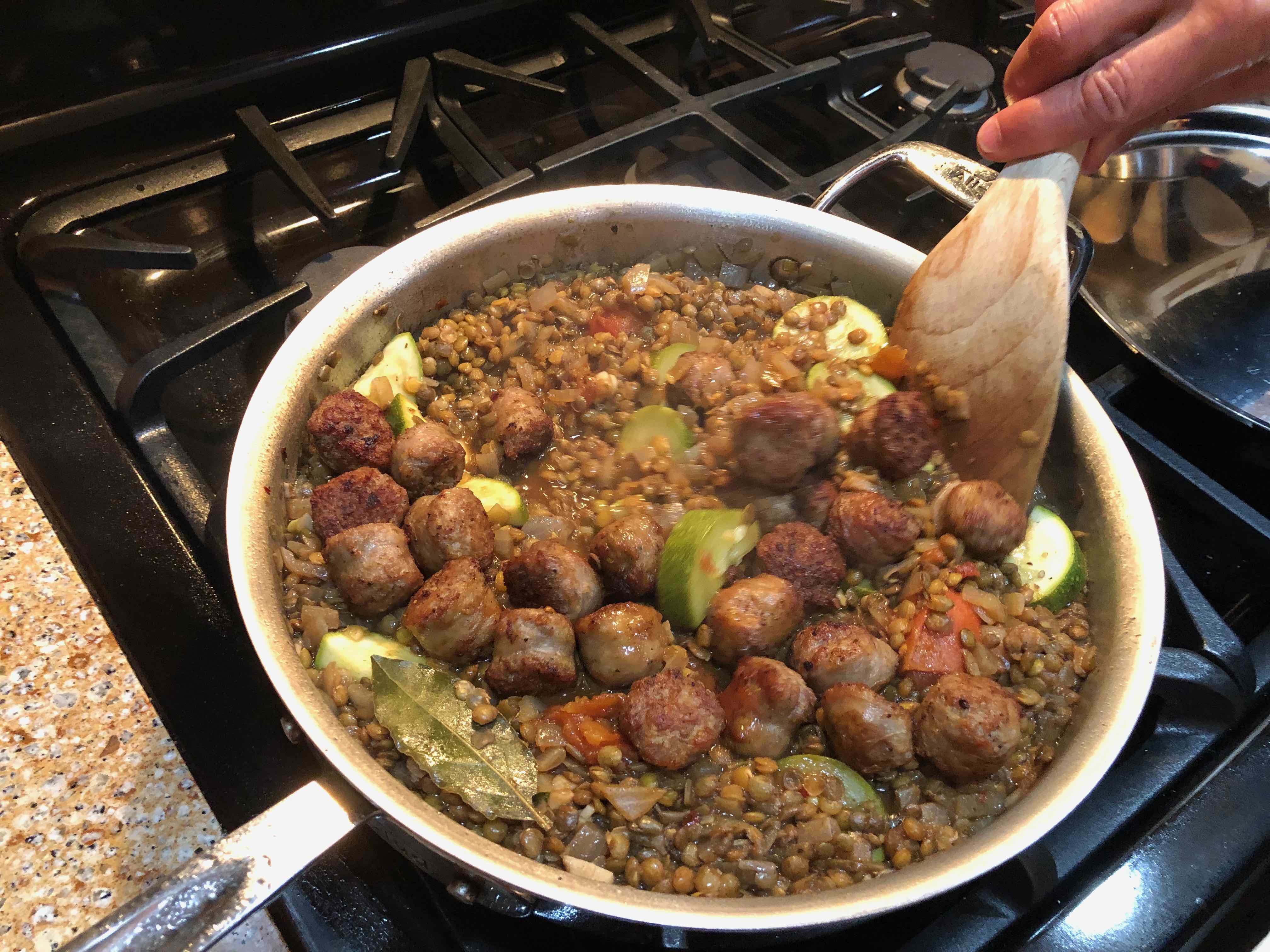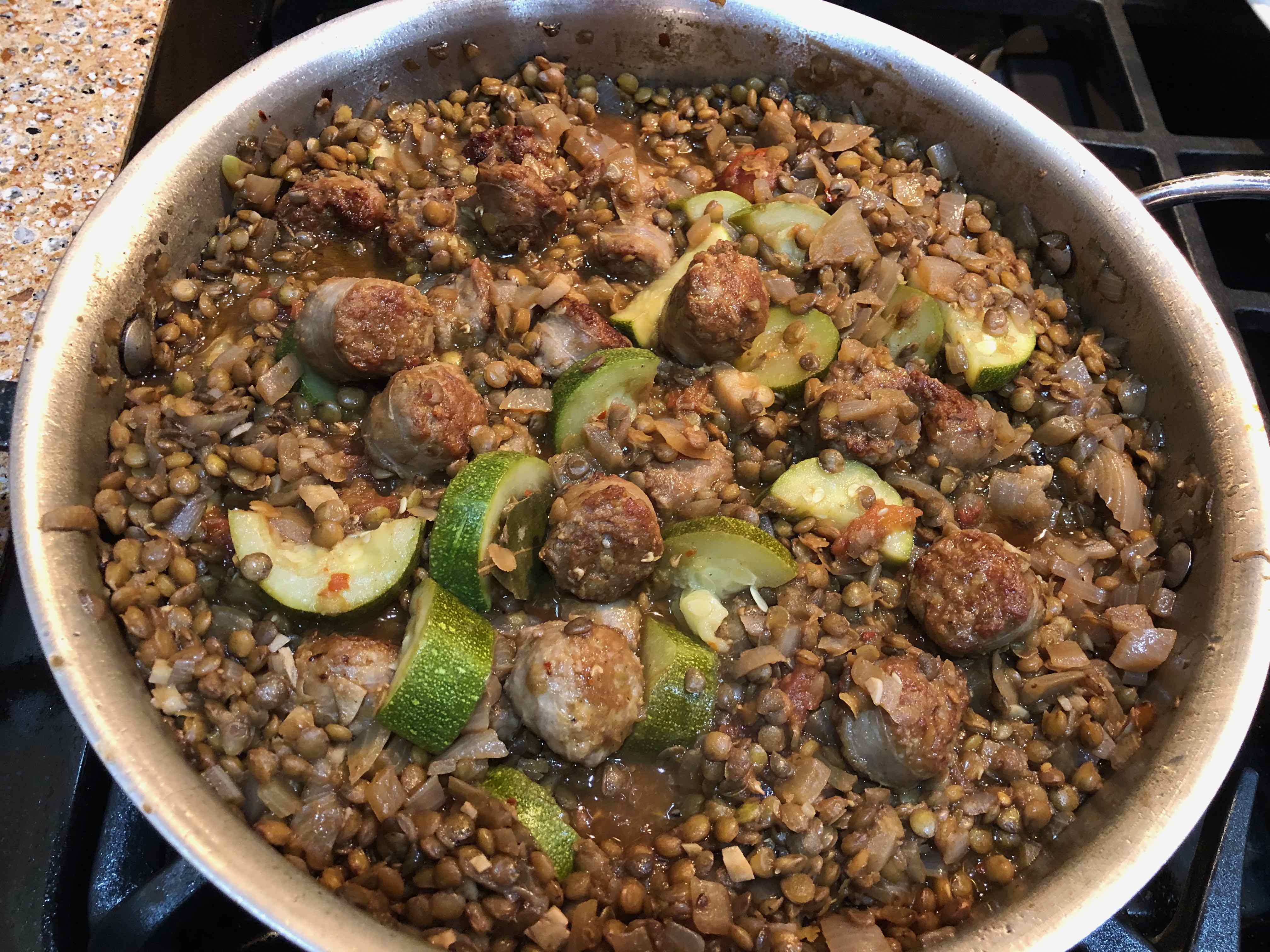 I’m happy to report that this dish surpassed our expectations. The rich meaty flavors from the browned sausage blended perfectly with the deep earthy flavors from the perfectly cooked lentils. The zucchini and tomatoes added just a hint of sweetness that was balanced with the pungency from the oregano and vinegar. Rather than using, as suggested by the recipe, individual casseroles, I opted for pasta bowls and served the dish with a drizzle of olive oil and accompanied by slices of crusty Italian bread.