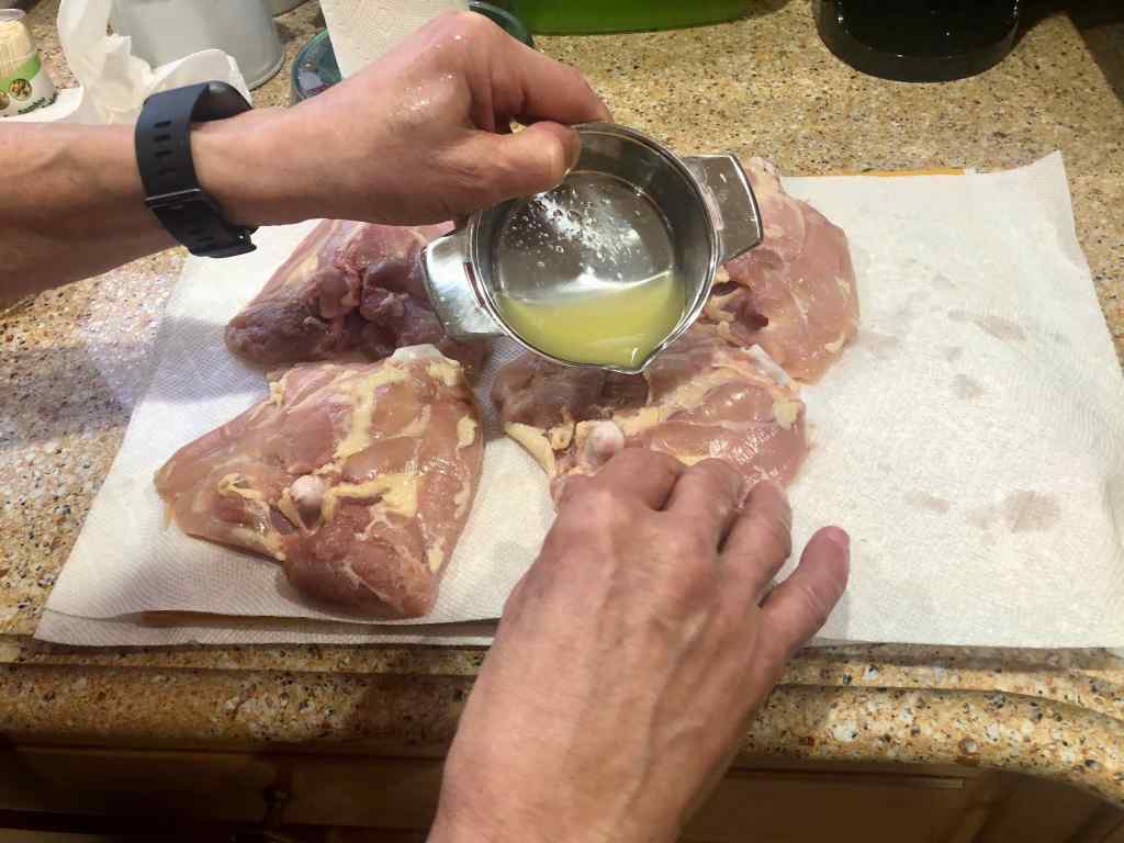 1. Rub the pieces of chicken with the juice of ½ lemon. (I rubbed the meat side to leave the skin side dry and let the pieces sit for 15 minutes.) Season the chicken with salt and pepper.