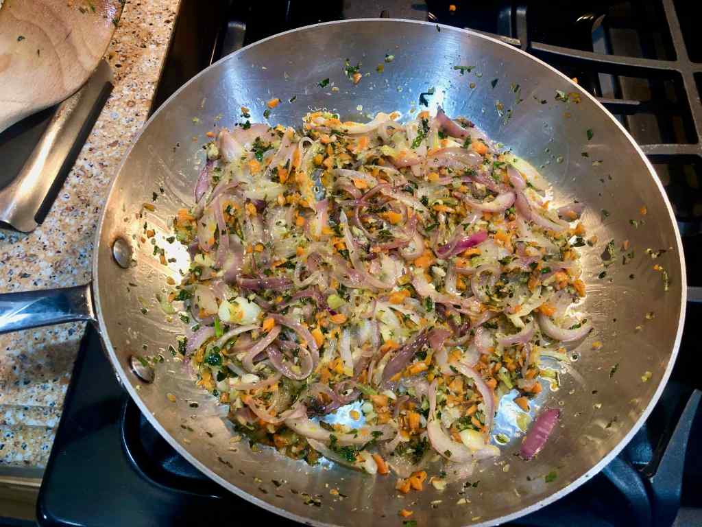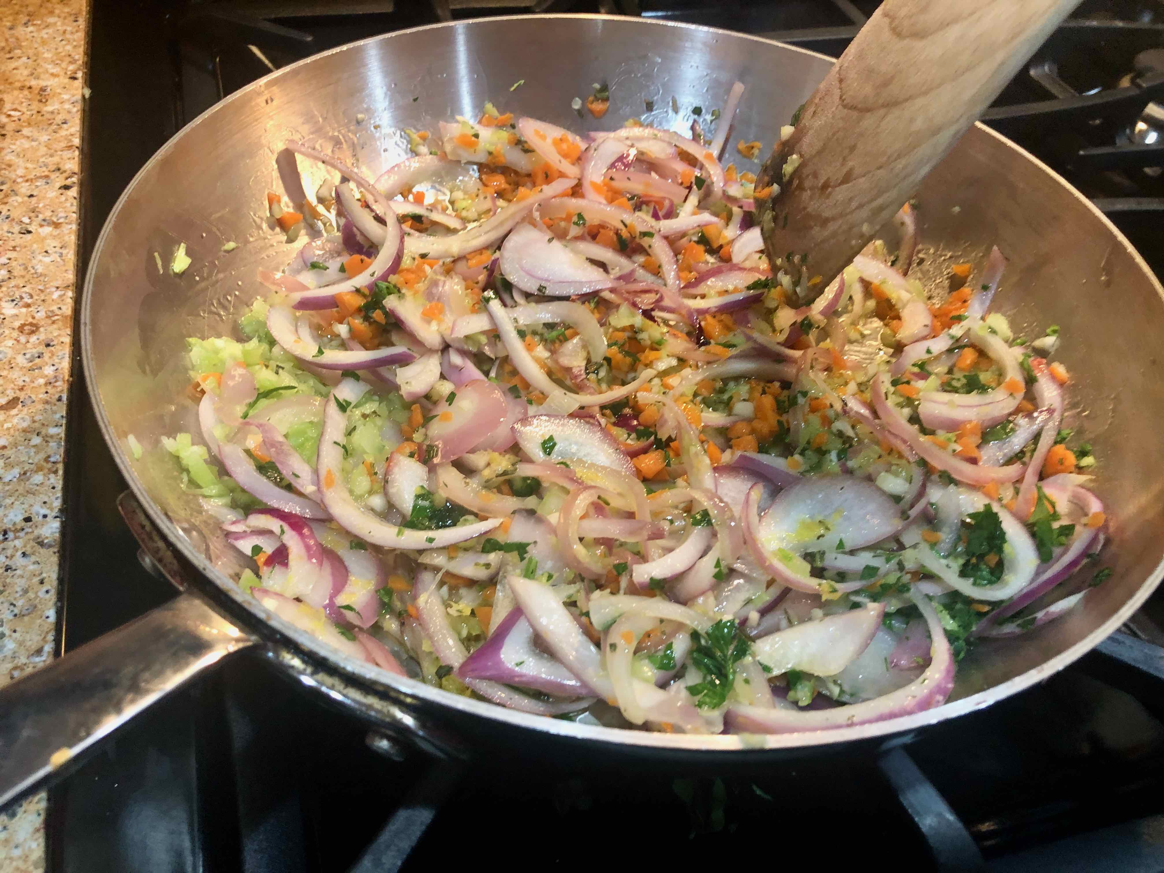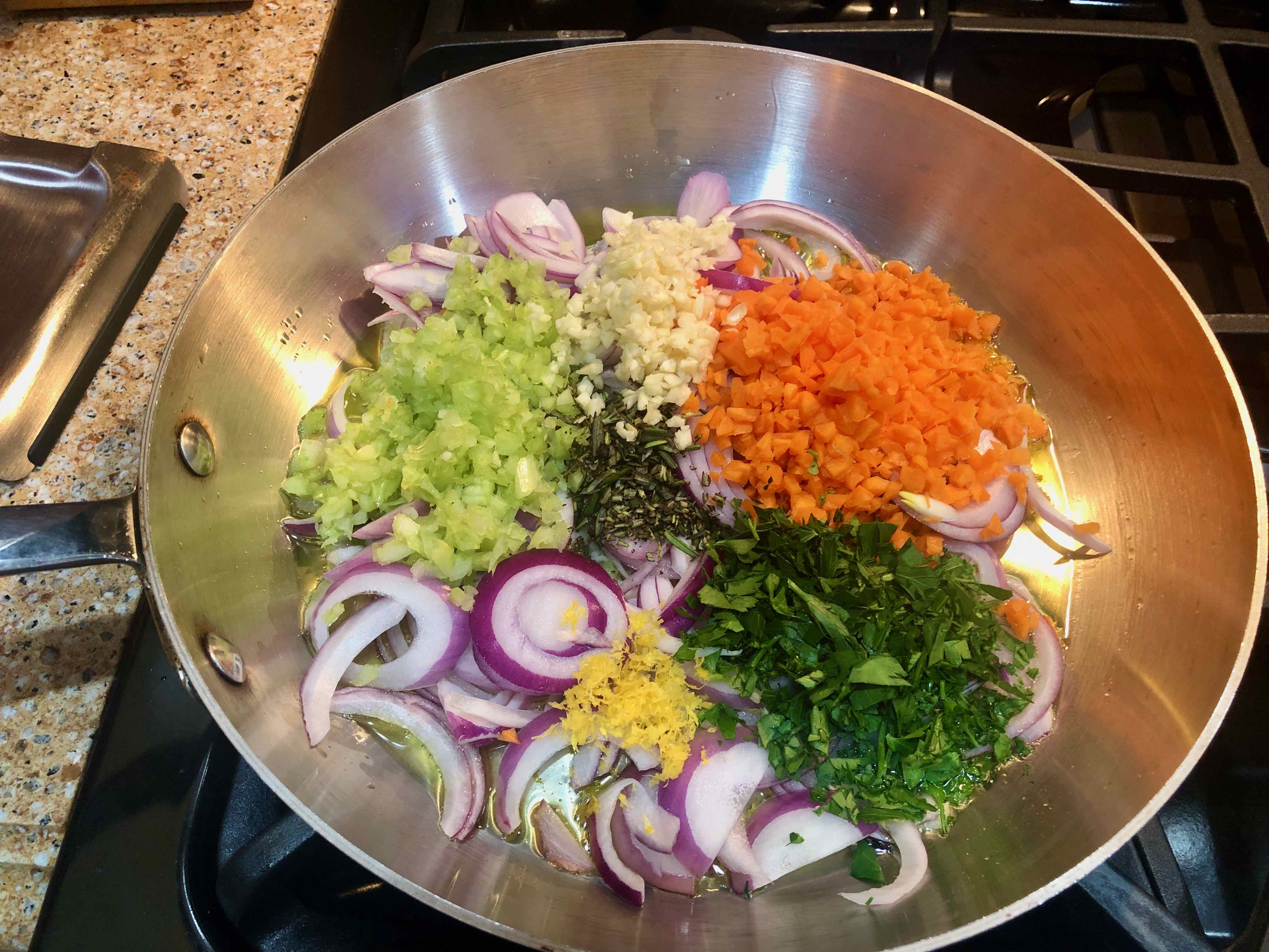 2. Warm 4 tablespoons of the olive oil in a 10- or 12-inch heavy skillet or sauté pan and sauté the onion, carrot, celery, parsley, rosemary, and one third of the lemon zest over low-medium heat for 15 minutes, until the onions are soft but not yet golden. (Season the aromatics with salt when you start to sauté.)