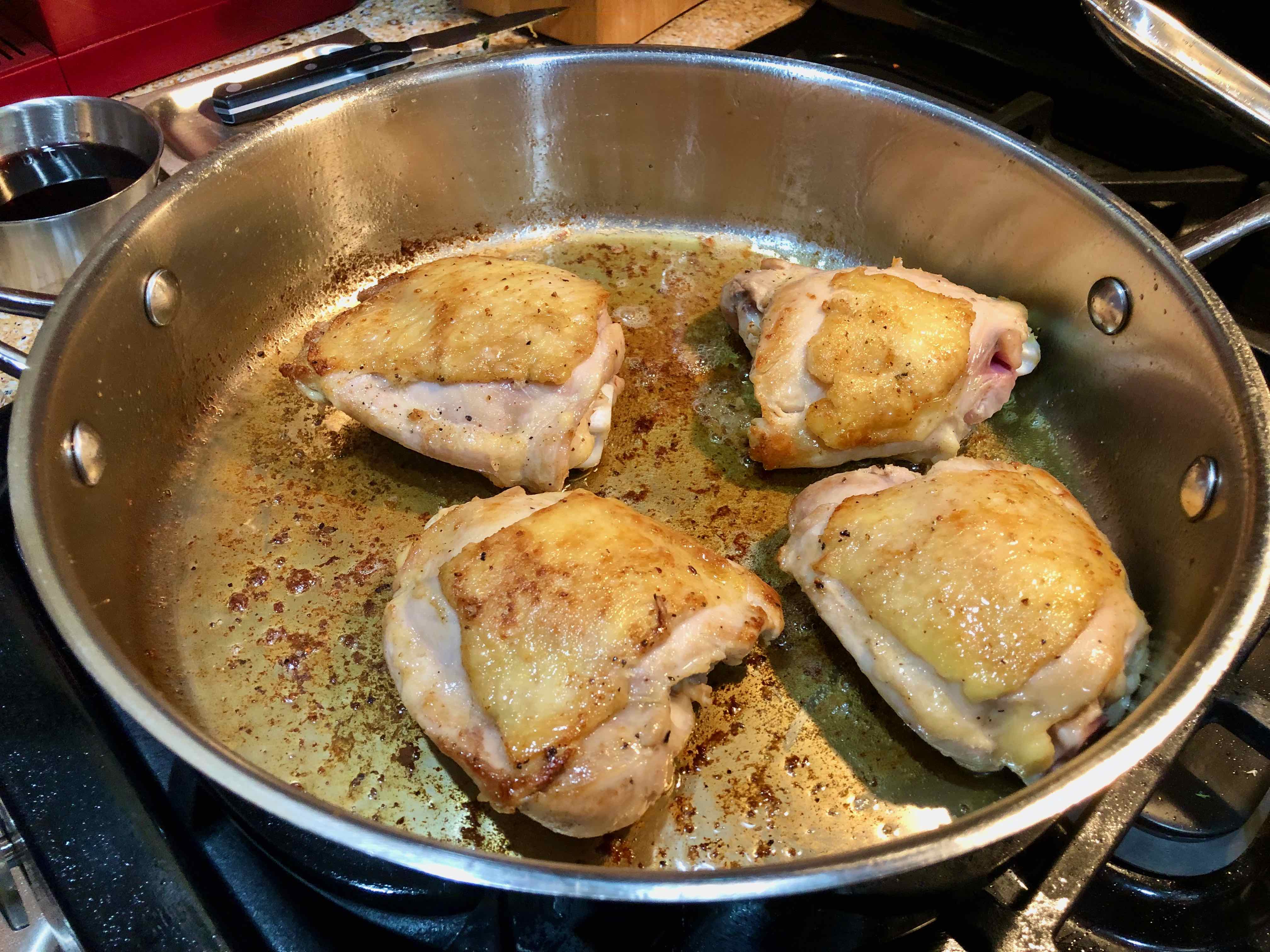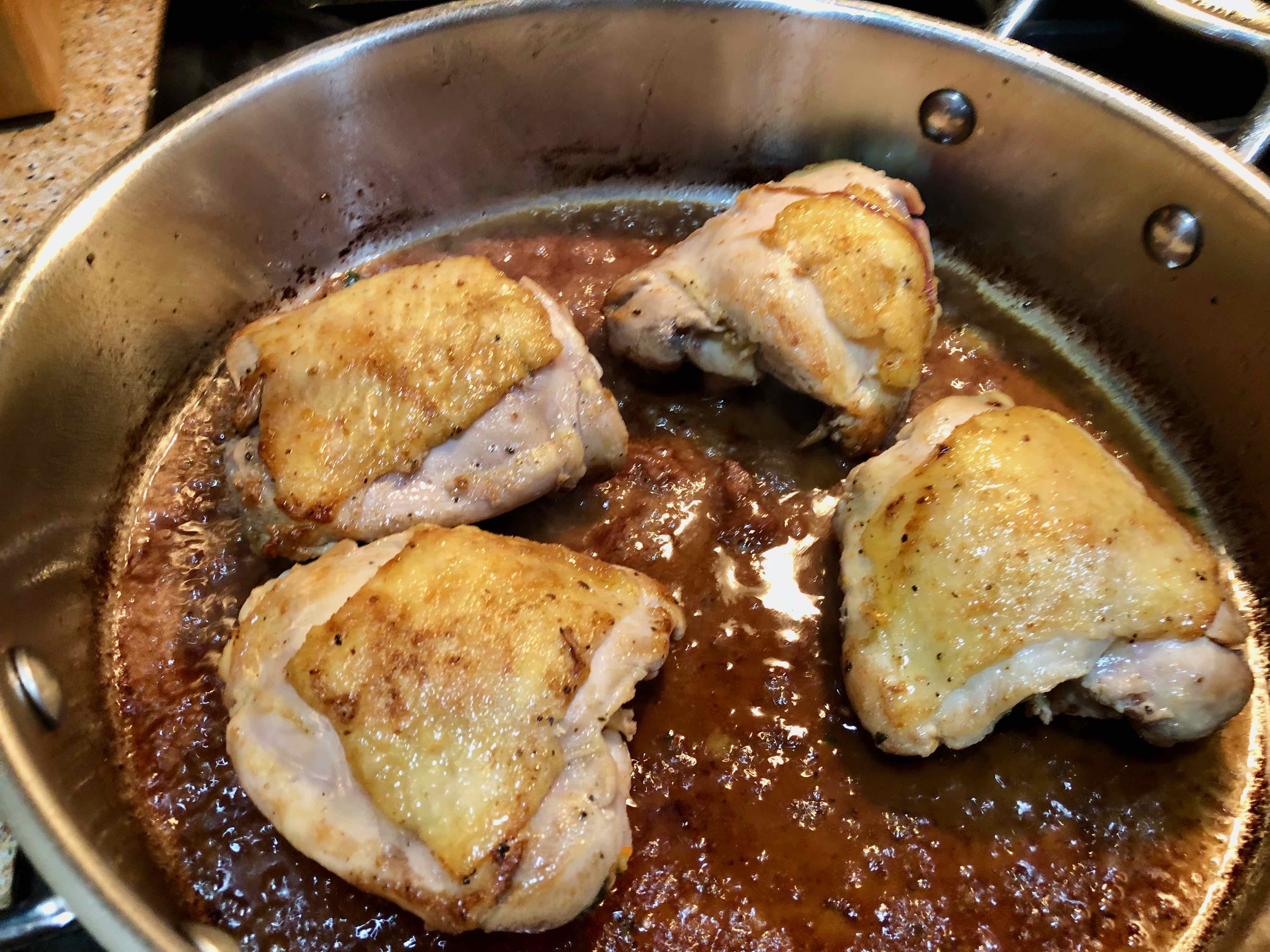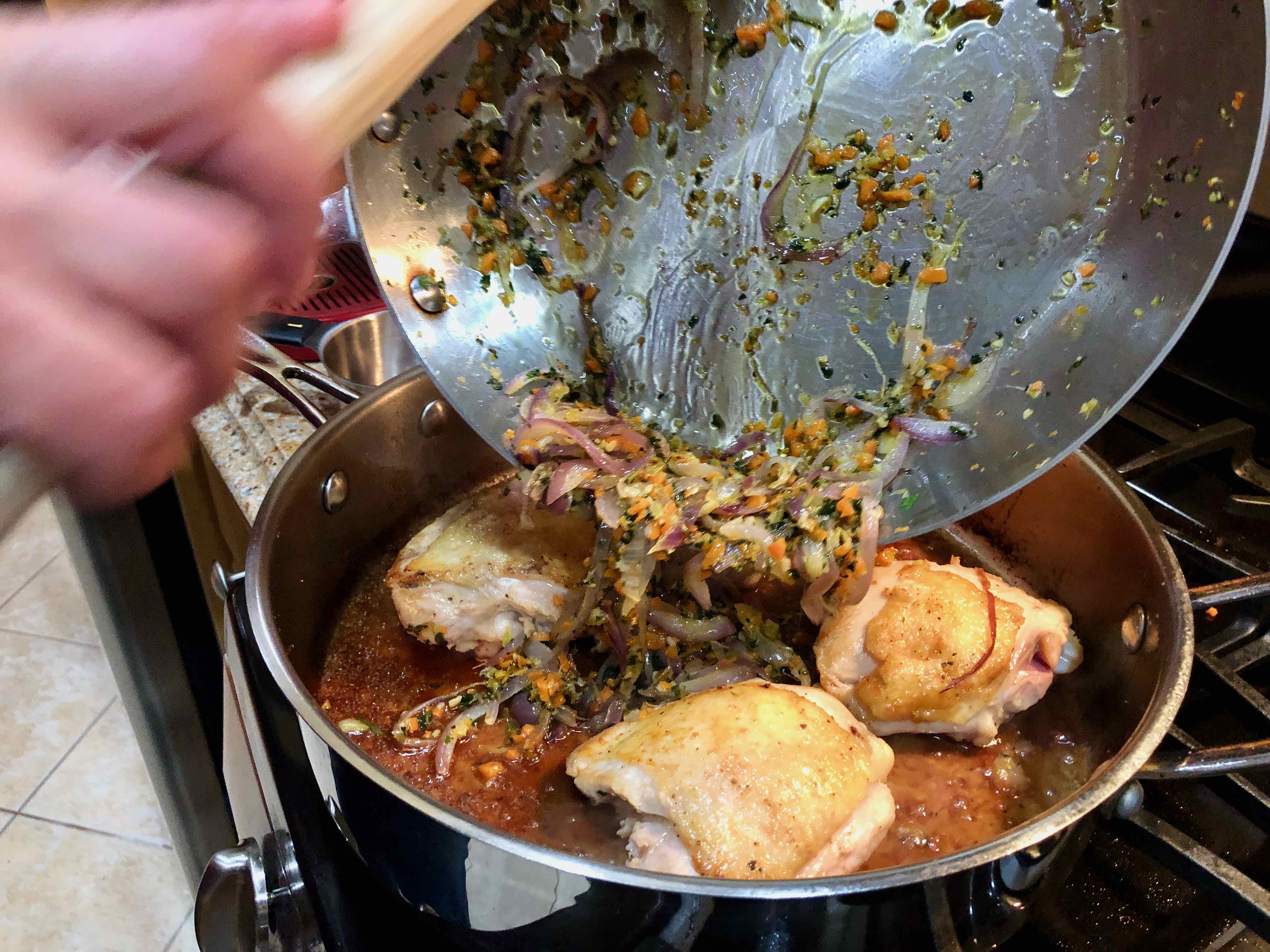 My only real complaint about the recipe is its failure to introduce any salt and pepper until just before serving. In my adaptation I seasoned the chicken before sautéing and also sprinkled the aromatics with salt when I started cooking them. I also thought that rubbing the chicken with the lemon juice might interfere with the browning of it, and so I chose to rub only the underside of the thighs, leaving the skin side dry. My only other departure from the recipe was substituting chicken thighs for a cut-up whole chicken.