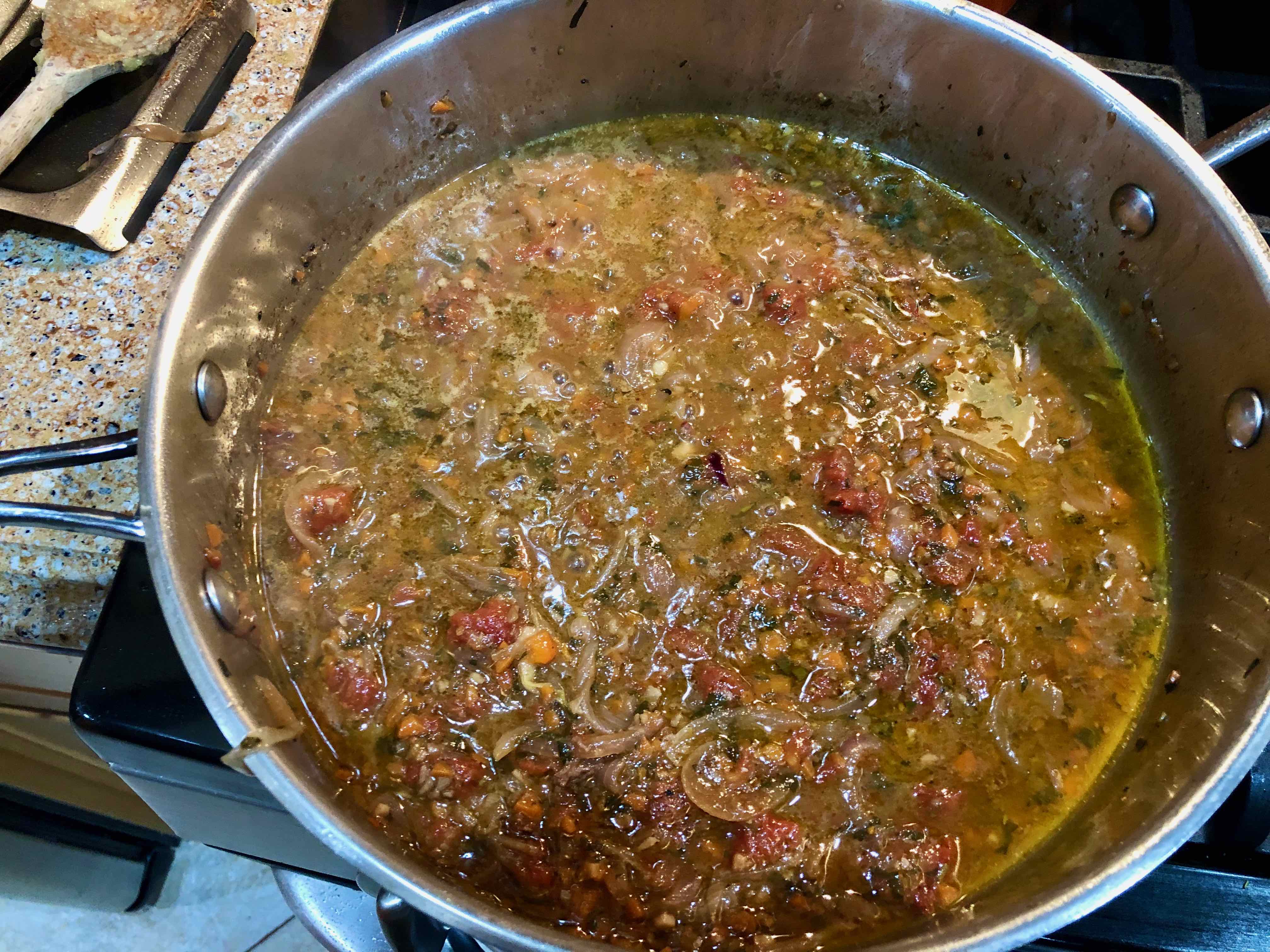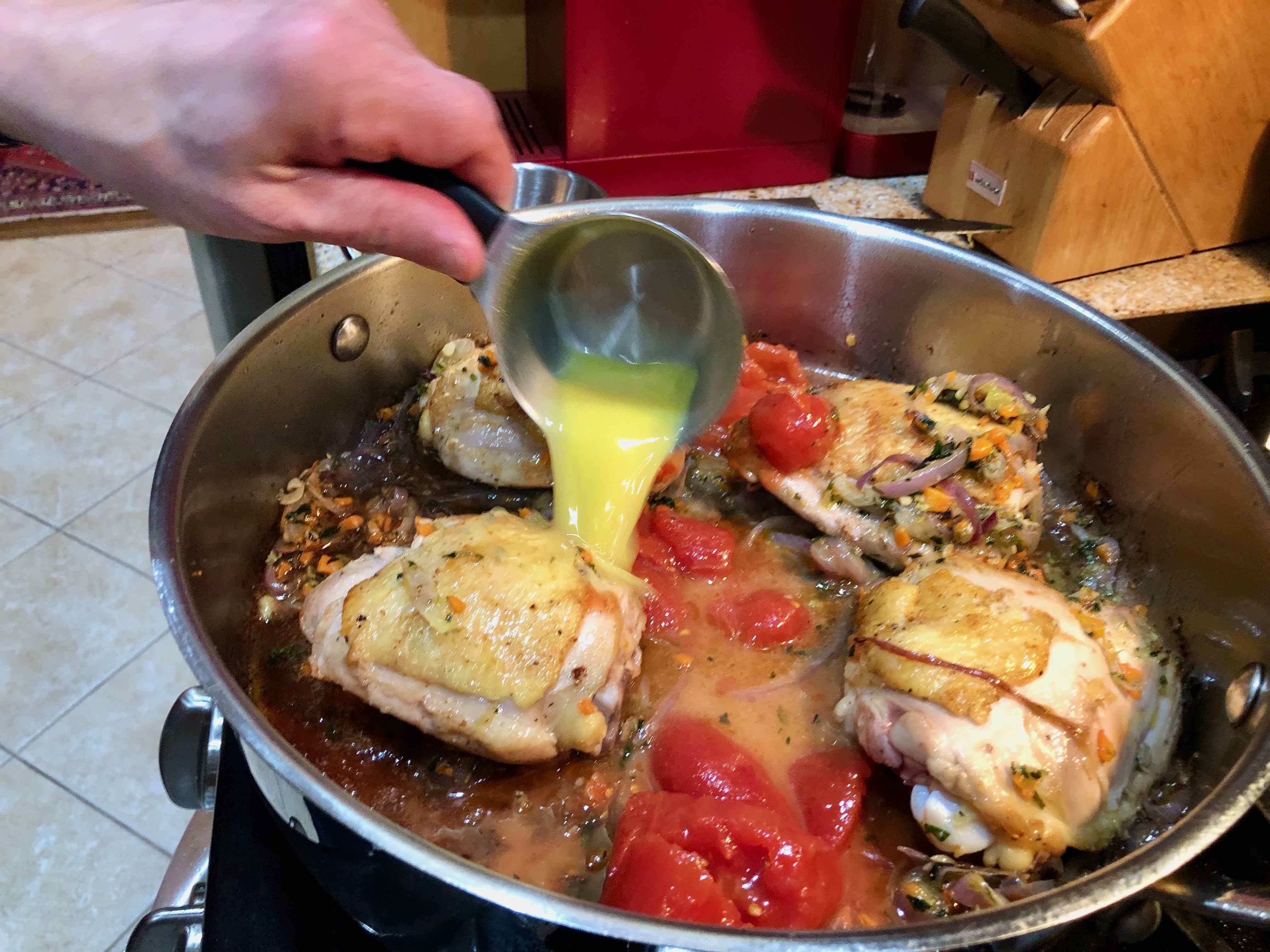 5. Transfer the onion mixture to the pan with the chicken pieces, stir in the tomatoes and broth, turn the heat to low, cover, and cook slowly for 25 to 30 minutes, or until the chicken is tender when pierces with the tip of the knife.