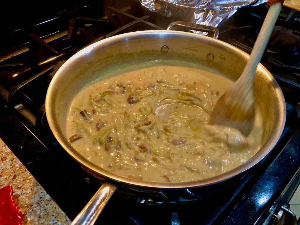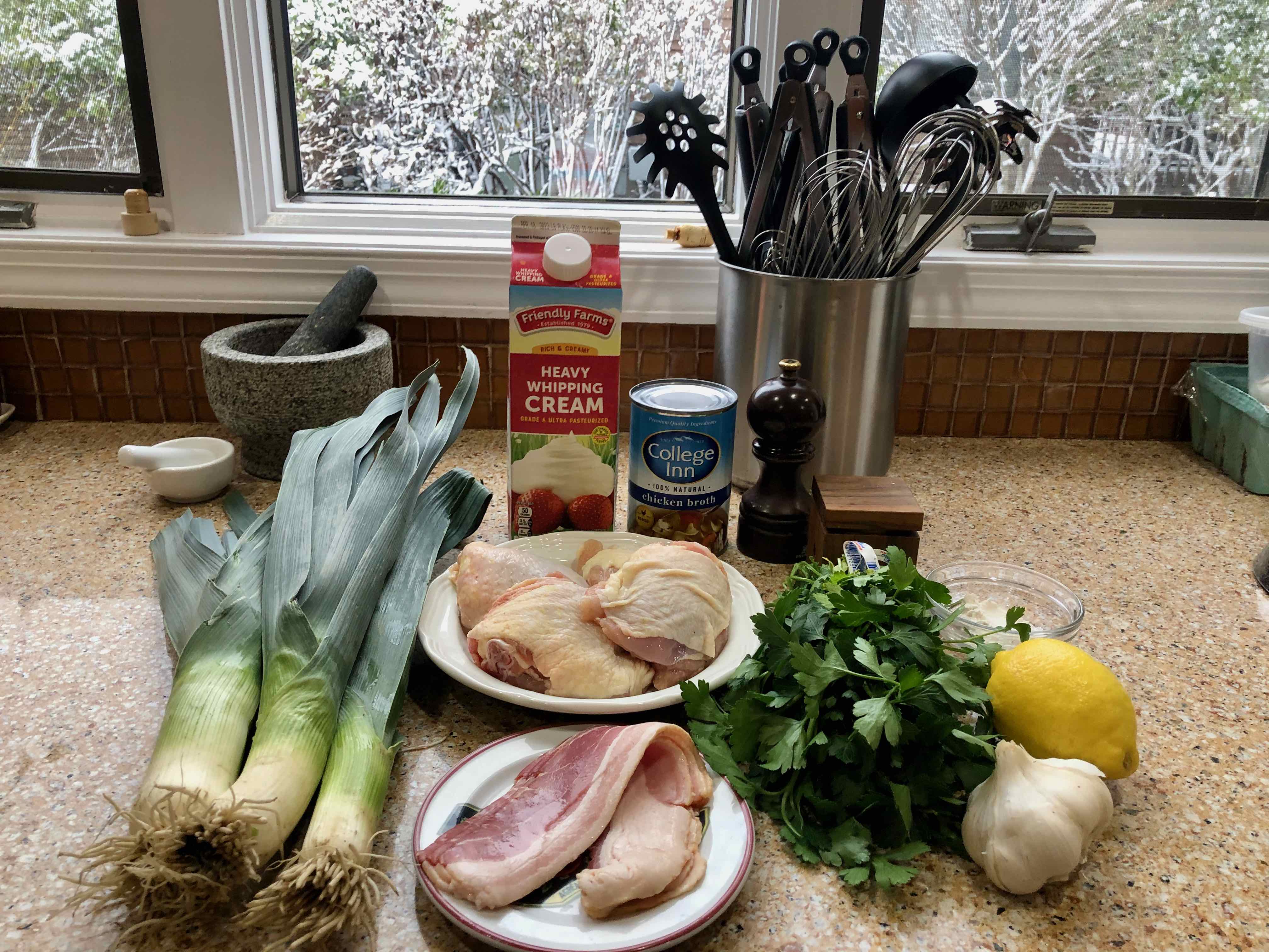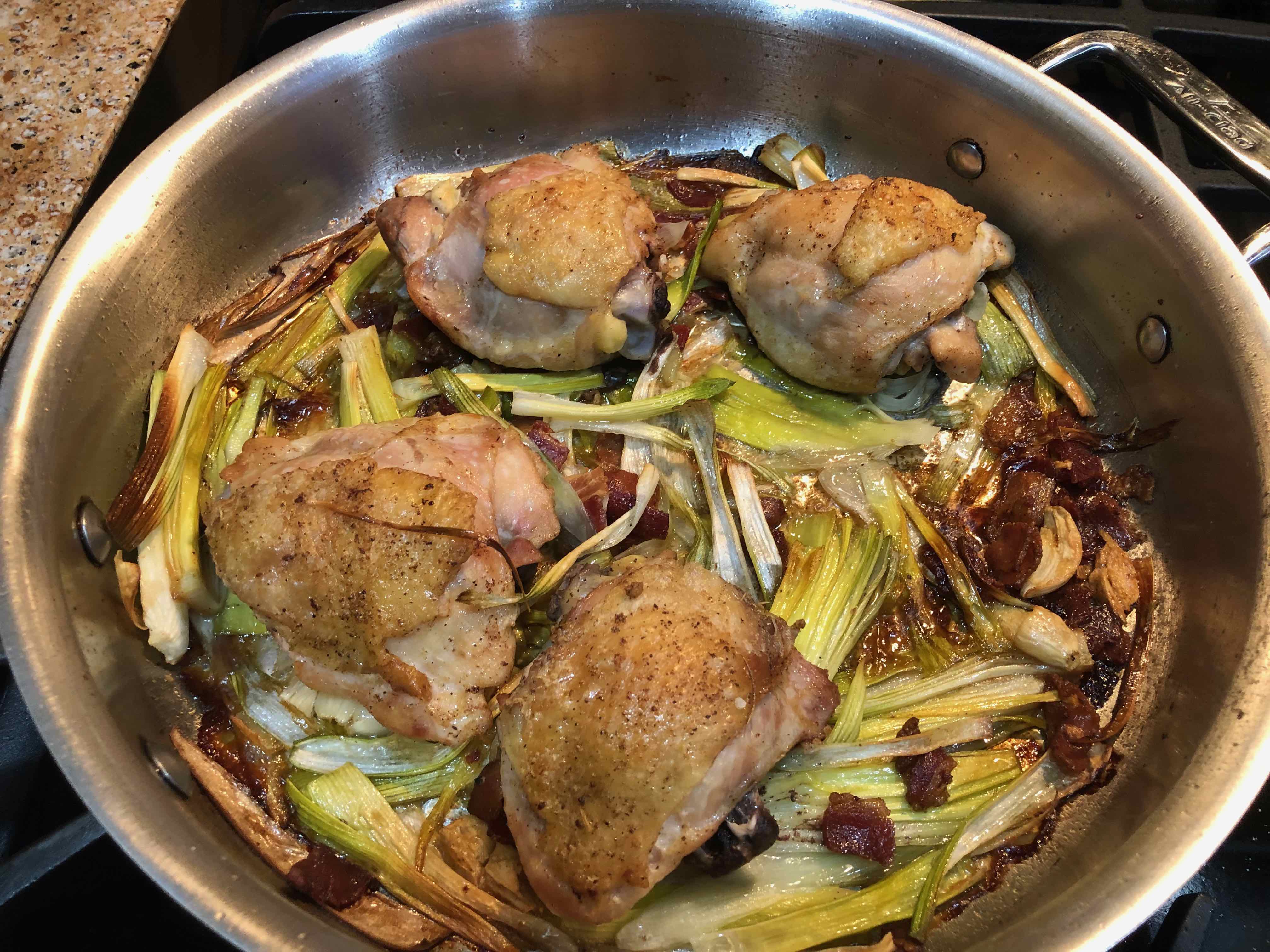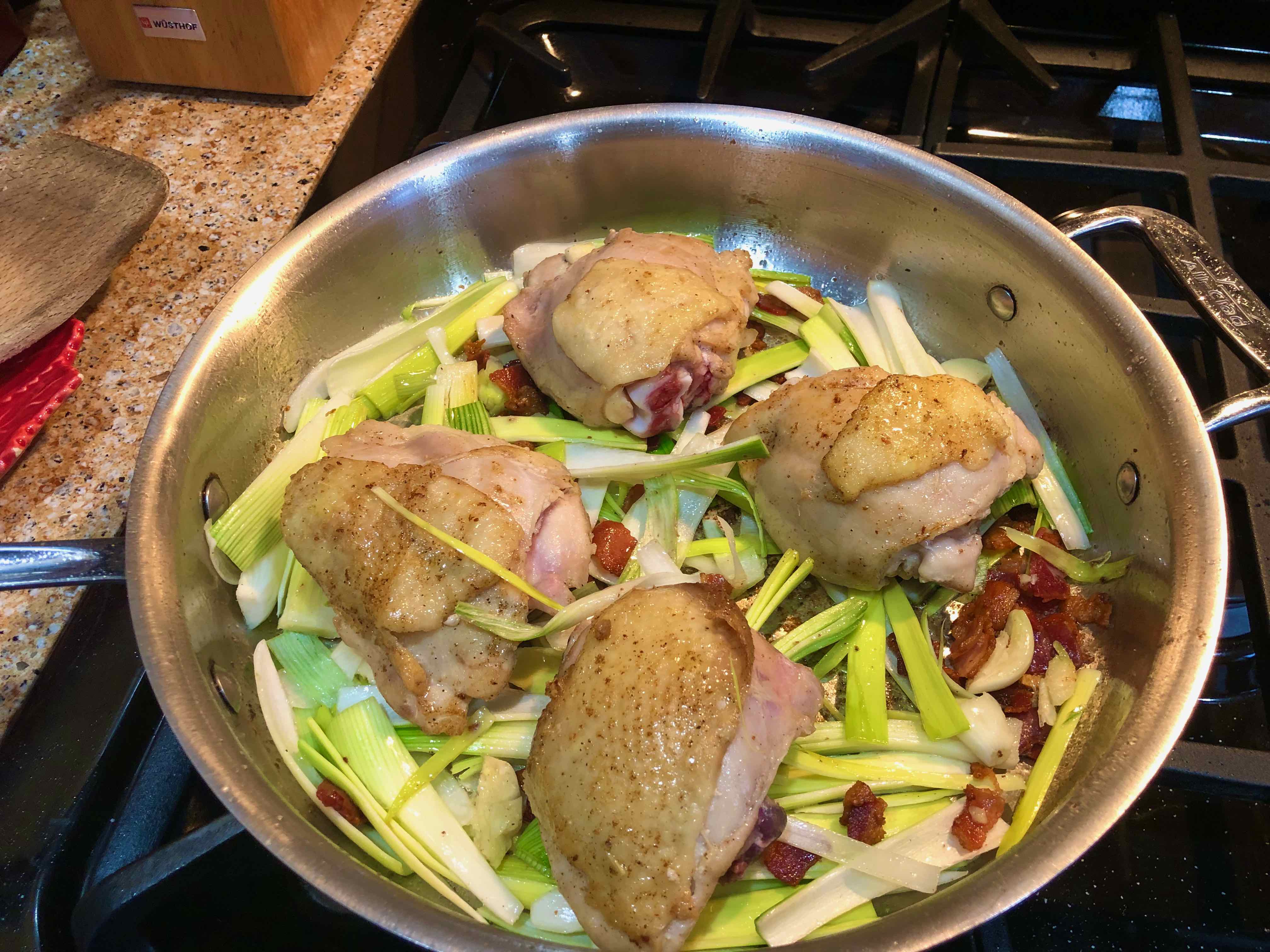 Housebound by the weather, I looked through my cookbooks for other leek recipes but most that I found used a single leek and I had five on hand. I then turned to the web, where I found a recipe that called for three and for which I had almost all the other ingredients on hand except for drumsticks and half-and half, for which I respectively substituted thighs and heavy cream: Pan Roasted Chicken with Leeks.