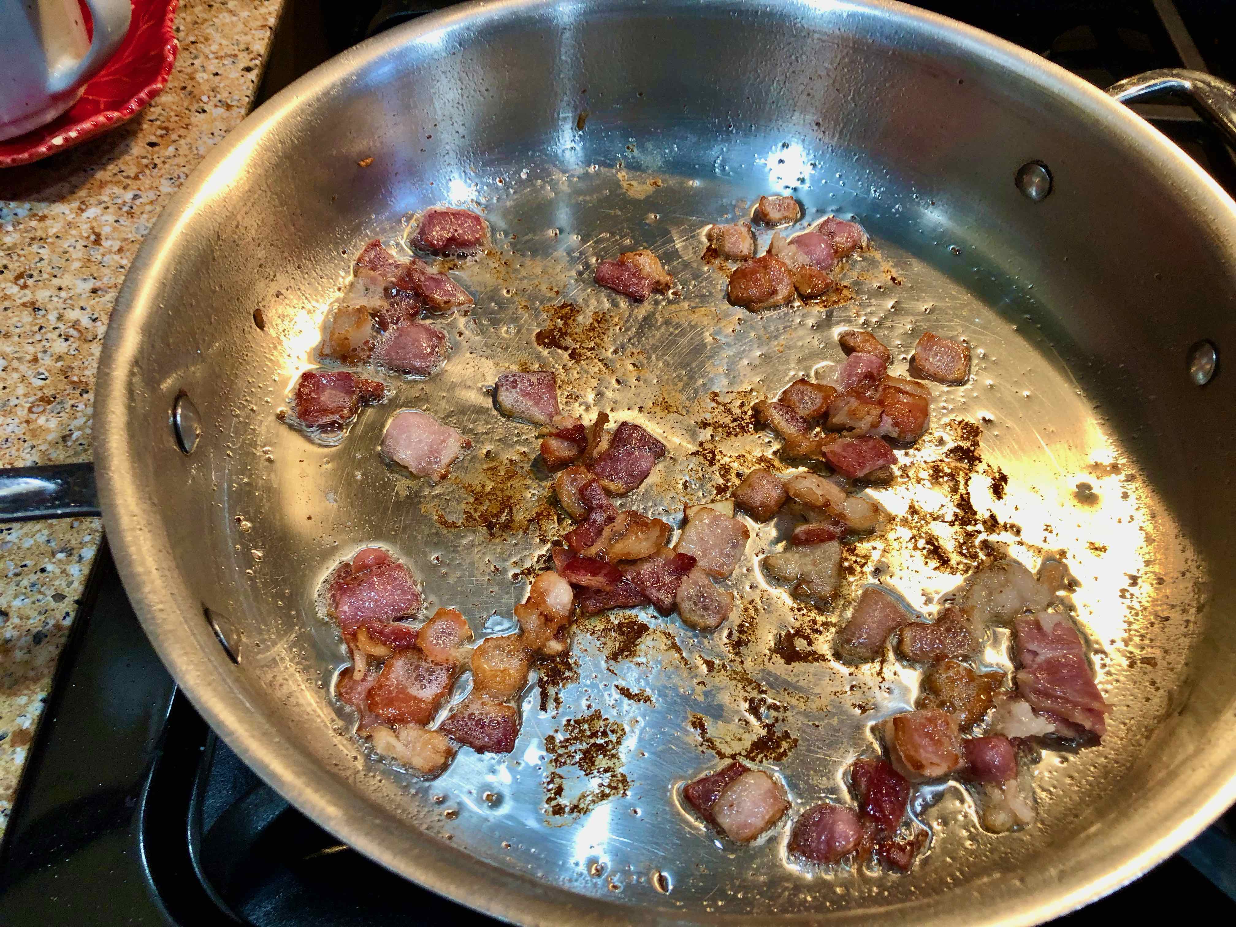 2. Put the bacon in a large heavy-bottomed ovenproof skillet and cook over medium-high heat until some of the fat renders, about 5 minutes.