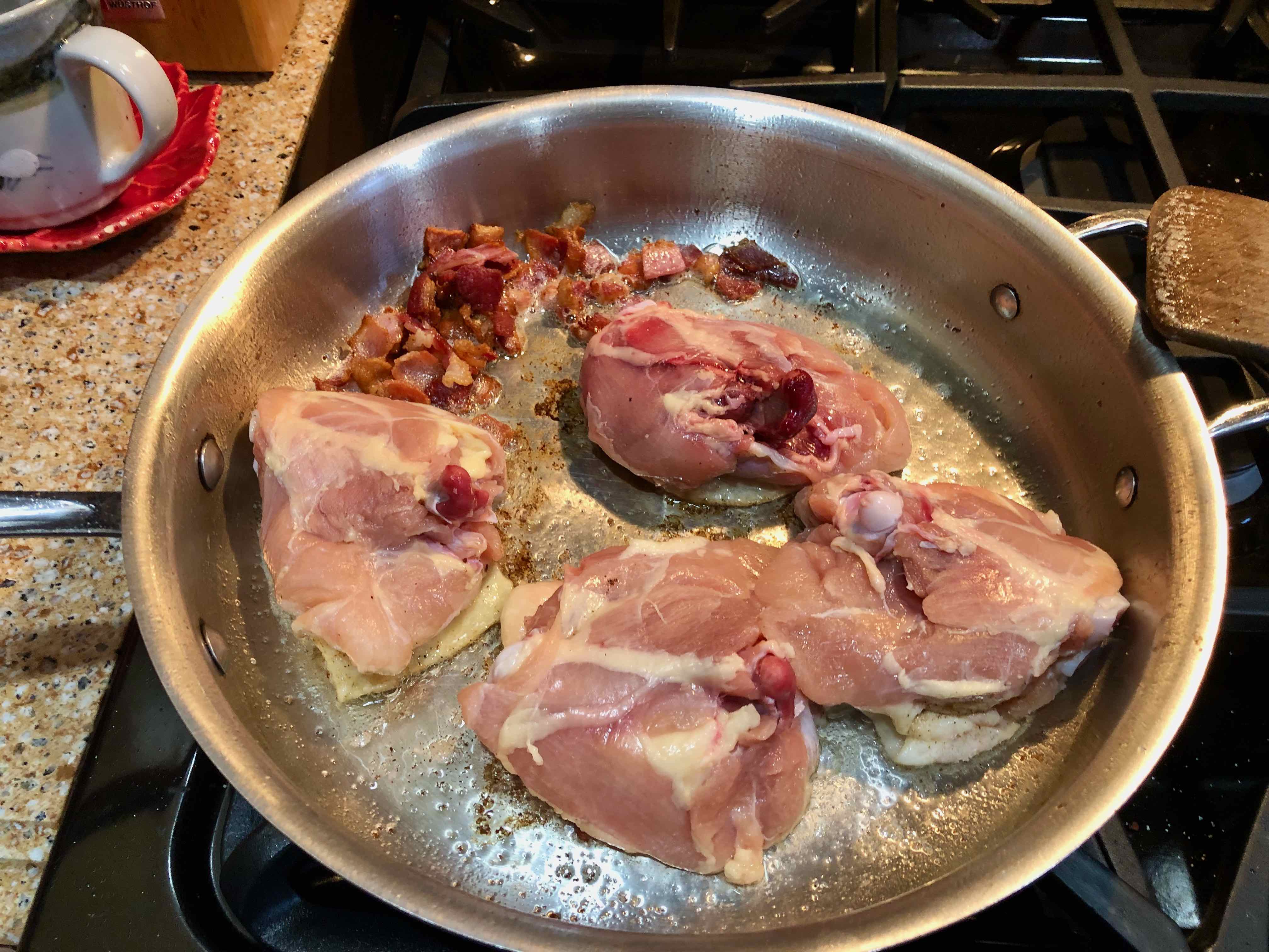 3. Push the bacon to the side of the pan. Season the chicken with salt and pepper, then add it to the pan skin side down and cook, turning, until it starts to brown, about 5 minutes.