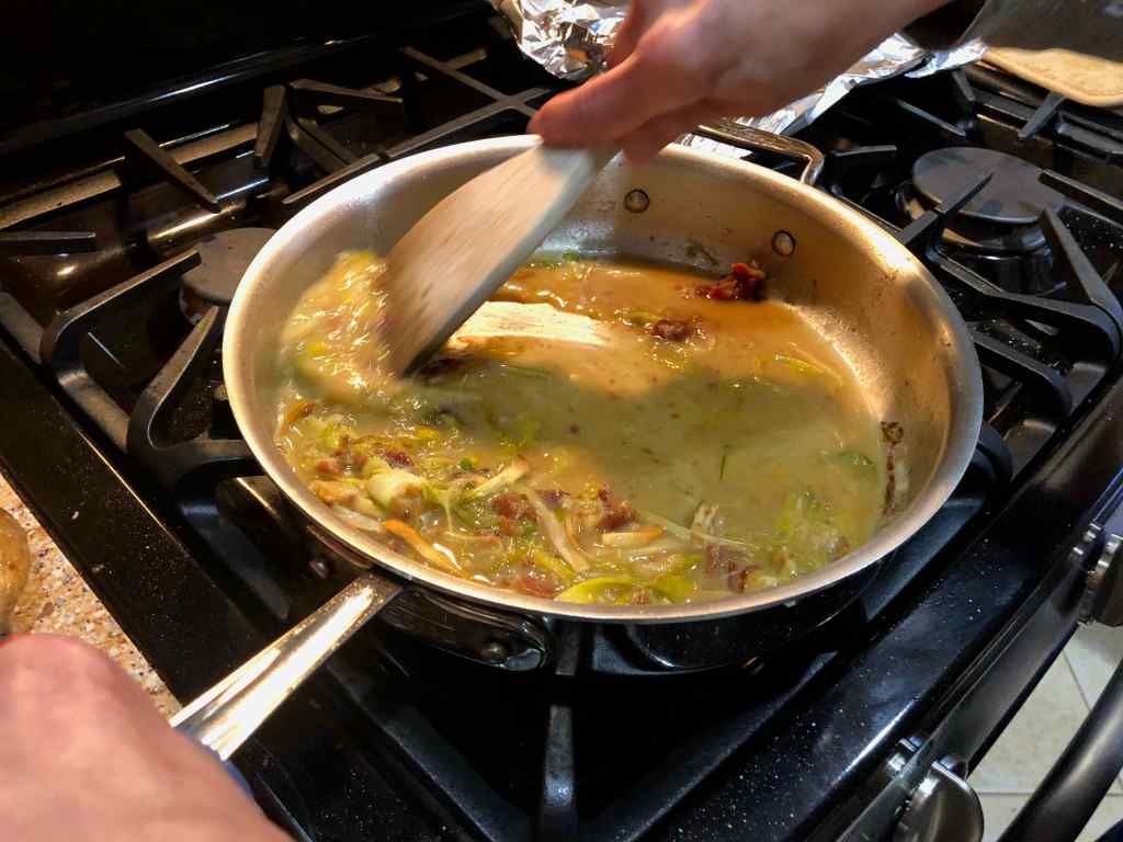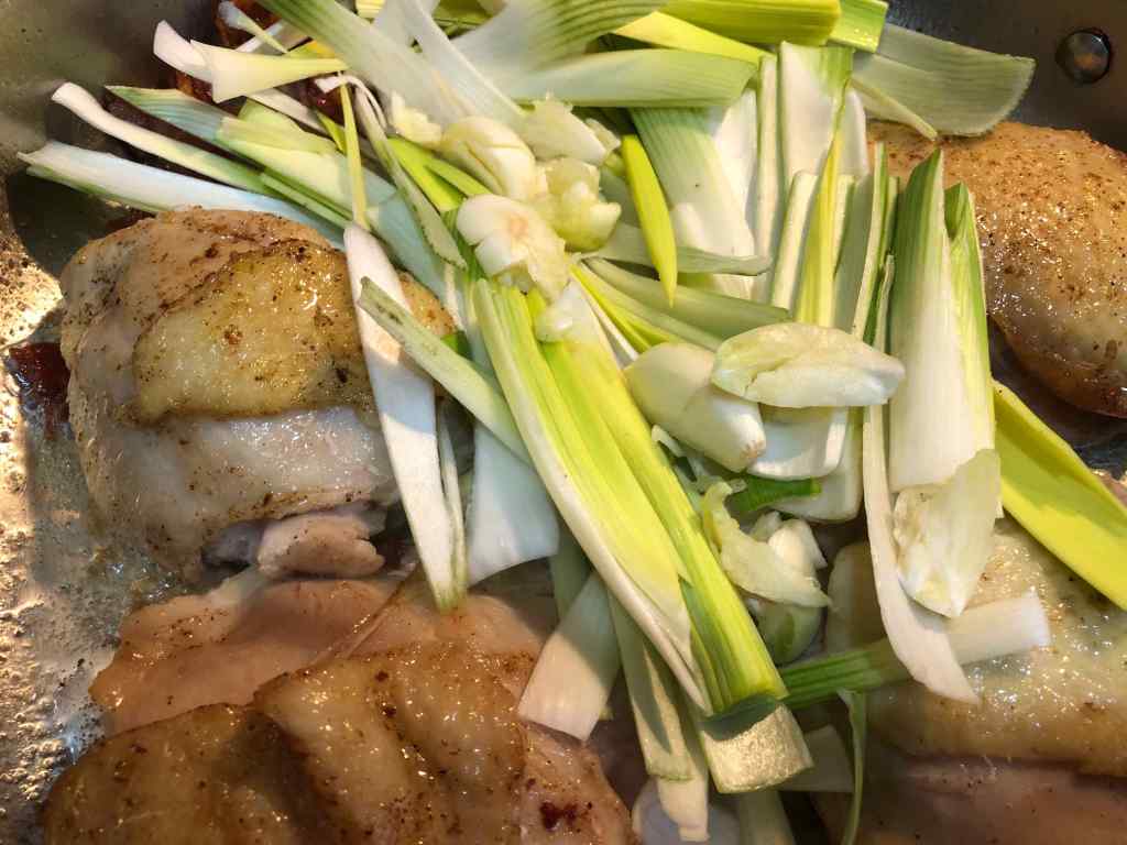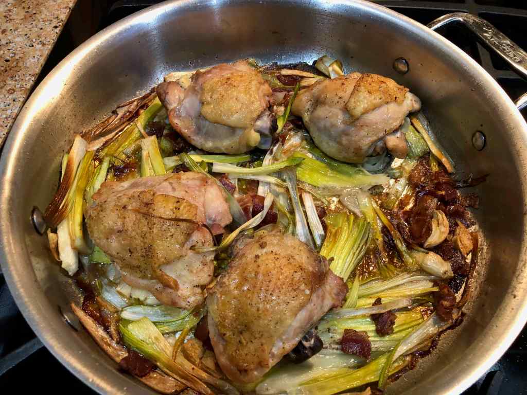 4. Stir in the leeks and scrape the bottom of the pan loosening any brown bits. Stir in the garlic, and then arrange the chicken on top of the bacon-leek mixture.