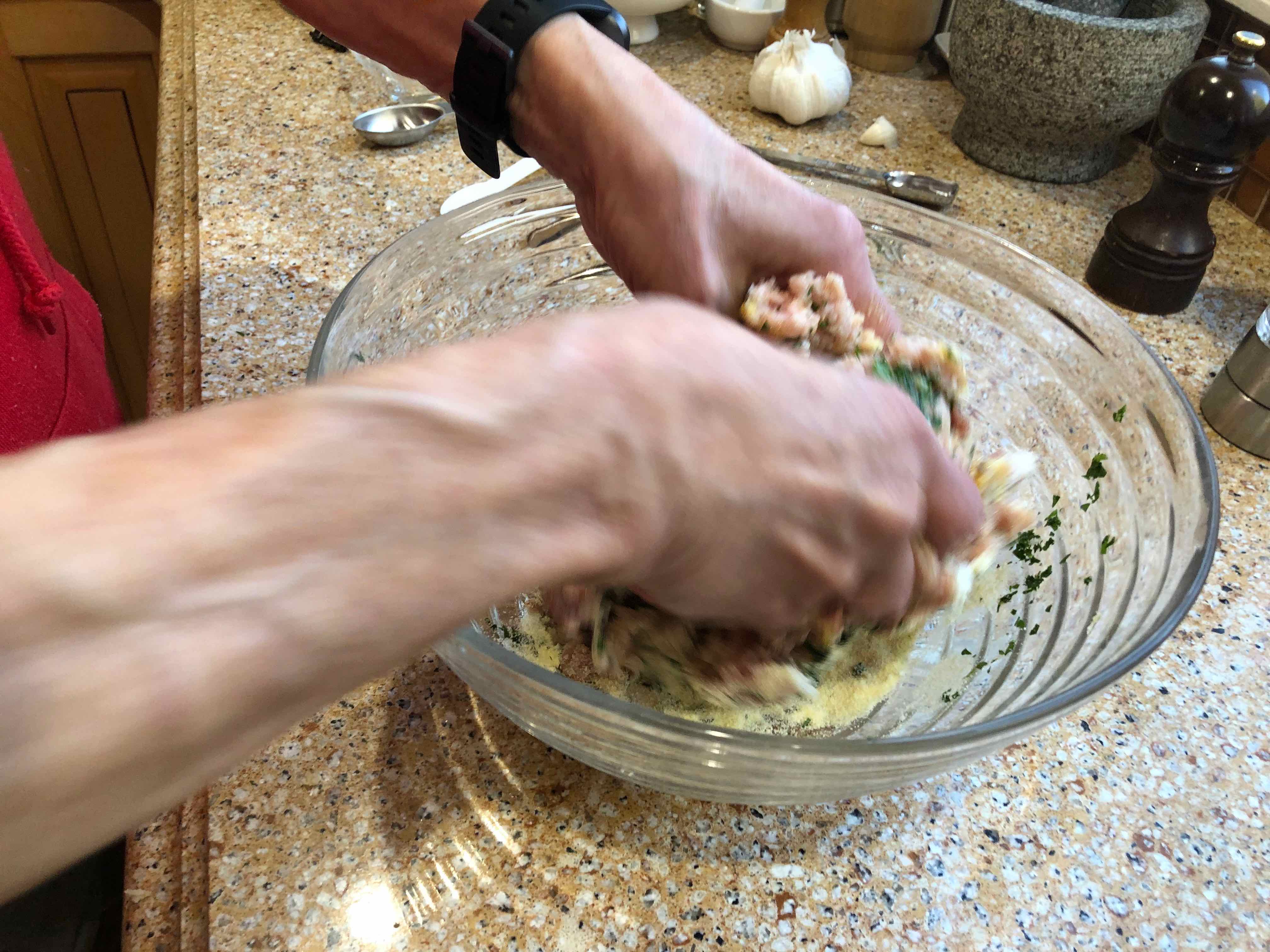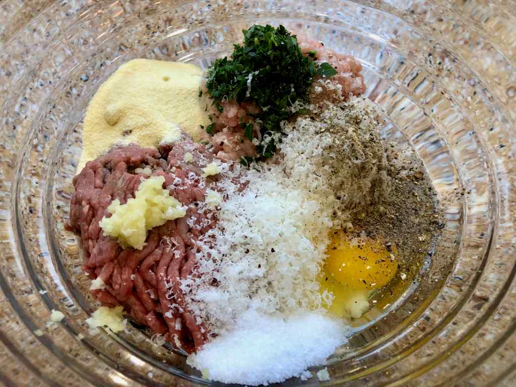 1. Just put everything in a large bowl and then, using your hands, mix to combine before shaping into small balls. (The balls should be slightly larger than a cherry tomato. At that size, you should have approximately 30 meatballs.)