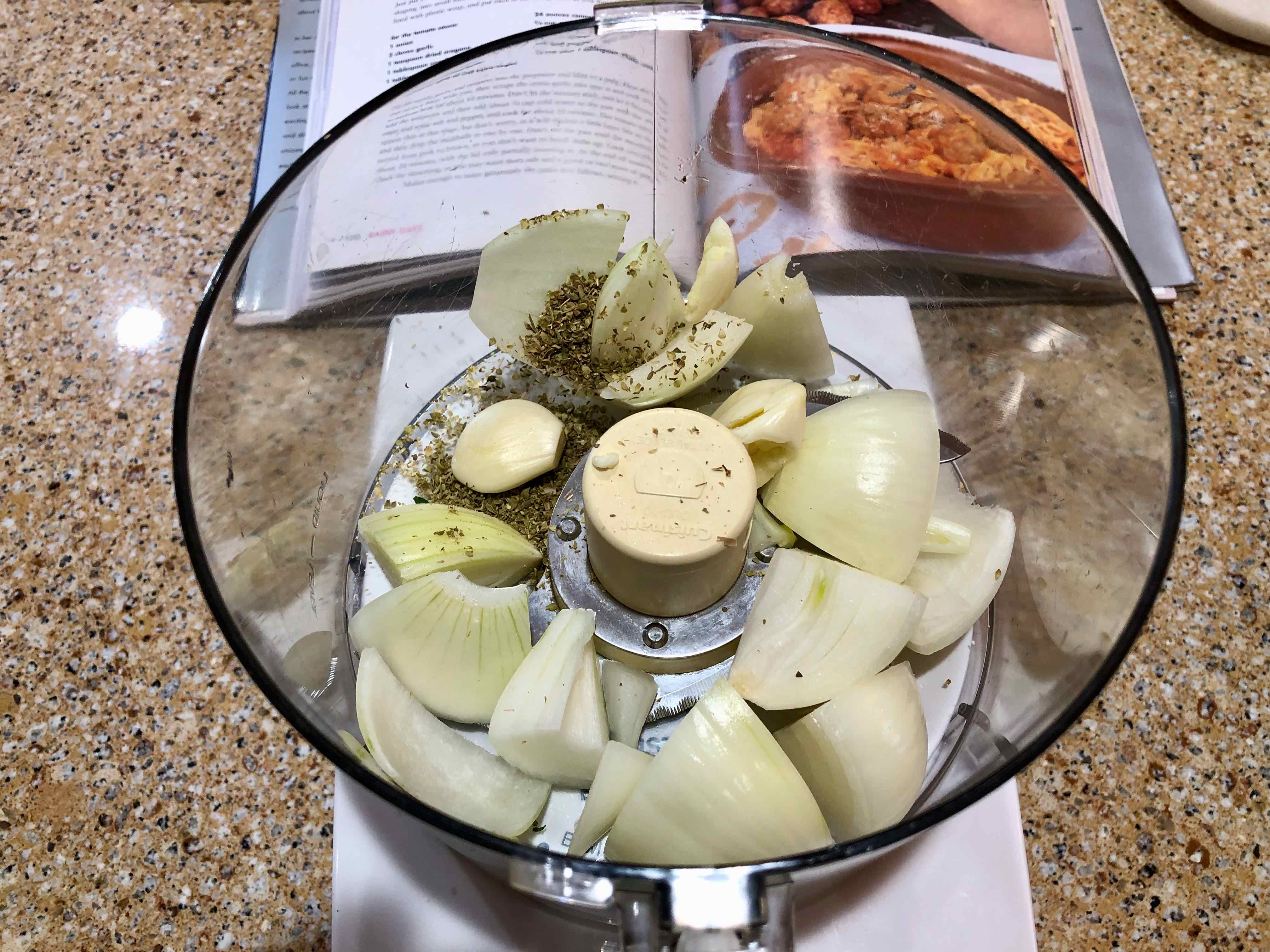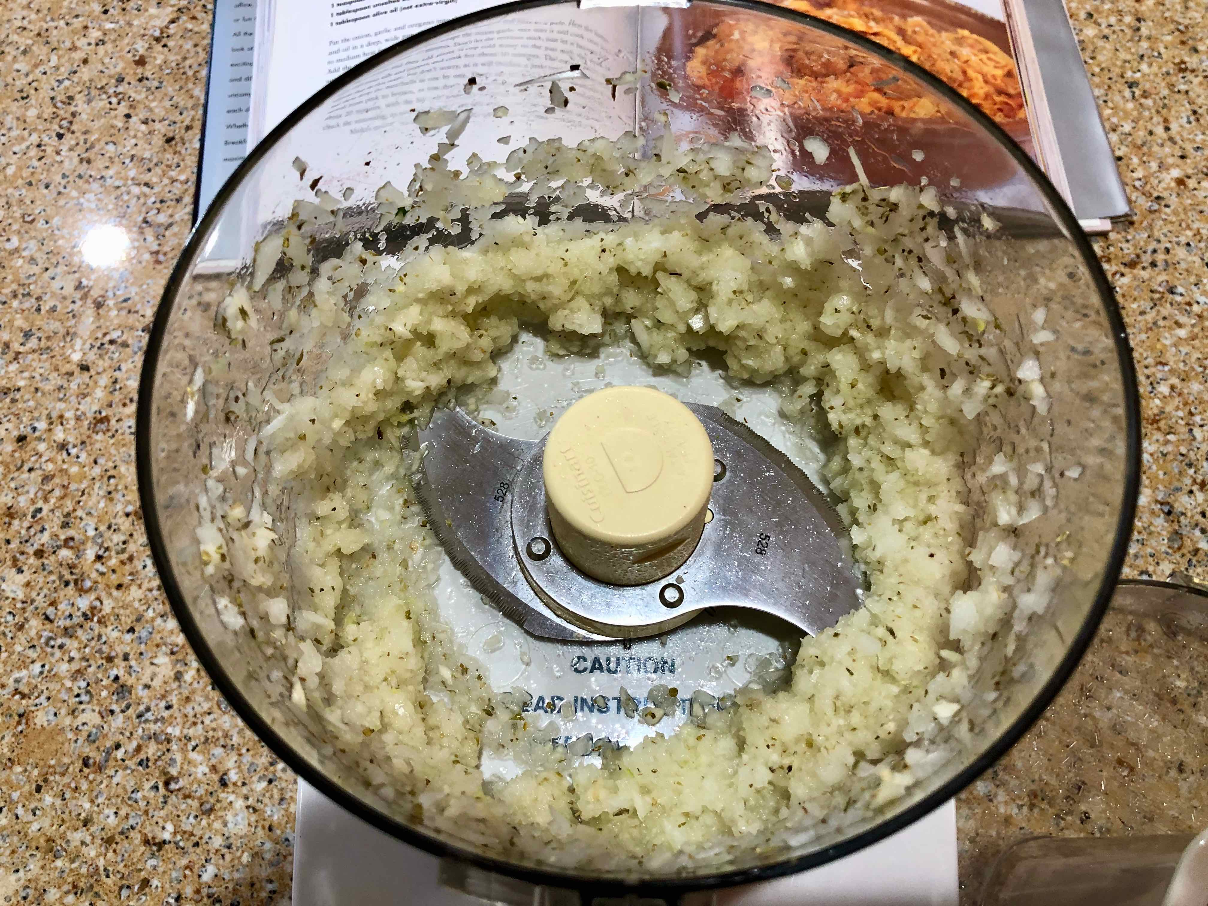 1. Put the onion, garlic and oregano into the processor and blitz to a pulp.