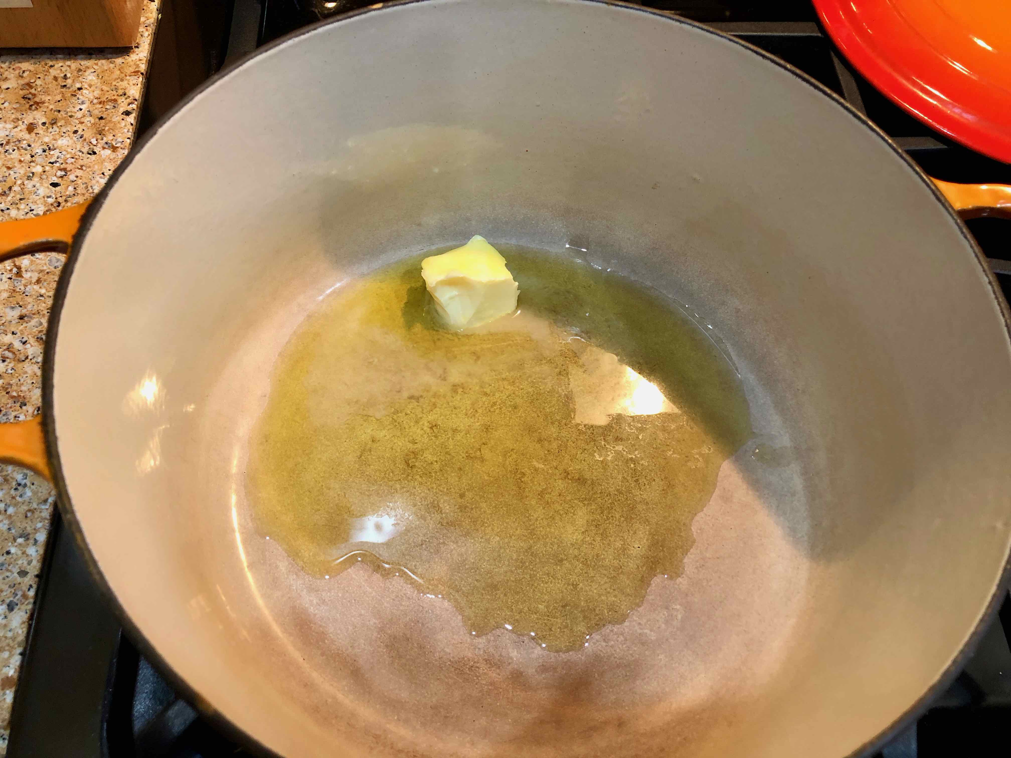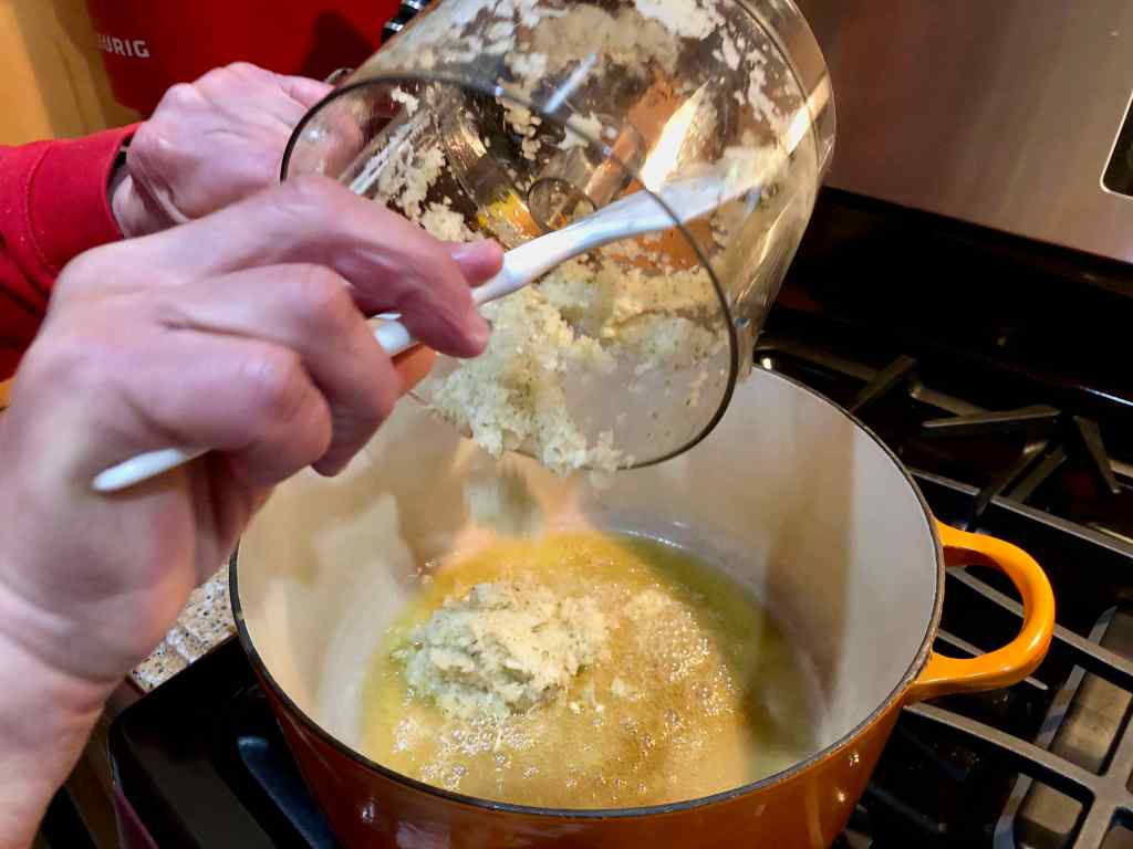 2. Heat the butter and oil in a deep, wide pan, then scrape the onion-garlic mix into it and cook over low to medium heat for about 10 minutes. Don’t let the mixture stick to the pot, just let it become soft.