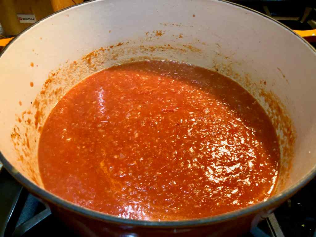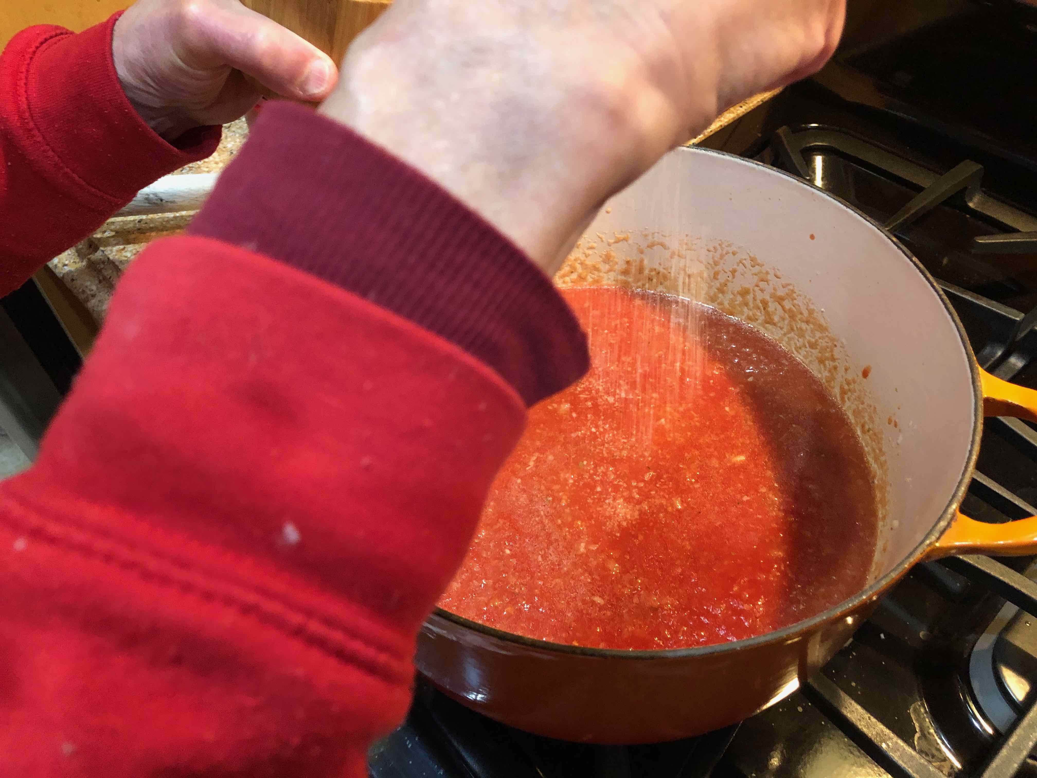 4. Add the water to the pan with the pinch of sugar and some salt and pepper, and cook for about 10 minutes. The tomato sauce will appear thin at this stage, but don’t worry as it will thicken a little later. (I omitted the sugar.)