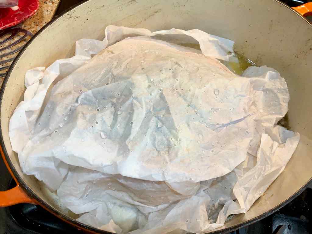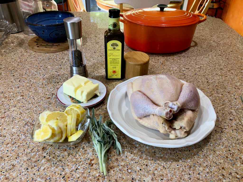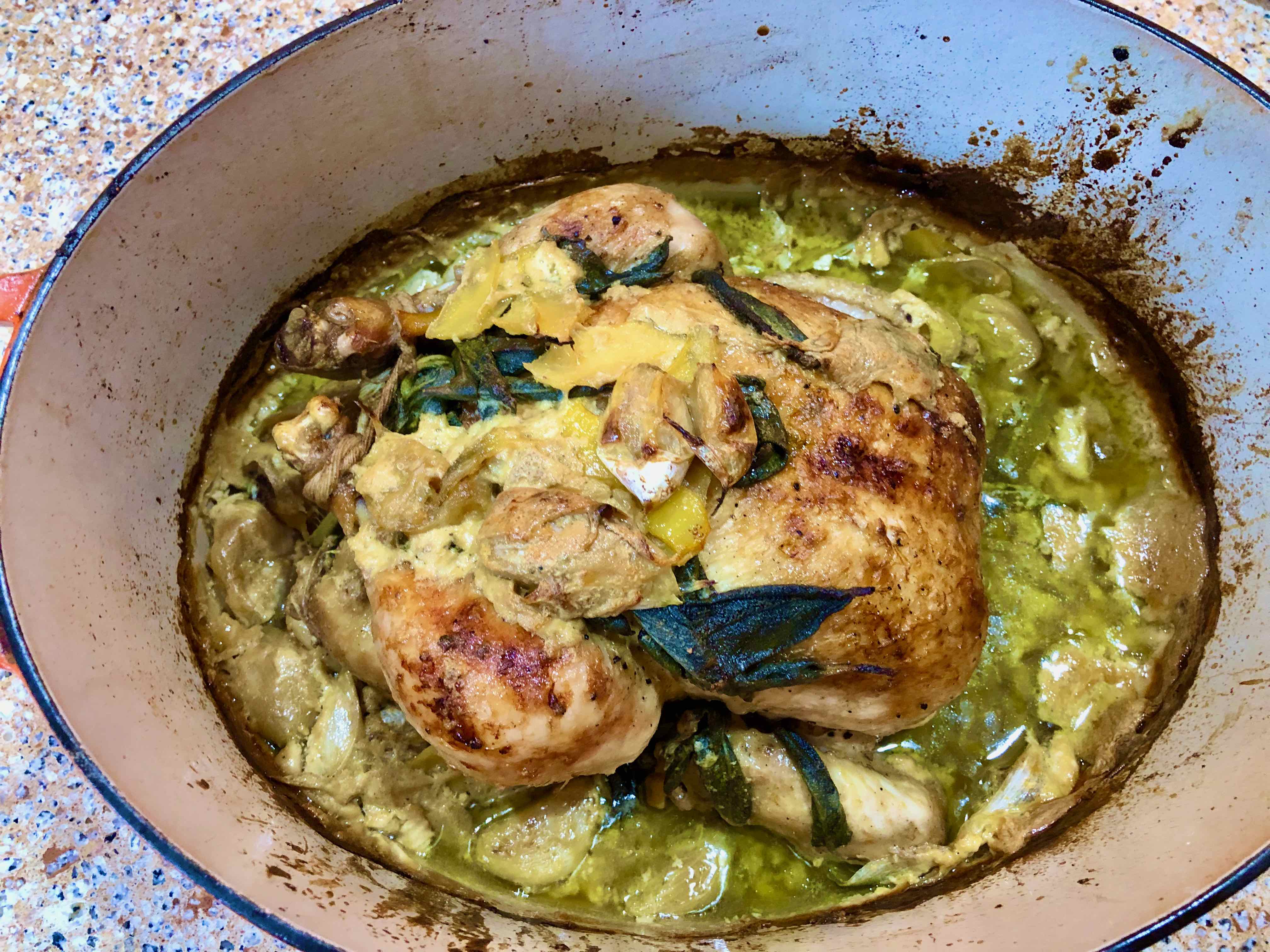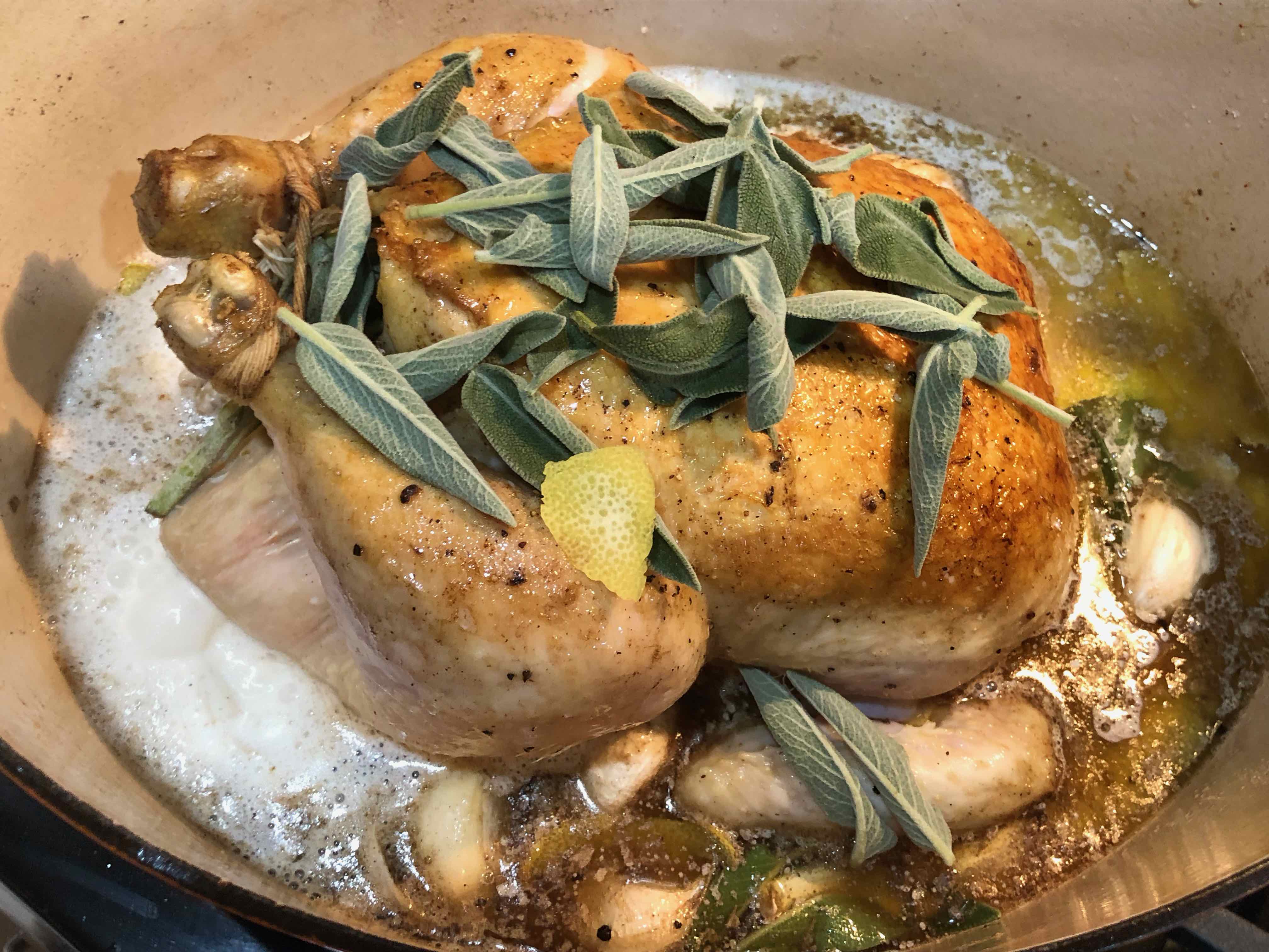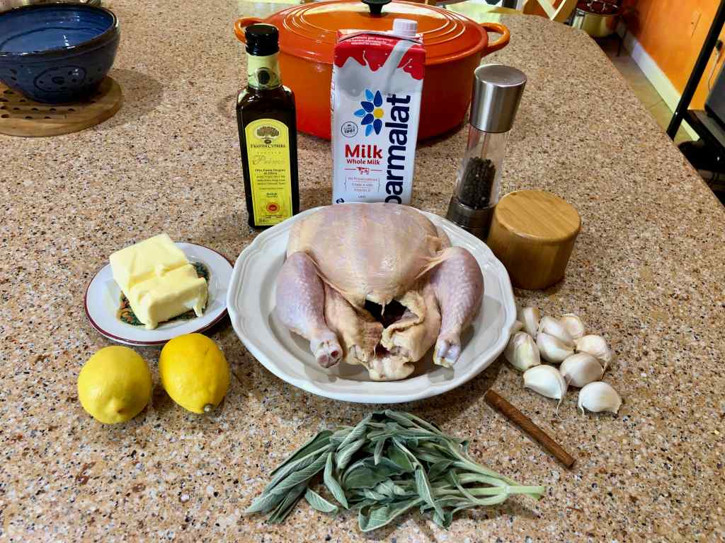 After reading the recipe a second time, however, I started to page through its “Cooking Notes” submitted by readers. Three of them caught my interest. One reader who had prepared the dish several times found that she achieved the best result by using shelf-stable milk like Parmalat. Another contributor cited a German video of Jamie making the dish where he was doing things differently from the Times’ adaption, for example, cutting the lemons in thick slices whose peels are used for the sauce and stuffing them, along with the stems of the sage leaves that had been picked for the sauce. She also mentioned that he used considerably more butter. Scrolling through the rest of the notes, I eventually discovered the reader who initially mentioned the above-cited video, provided a link to it (see below), and said that Jamie used wet parchment to cover the chicken to keep it moist while it cooked.