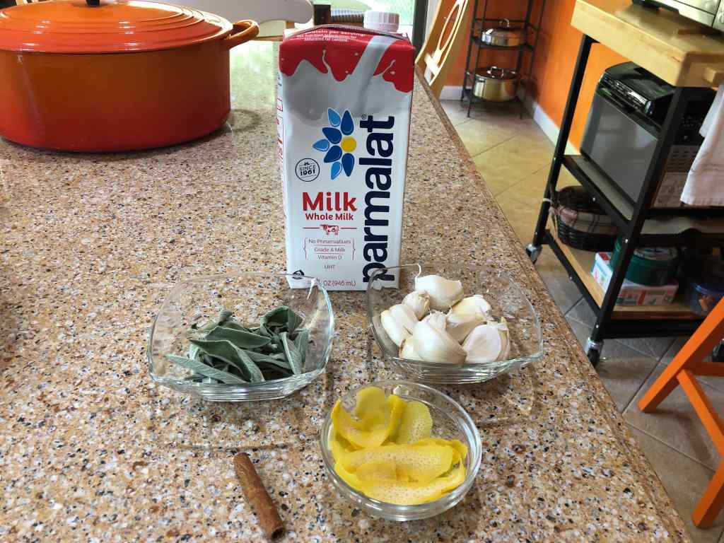 Chicken with sage leaves, lemon rinds, and milk