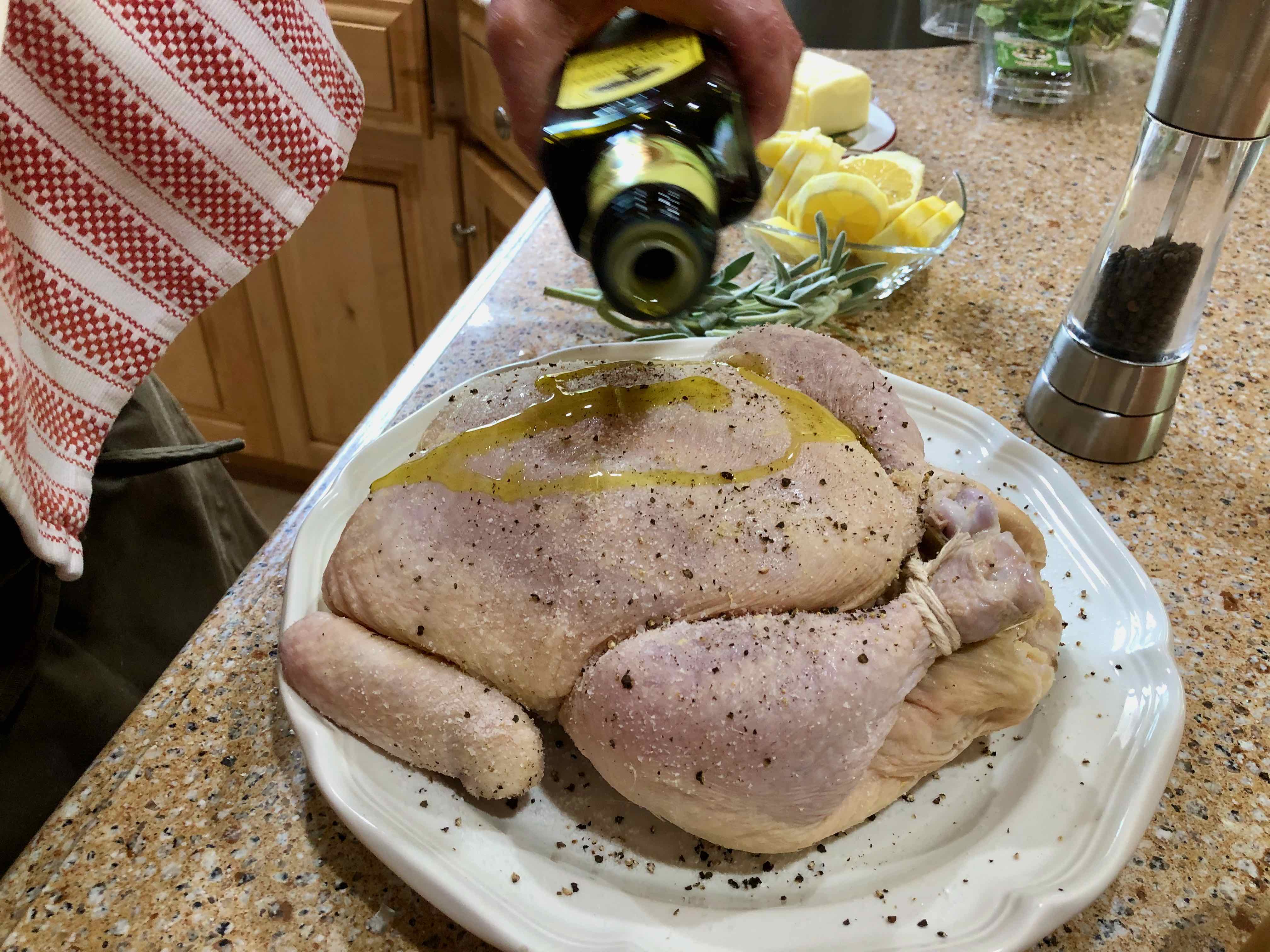 1. Heat oven to 375° F. Drizzle the chicken with some olive oil and then season it aggressively with the salt and pepper. Stuff the cavity with the lemon slices and the stems from the sage.