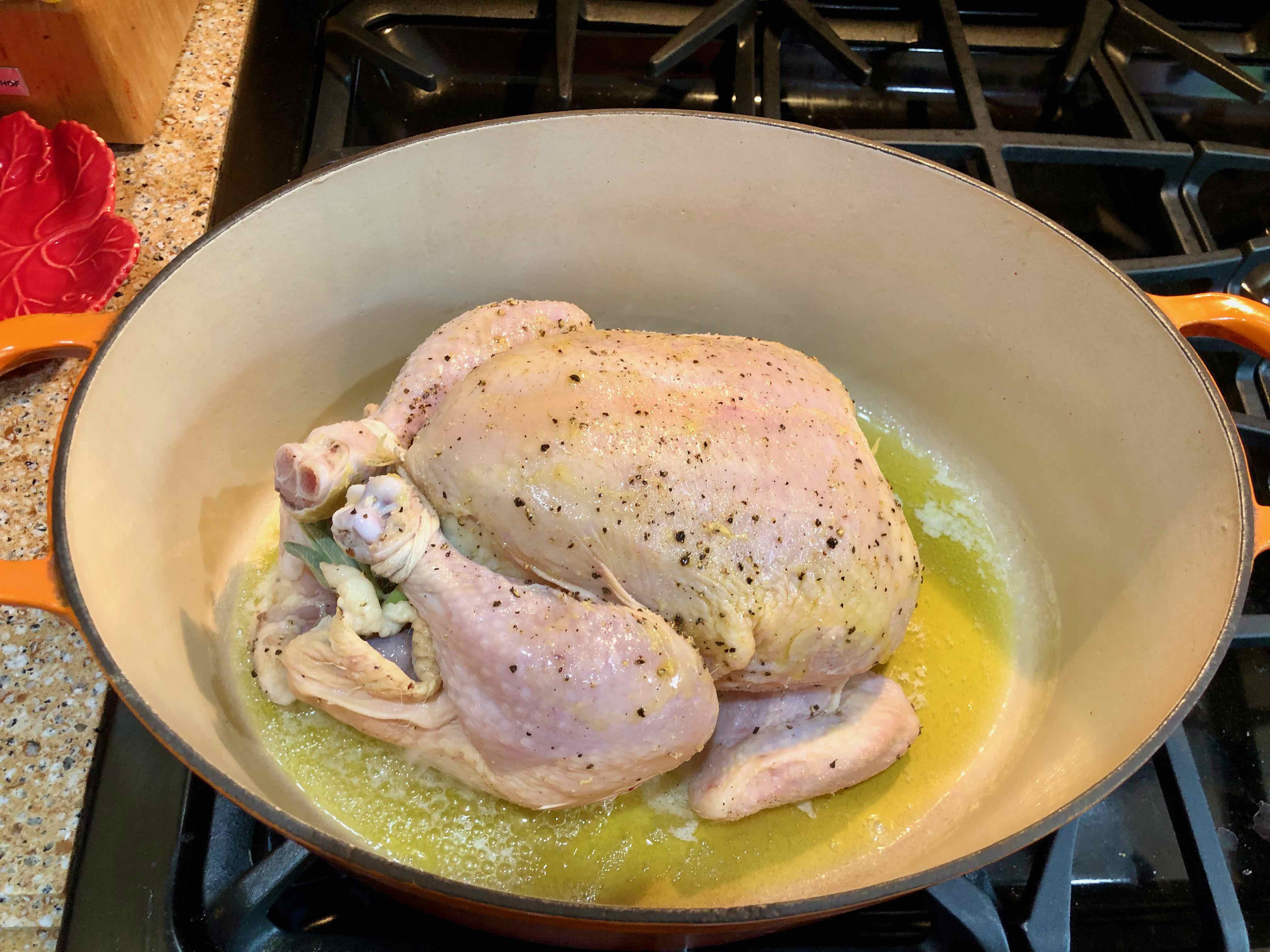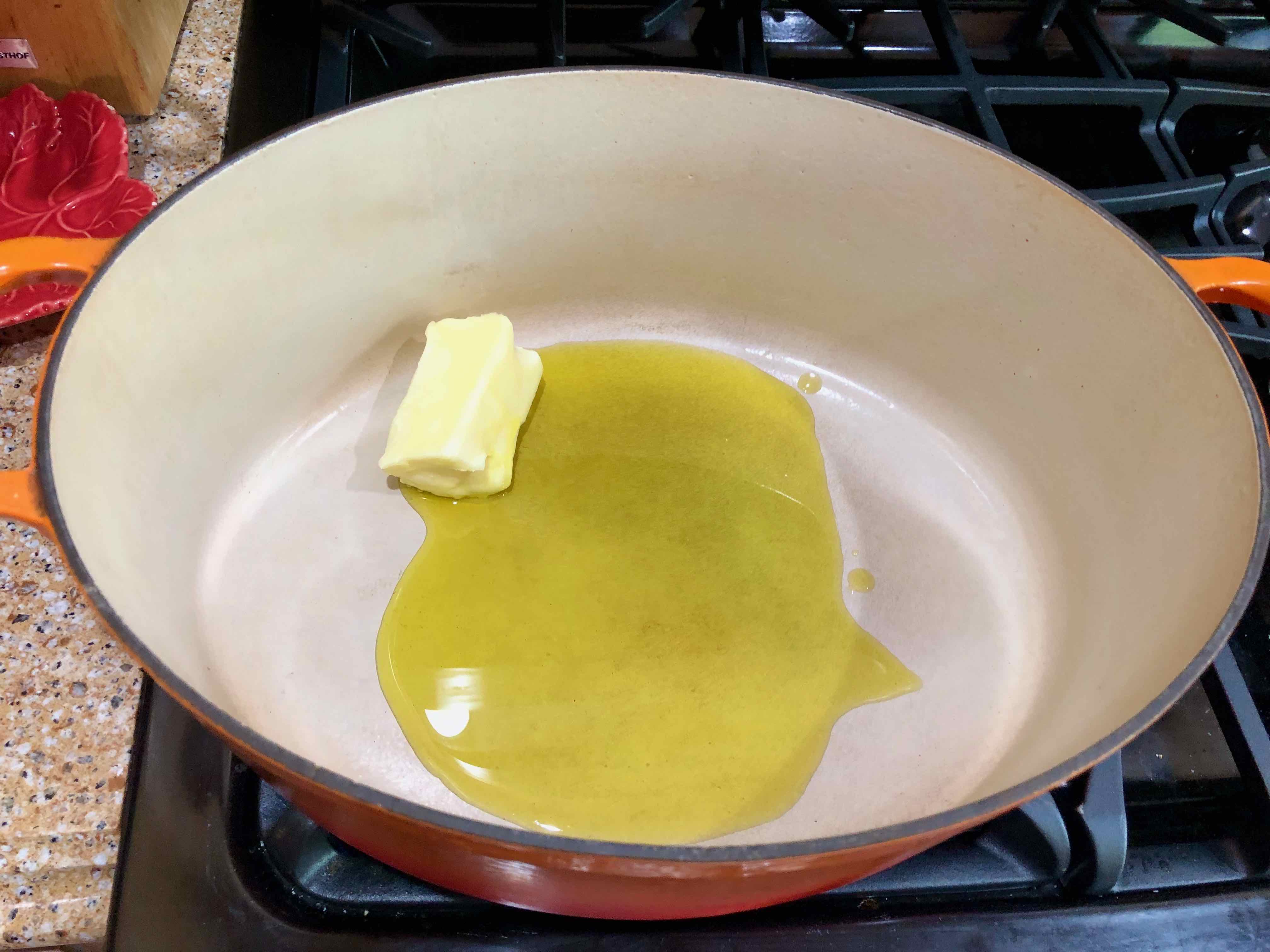 2. Place an oven-safe pot that will fit the chicken snugly over medium-high heat on the stove, and add the butter and olive oil. (I used an enameled cast-iron oval Dutch oven.)