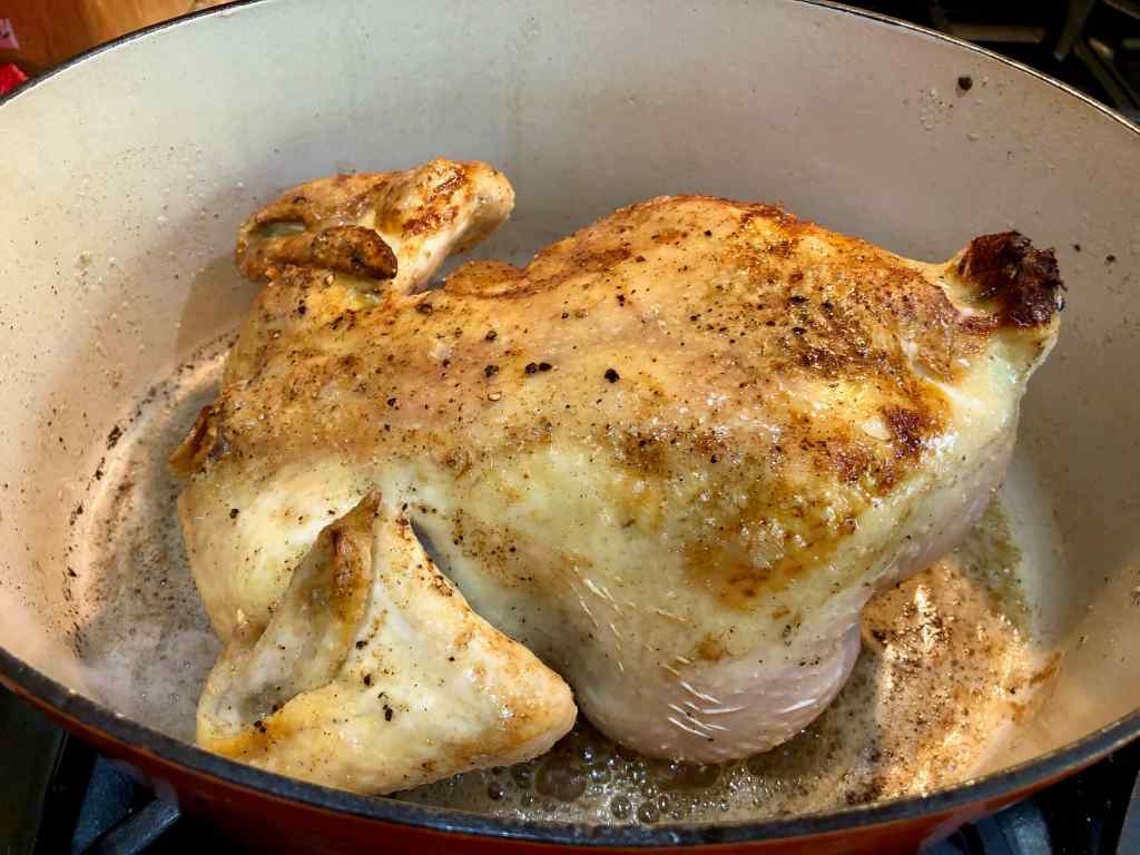 3. When the butter has melted and is starting to foam, add the chicken breast side up to the pot and fry it, turning every few minutes, until it has browned all over. Approximately 6 to 7 minutes a side.
