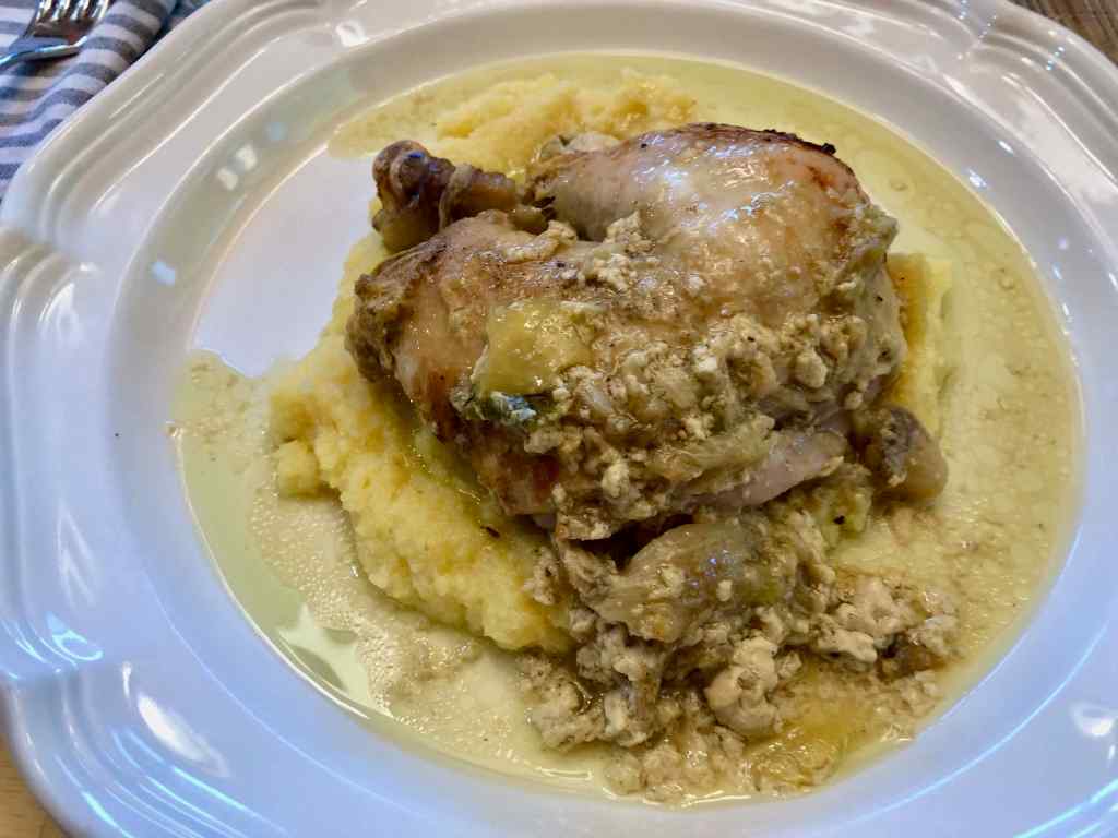 As Jamie did in the video, I served the chicken over creamy polenta and spooned the sauce with its tasty curds over it.