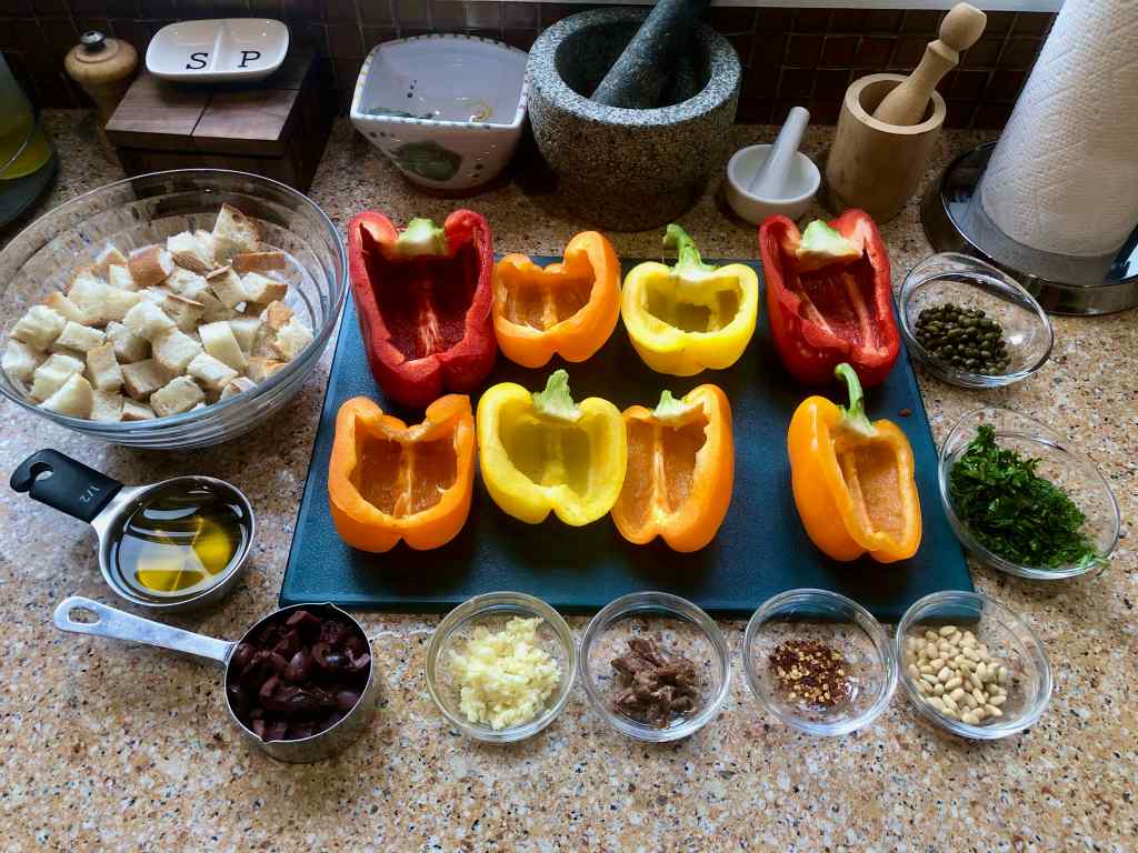 My Neapolitan aunt’s stuffed peppers were one of my favorite side dishes. Even at an early age, I relished their savory bread-crumb stuffing laced with anchovies, capers, garlic, and parsley. To date, however, I haven’t found a recipe to duplicate them. But when I came across one for Campania-style stuffed peppers in Arthur Schwartz’s Naples at Table, I thought I’d give them a shot.