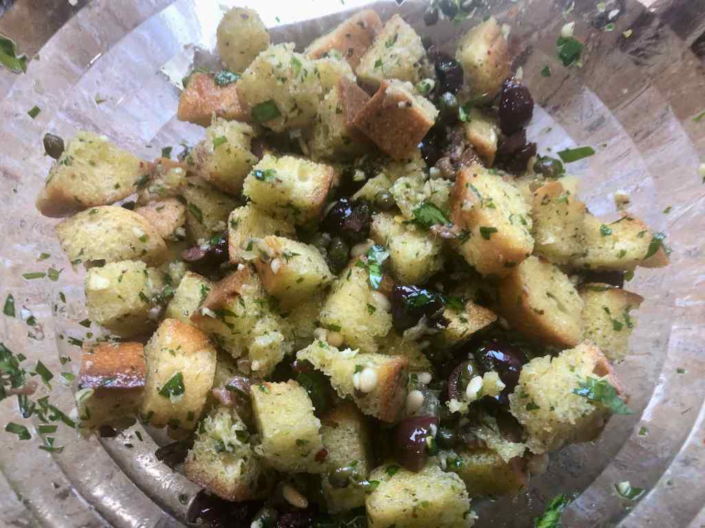 As usual, I pretty much followed the recipe except for substituting Kalamata olives for Gaeta, and brined capers for salted. And while the recipe included an optional “few anchovies,” I used six and mistakenly used a half cup of olive oil as opposed to a third. The latter was a happy fault, however, since my bread needed even more oil as I prepared the stuffing. My one disappointment, was that some of the bread cubes came out overly toasted, and this led me to suggest in my adaptation covering them loosely with foil during the last 5 to 10 minutes of cooking.