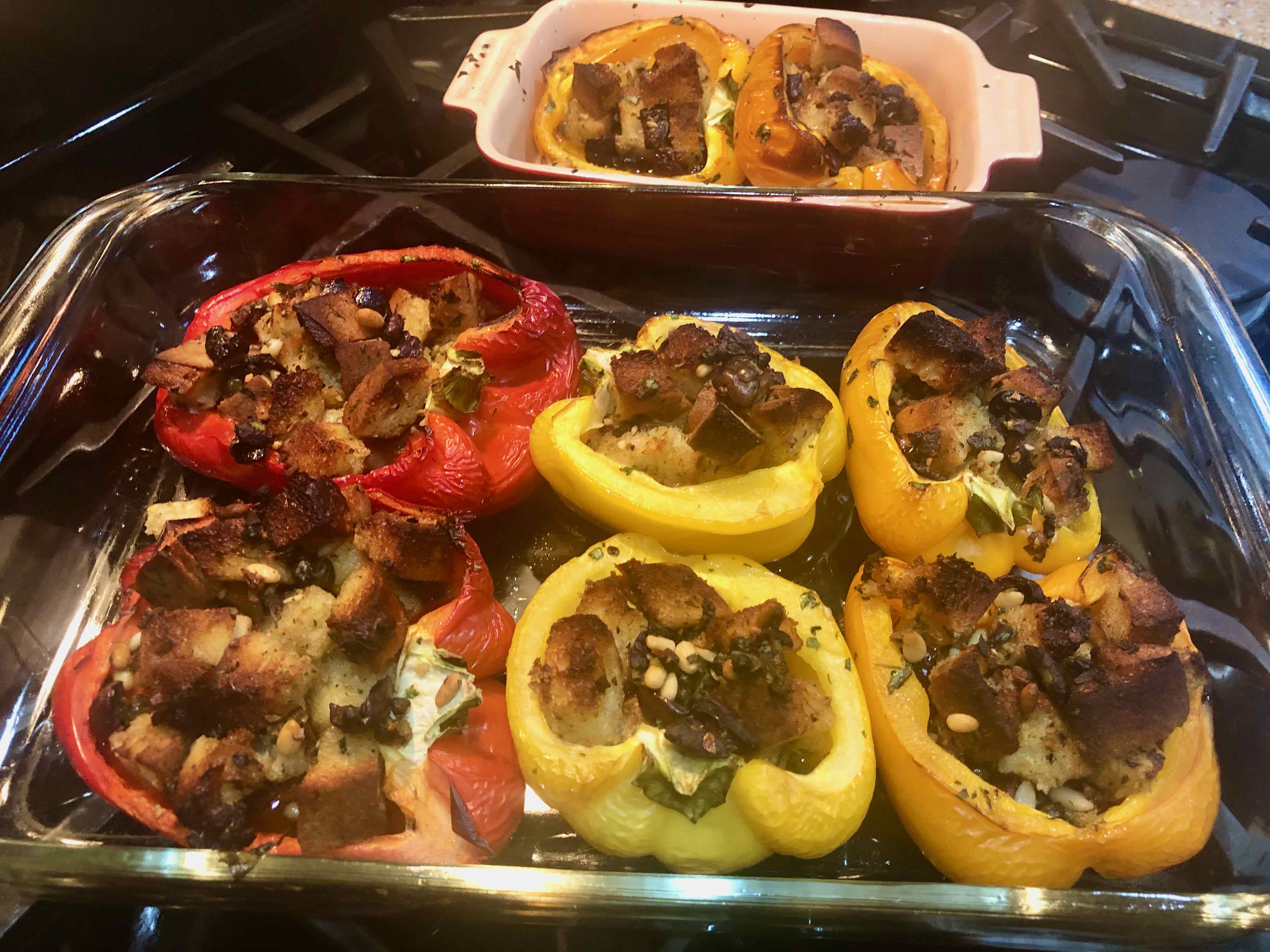Although the peppers yielded by the recipe were far different from my aunt’s, they were impressively delicious. The peppers were perfectly roasted with just the right amount of bite, and the savory stuffing perfectly complemented the sweetness of the peppers. As an homage to my aunt’s version, upon serving, I drizzled the peppers with some red-wine vinegar to brighten them with some acidity.