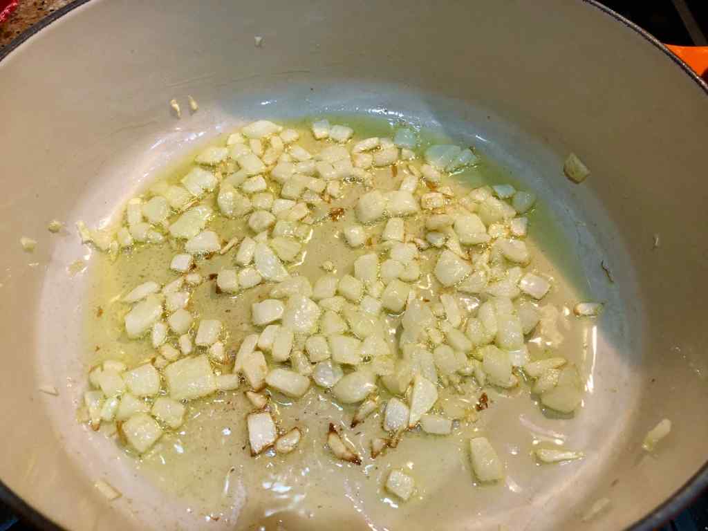1. Place the olive oil and the onion in a heavy-bottomed pot with a little bit of salt, and cook over medium heat until the onion is softened, about 8 minutes.