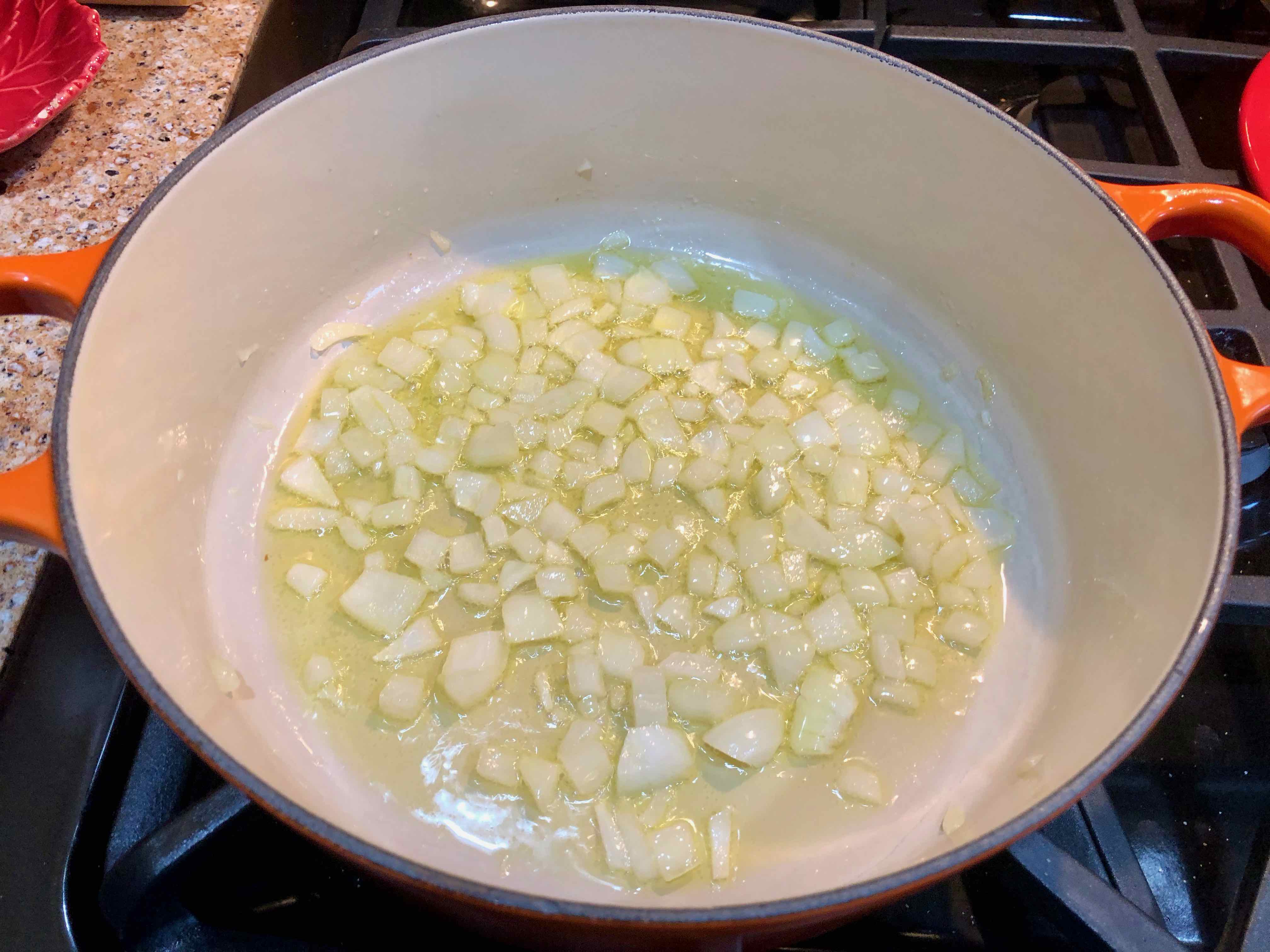 1. Place the olive oil and the onion in a heavy-bottomed pot with a little bit of salt, and cook over medium heat until the onion is softened, about 8 minutes.