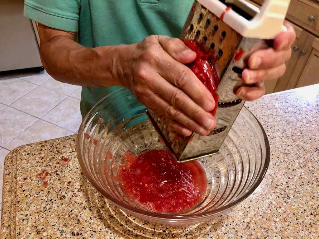 1. Using the large holes on the box grater, grate the trimmed side of the tomato into a large bowl until nothing but skins remain. Discard skins.