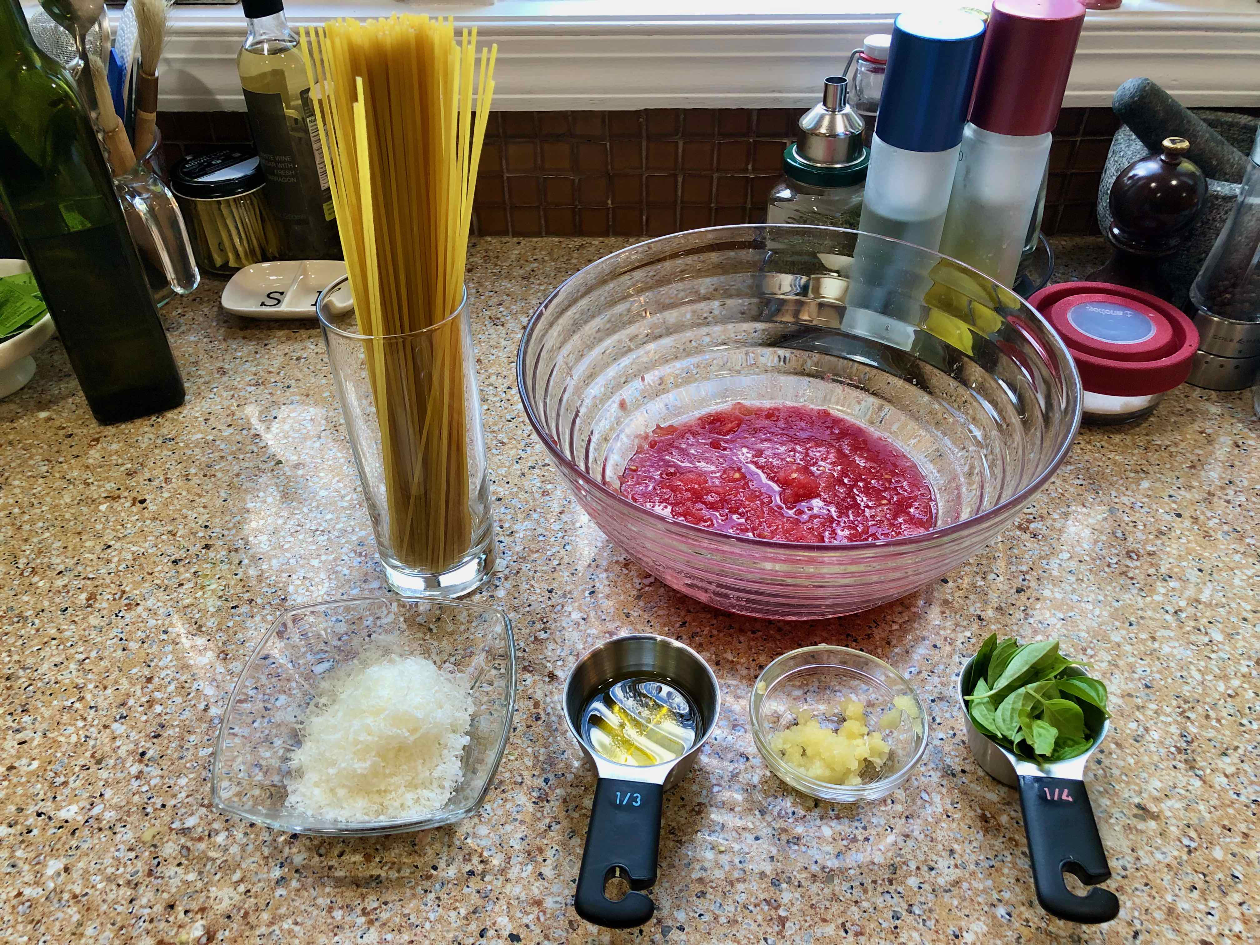 As I was cooking for two, I halved the amounts listed in the original recipe. And since I like my prep work far along as possible before cooking, I also chose to trim and grate the tomatoes before putting up the pasta.