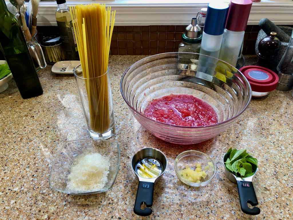 Perhaps it was kismet that the day after I read a New York Times recipe for Grated Tomato Pasta, friends dropped by with a box load of farm-stand tomatoes. The ripe and juicy beefsteaks were just what the recipe required. Having its few other ingredients on hand, spaghetti, olive oil, garlic, Parmigiano, and basil, also triggered me to prepare the dish the same day.
