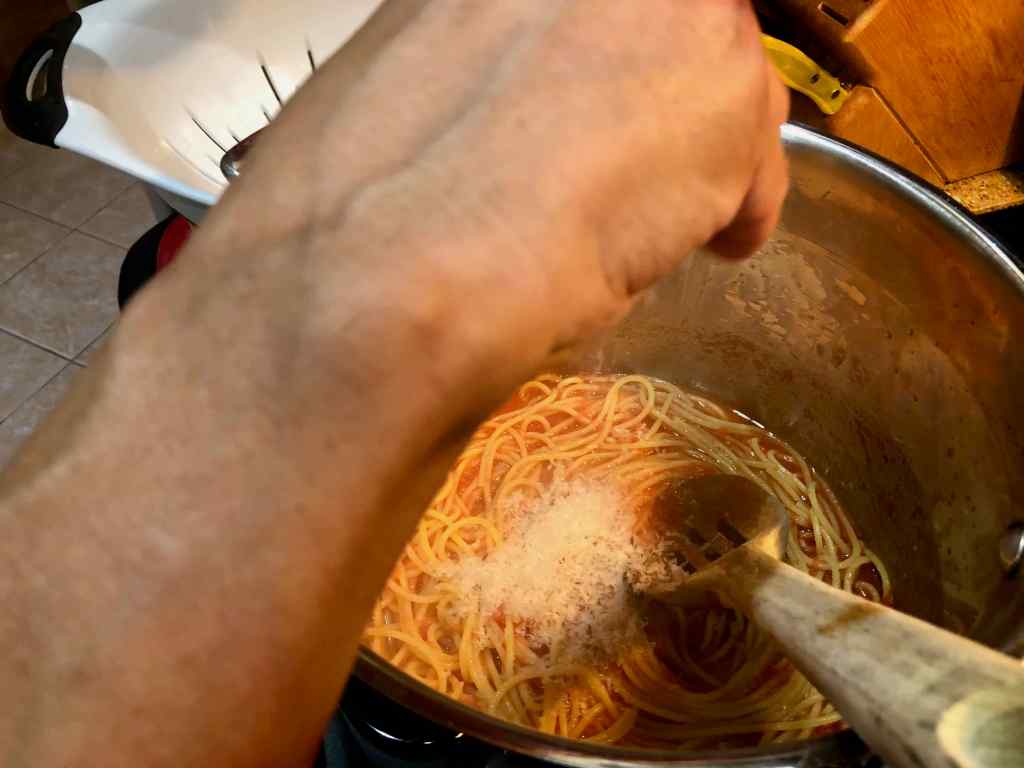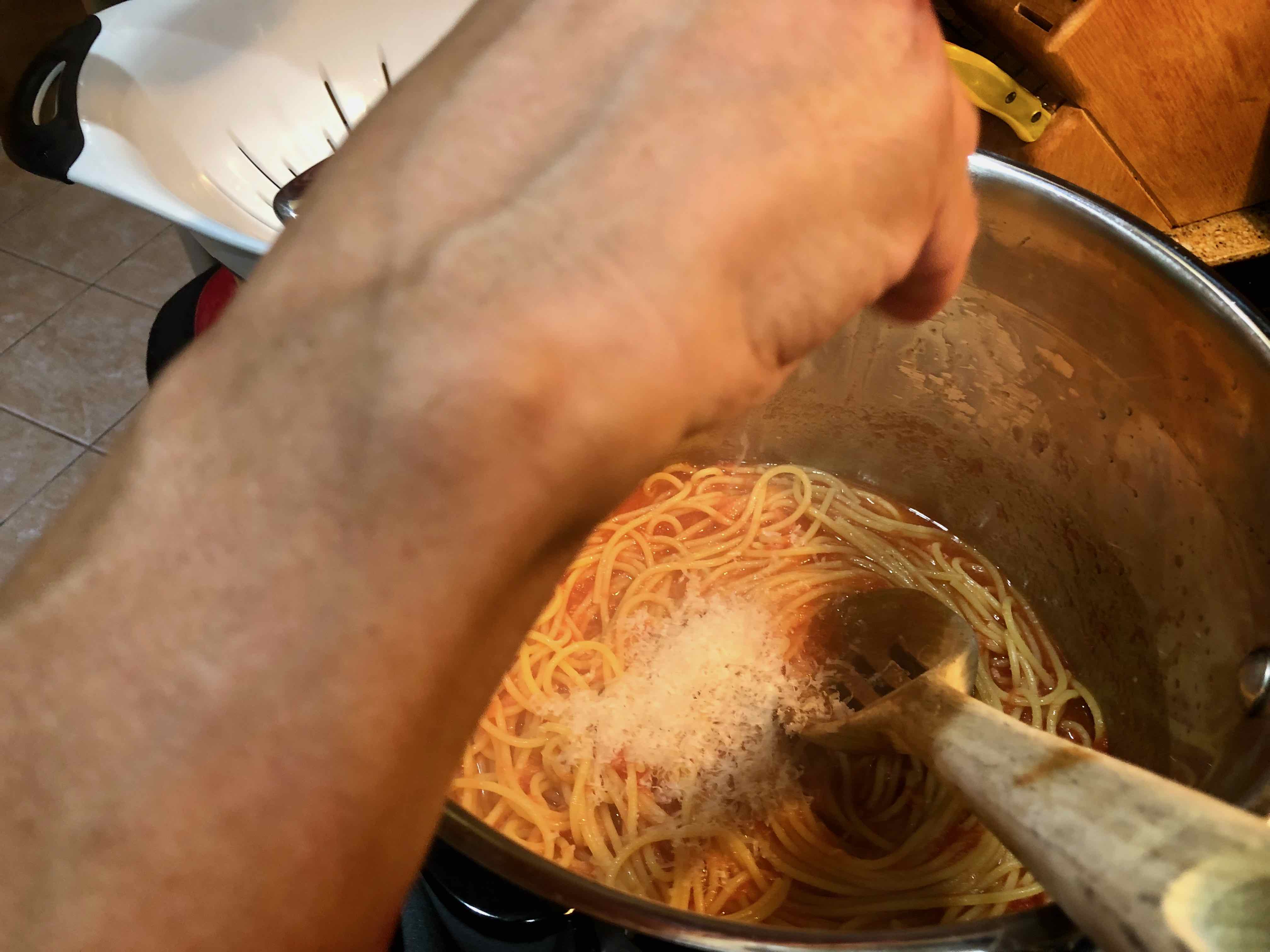 4. Add the grated tomatoes and season with a large pinch of salt. As soon as the mixture comes up to a simmer (about 3 minutes), turn off the heat and add the spaghetti and half the Parmigiano. Stir vigorously until the spaghetti is coated in sauce and the cheese has melted.