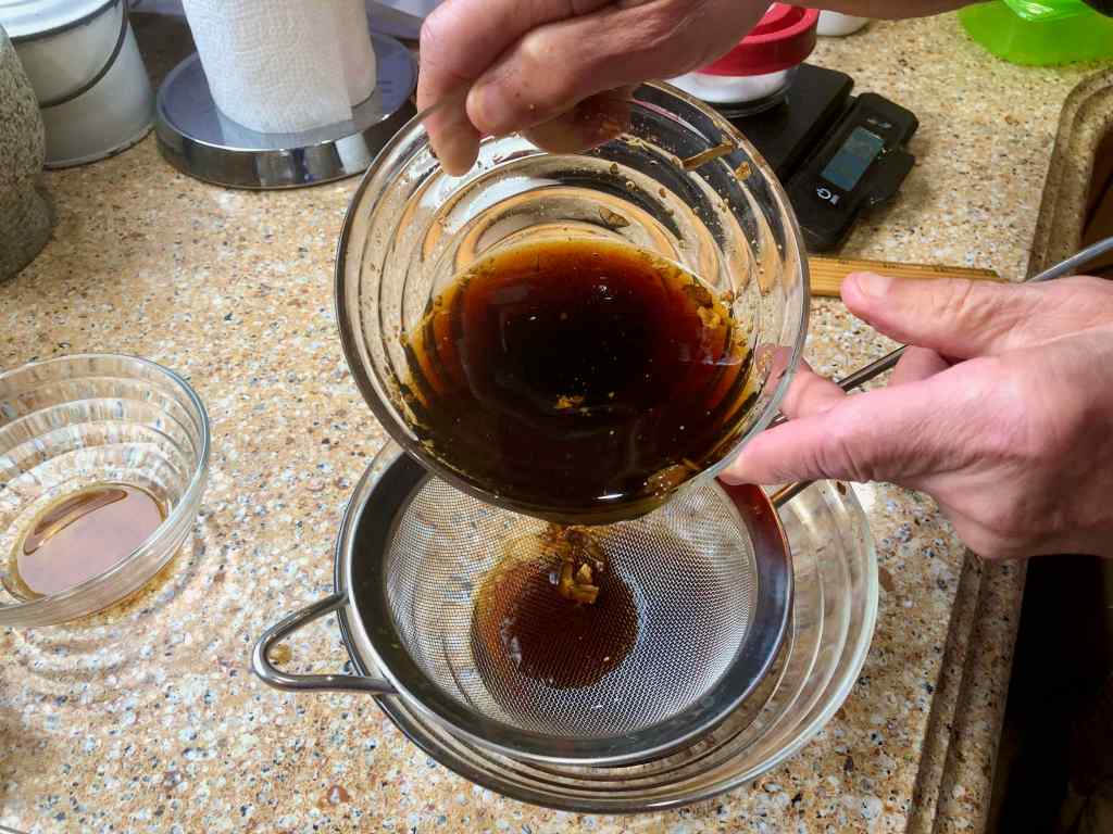 1. Place the mushrooms in a bowl with the water. Let stand 30 minutes. Lift the mushrooms out of the liquid and rinse them well under running water, paying special attention to the base of the stems where soil collects. Drain, then chop fine. Pour the soaking liquid through a paper coffee filter-lined strainer into a bowl. (The mushrooms I used had a minimum of grit, so I skipped the rinsing as well as the use of a paper towel.)