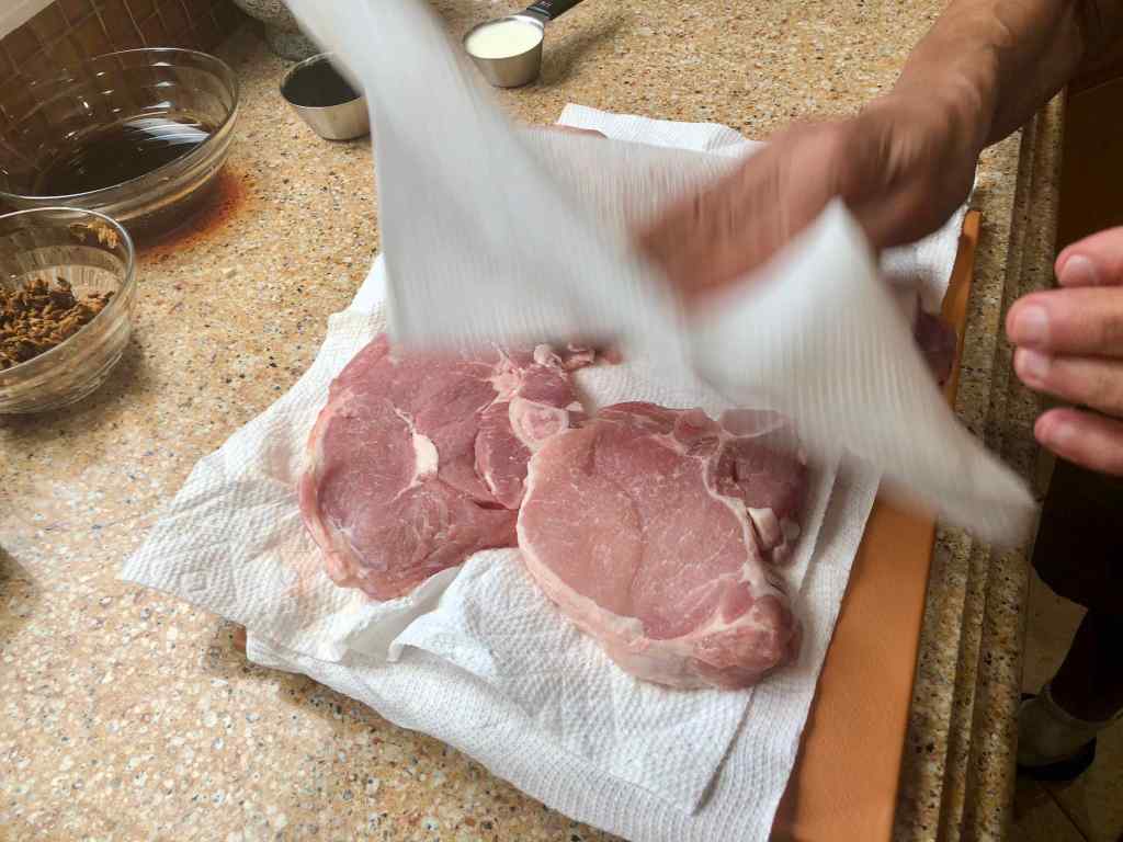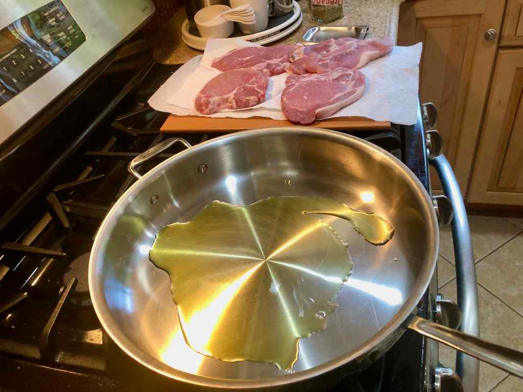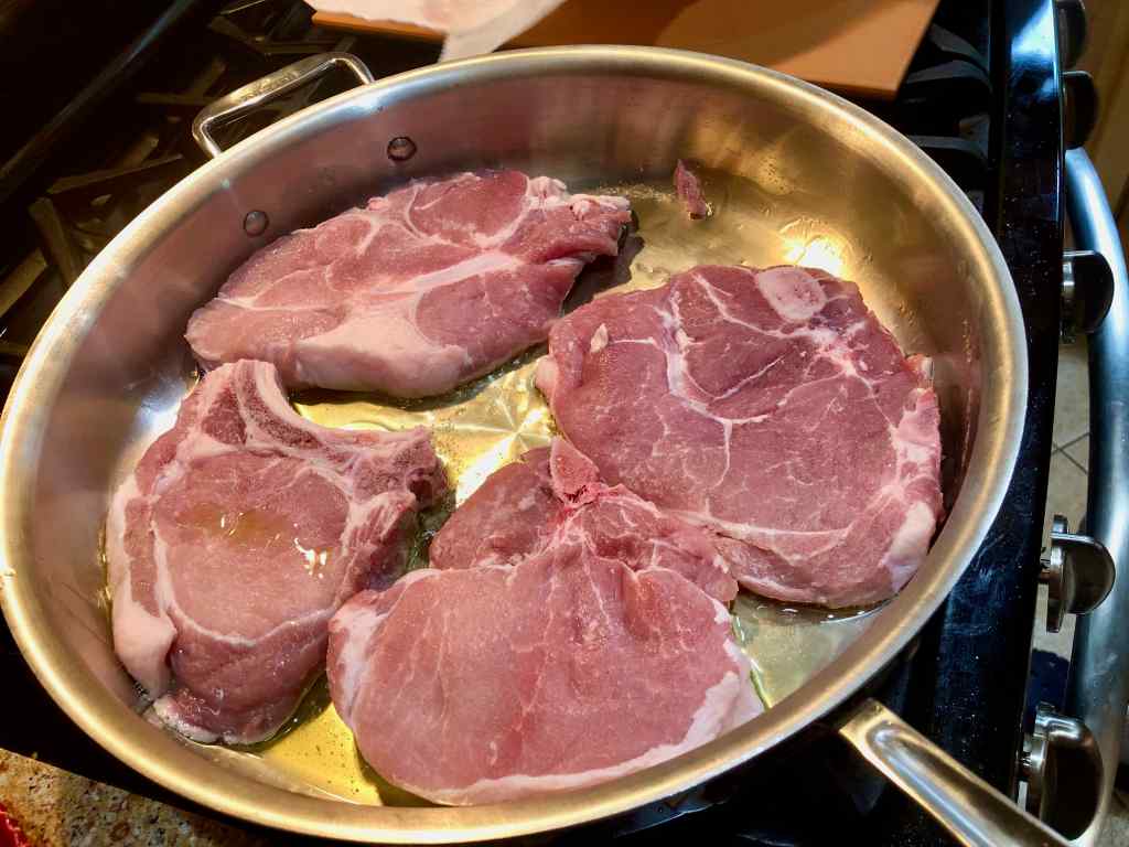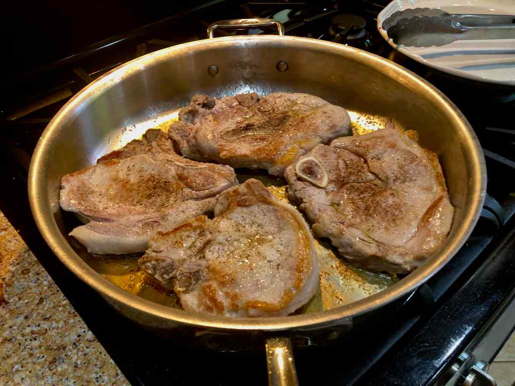 2. In a large skillet, heat the oil over medium heat. Pat the chops dry. Place the chops in the pan in a single layer. Cook until they are nicely browned, about 2 minutes.