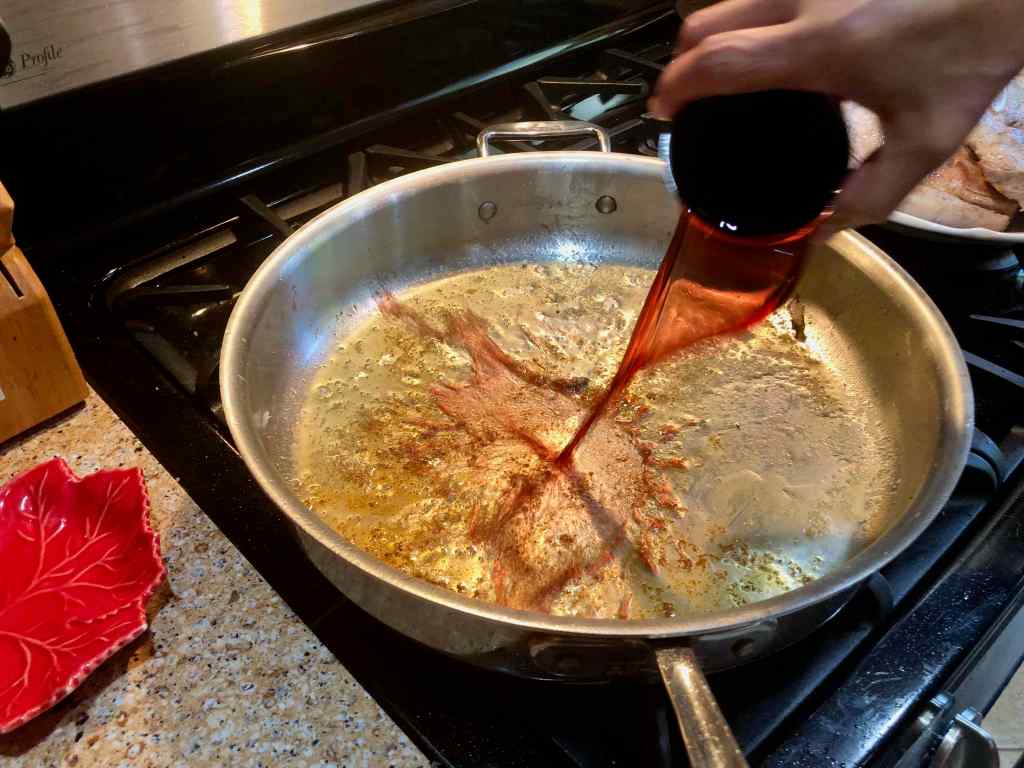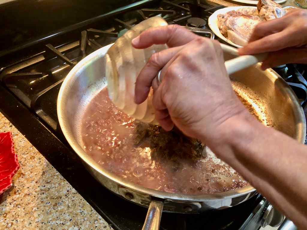 7. Return the chops (along with any residual juices) to the pan. (I suggest turning the chops in the sauce to coat.) Cook 5 minutes more, or until the chops are just cooked through and the sauce is thickened. Serve immediately on warmed plates. Optionally, sprinkle with chopped thyme.