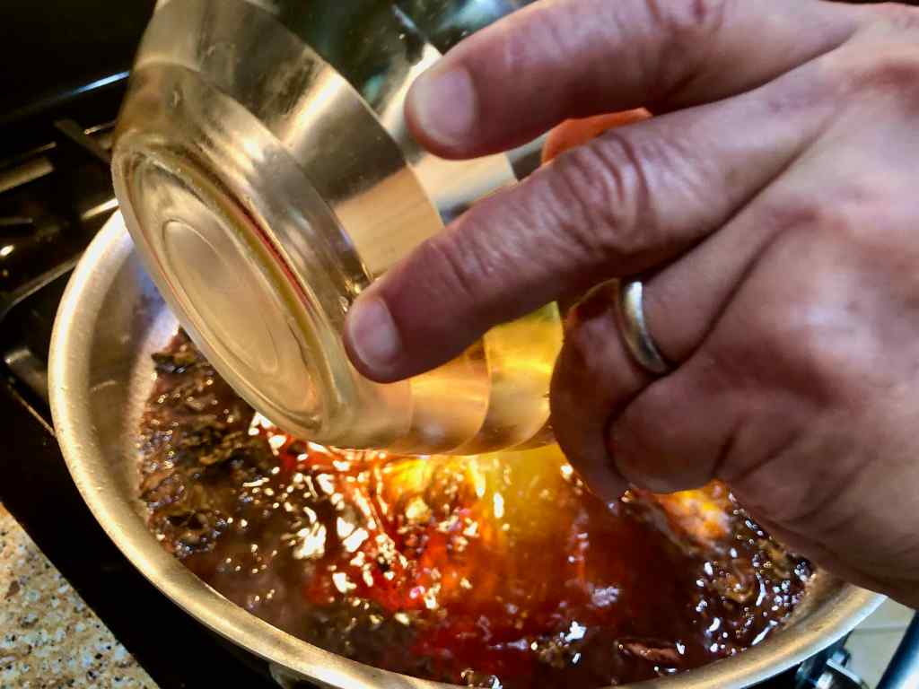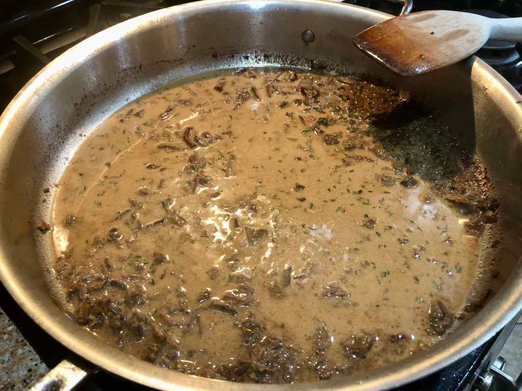 5. Add the porcini and their soaking liquid. Reduce the heat to low. Simmer 5 to 10 minutes, or until the liquid is reduced.