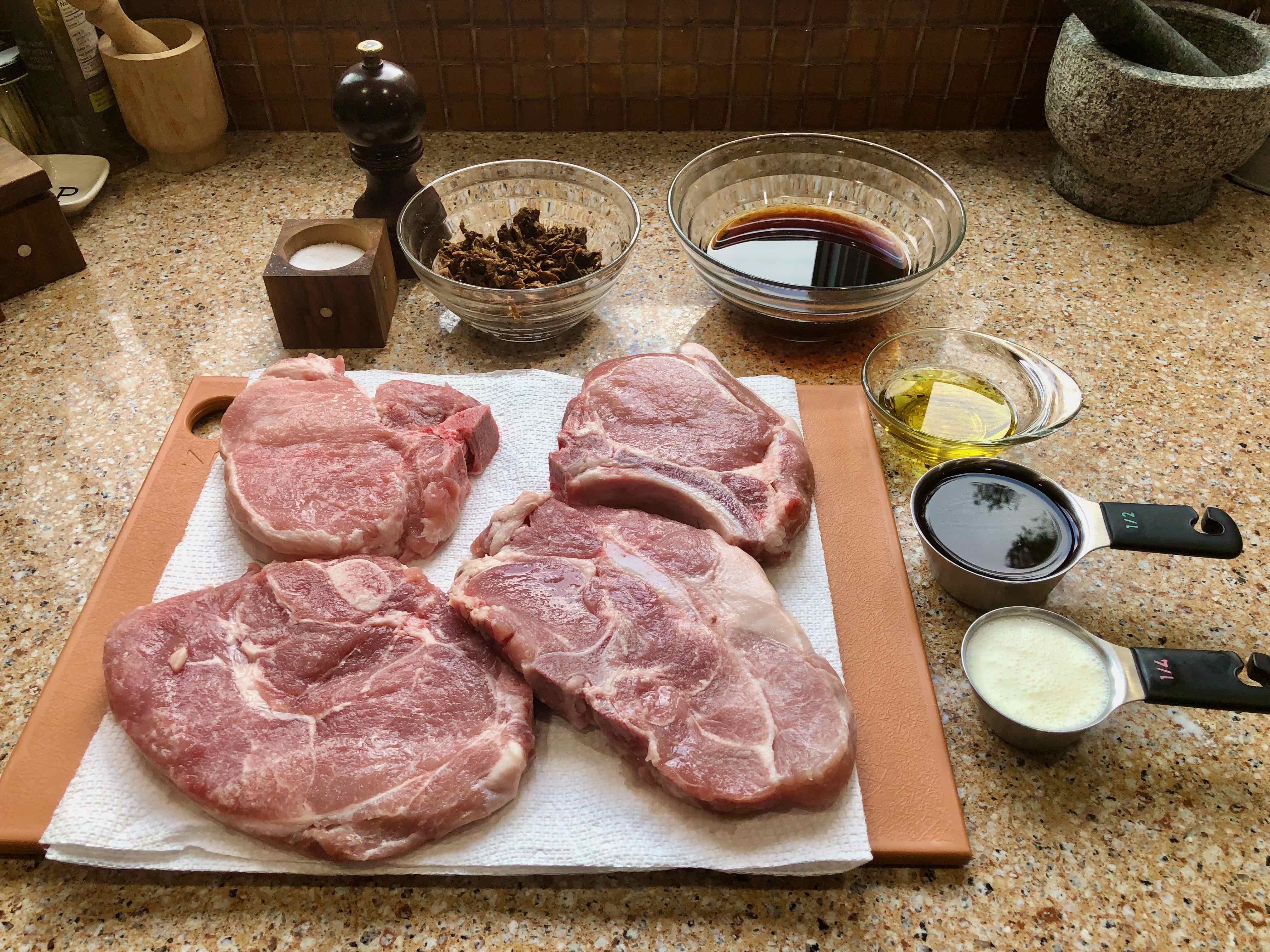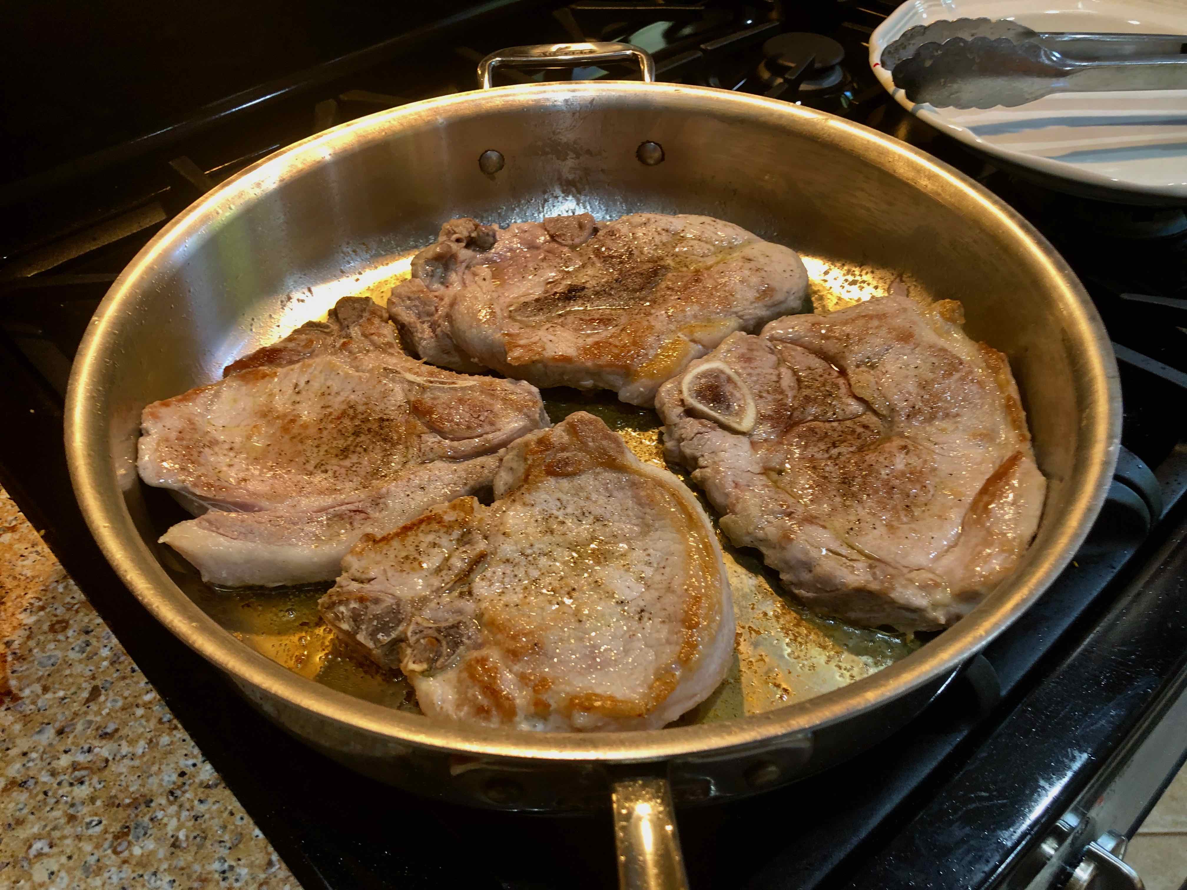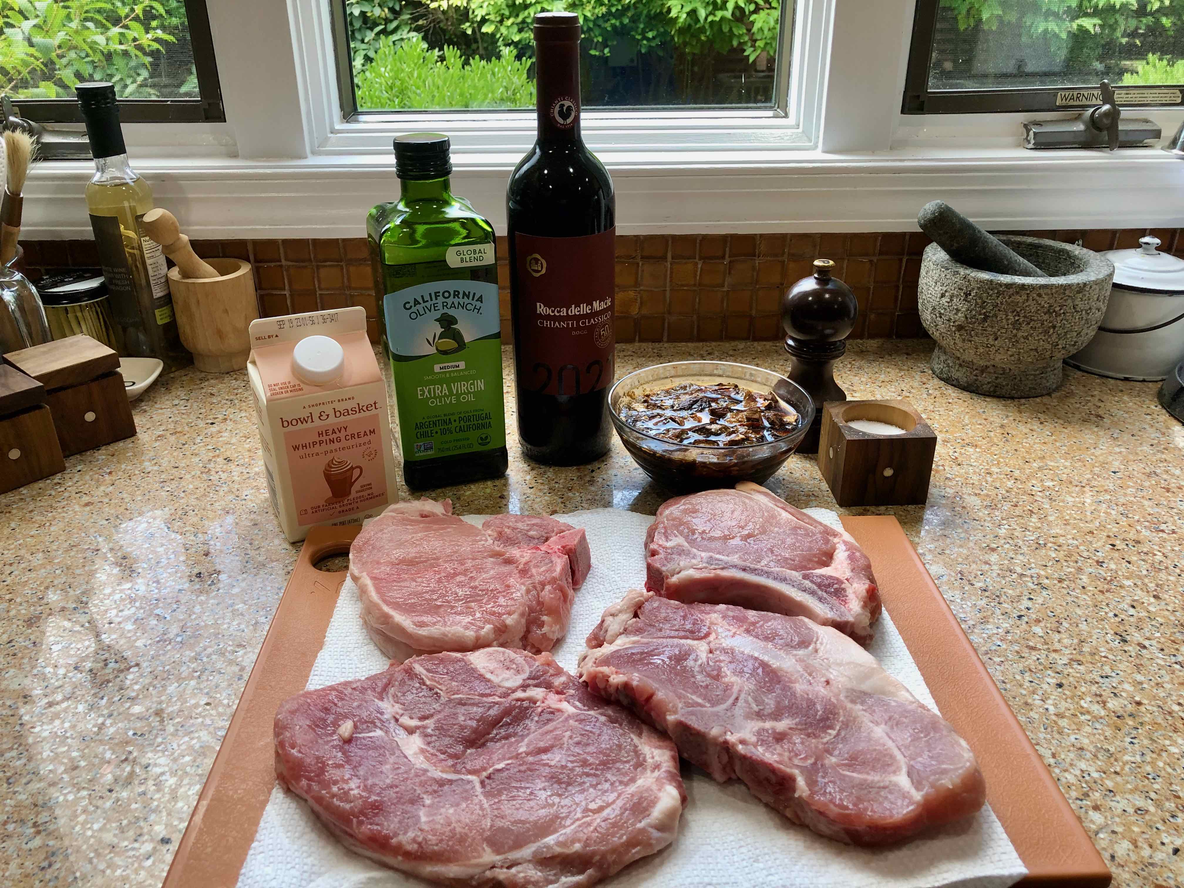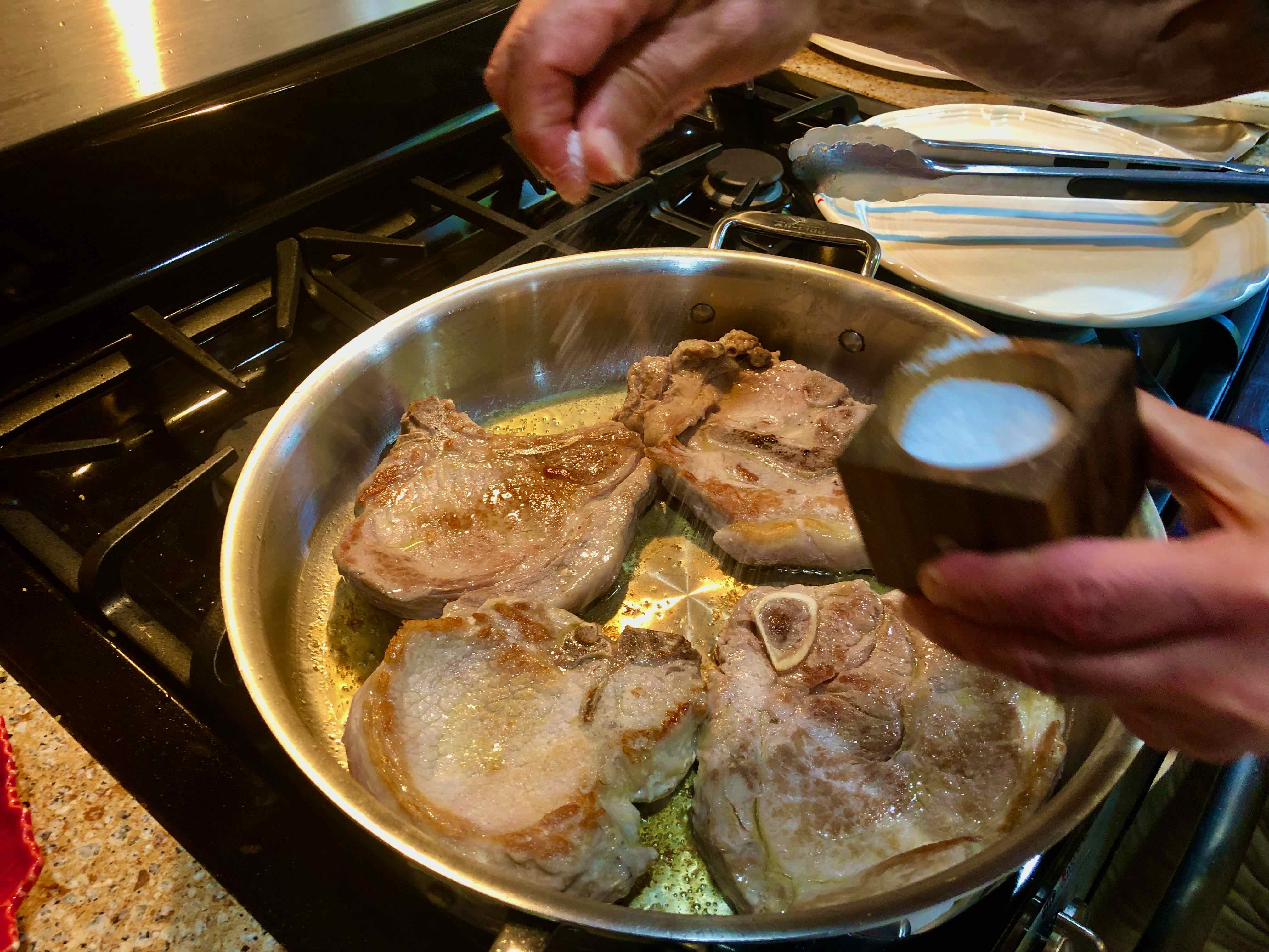Faced with a bunch of oddly cut pork chops that needed to be used up, I turned to one of my favorite recipes for them: It’s from the cookbook 1,000 Italian Recipes by Michele Scicolone.