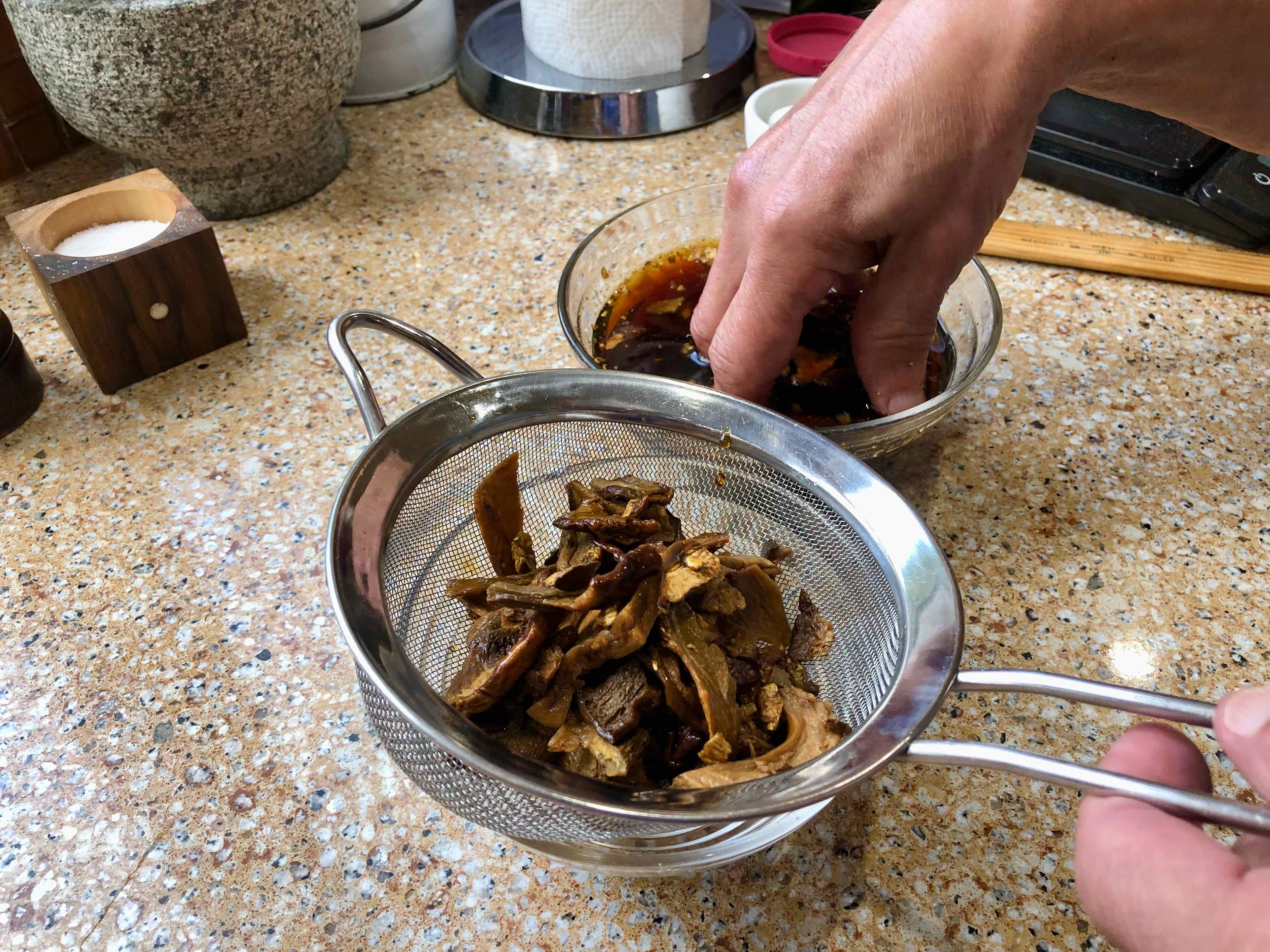 1. Place the mushrooms in a bowl with the water. Let stand 30 minutes. Lift the mushrooms out of the liquid and rinse them well under running water, paying special attention to the base of the stems where soil collects. Drain, then chop fine. Pour the soaking liquid through a paper coffee filter-lined strainer into a bowl. (The mushrooms I used had a minimum of grit, so I skipped the rinsing as well as the use of a paper towel.)