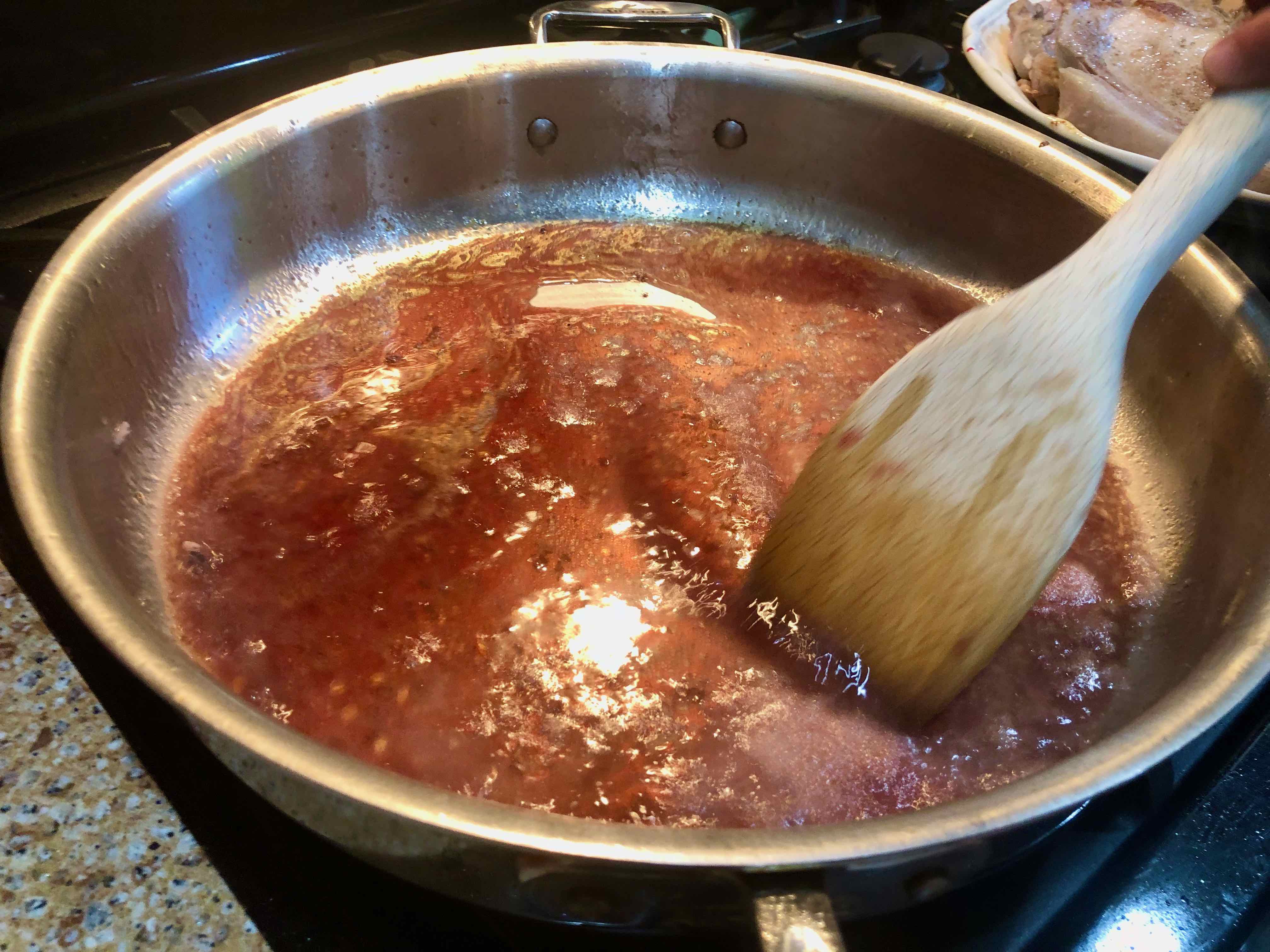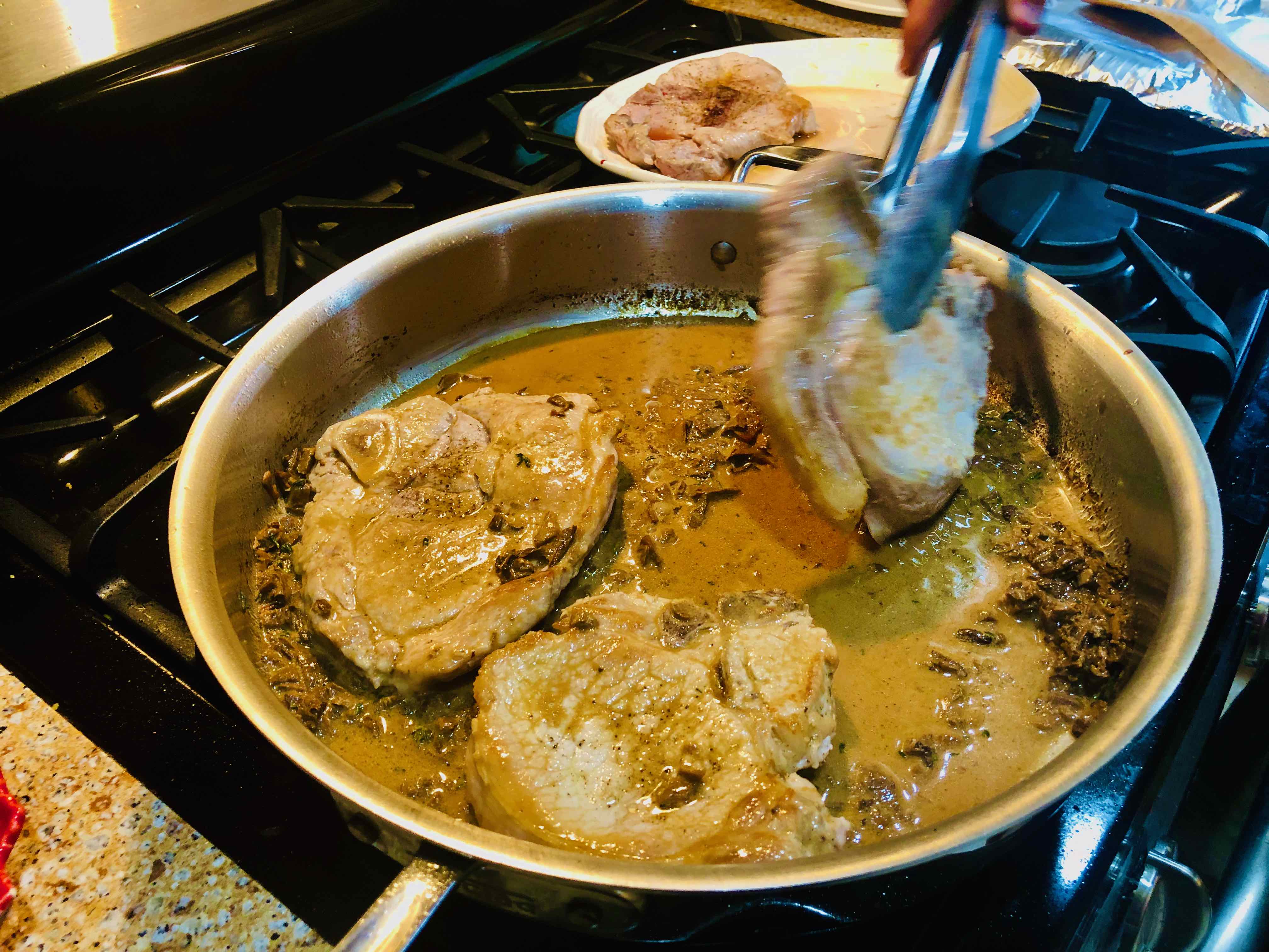 7. Return the chops (along with any residual juices) to the pan. (I suggest turning the chops in the sauce to coat.) Cook 5 minutes more, or until the chops are just cooked through and the sauce is thickened. Serve immediately on warmed plates. Optionally, sprinkle with chopped thyme.