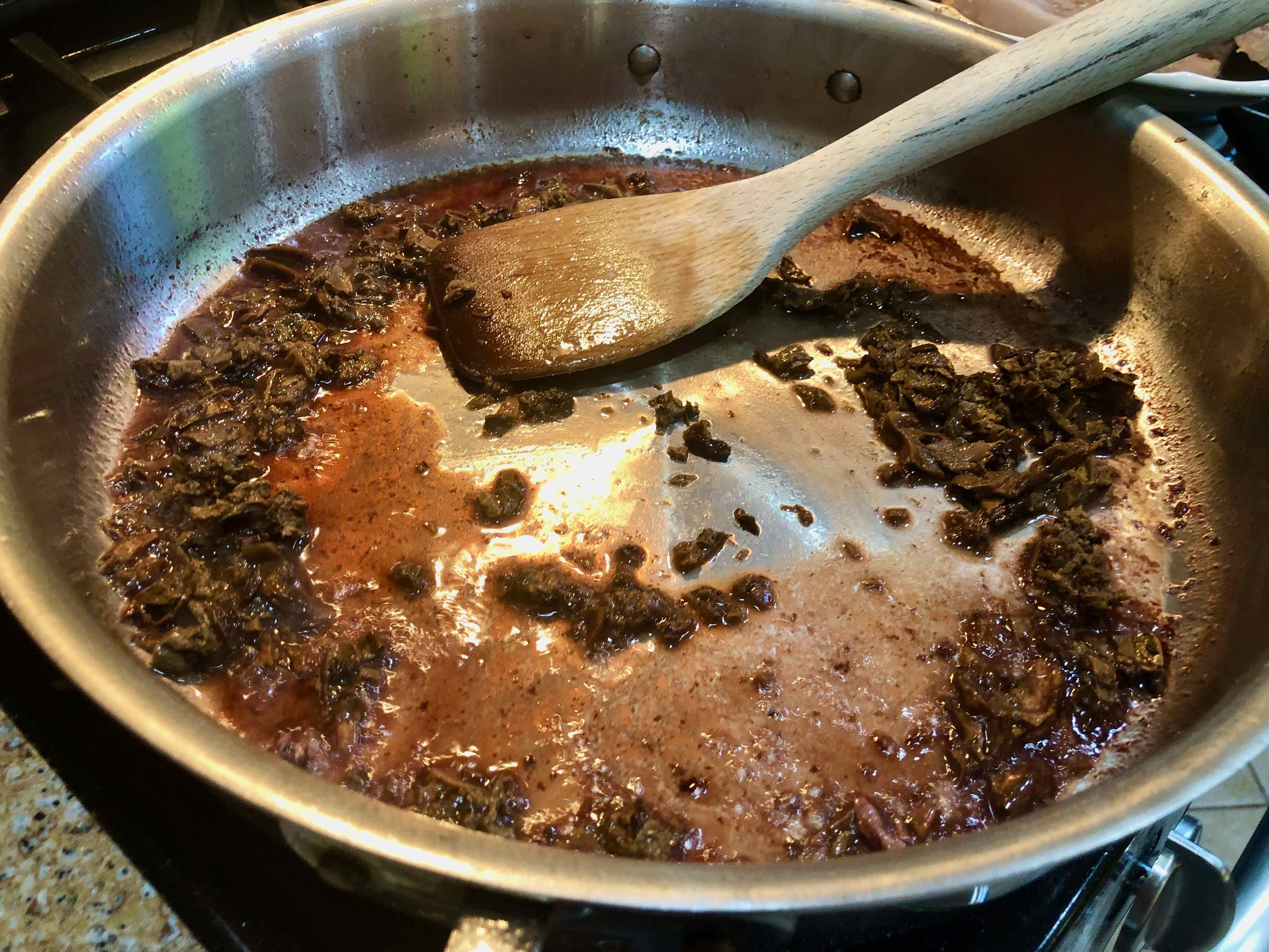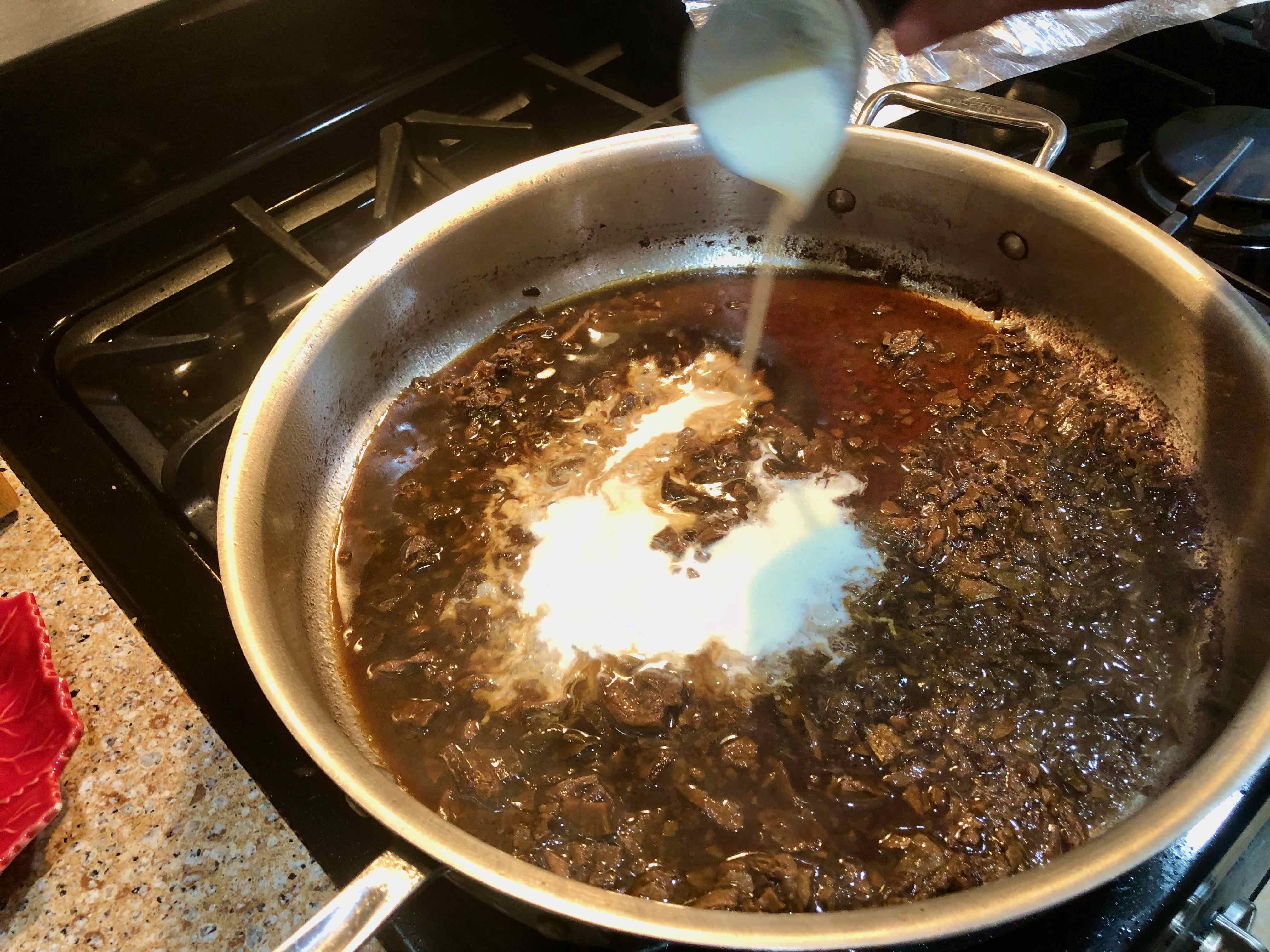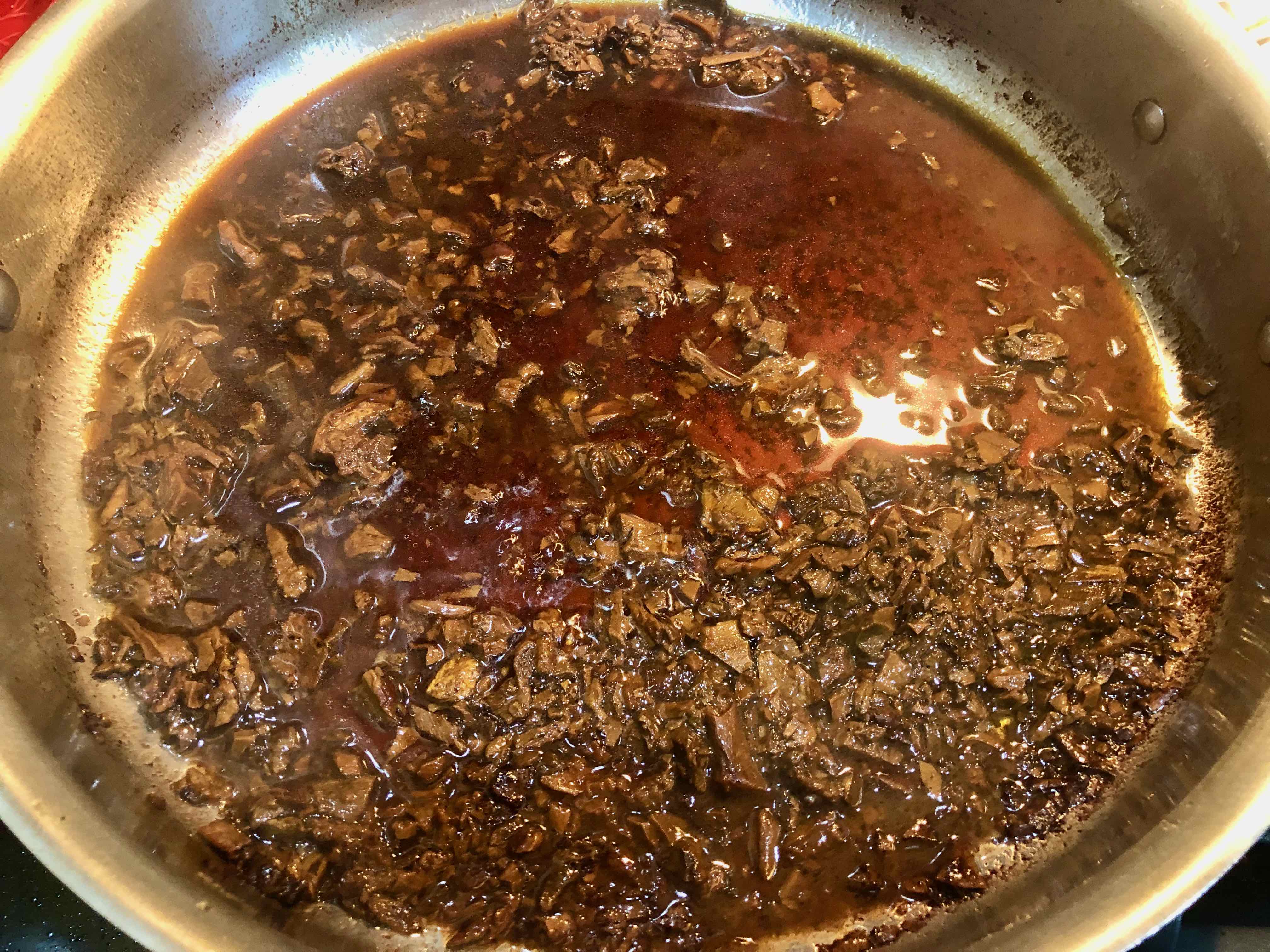 5. Add the porcini and their soaking liquid. Reduce the heat to low. Simmer 5 to 10 minutes, or until the liquid is reduced.