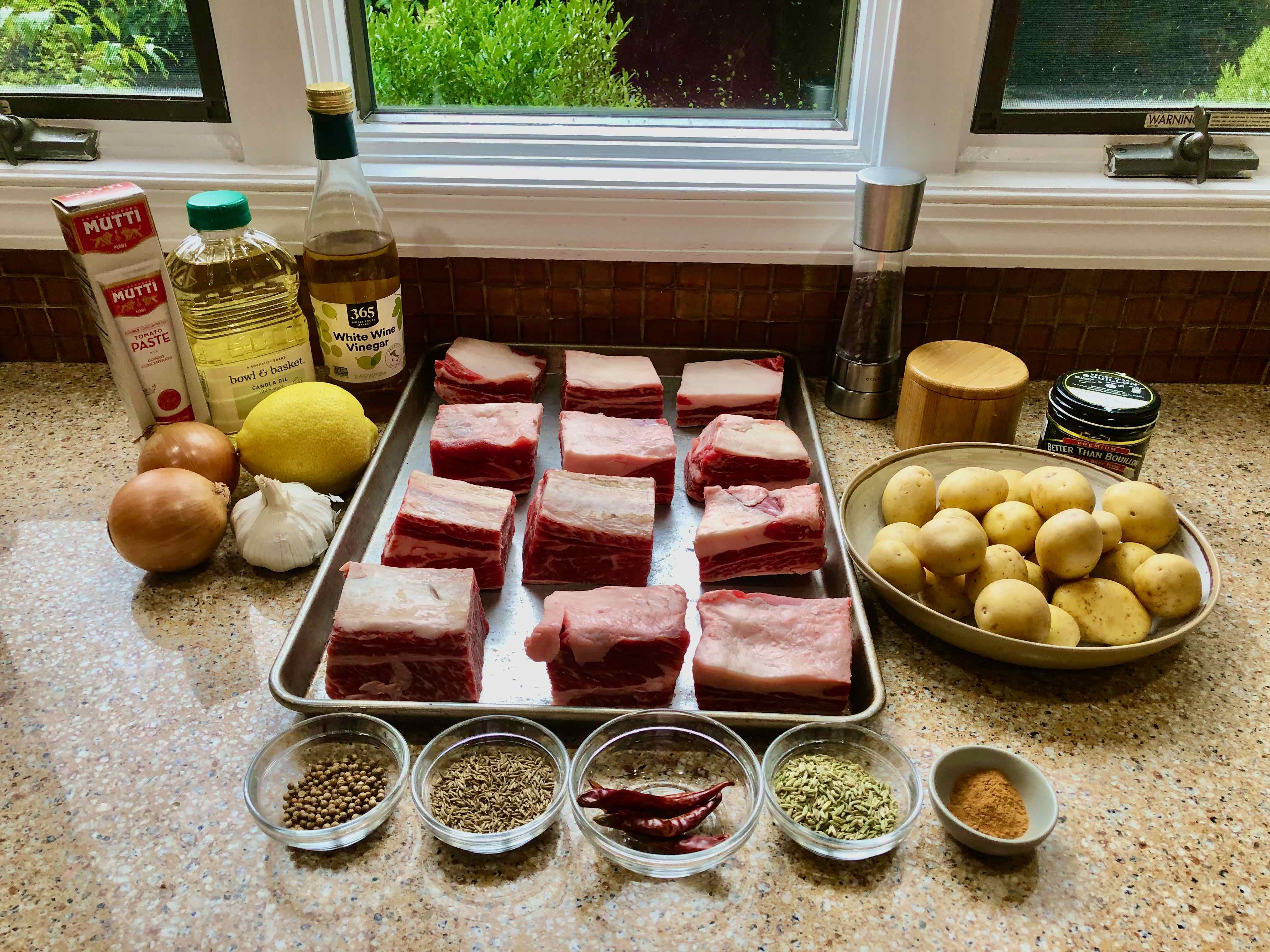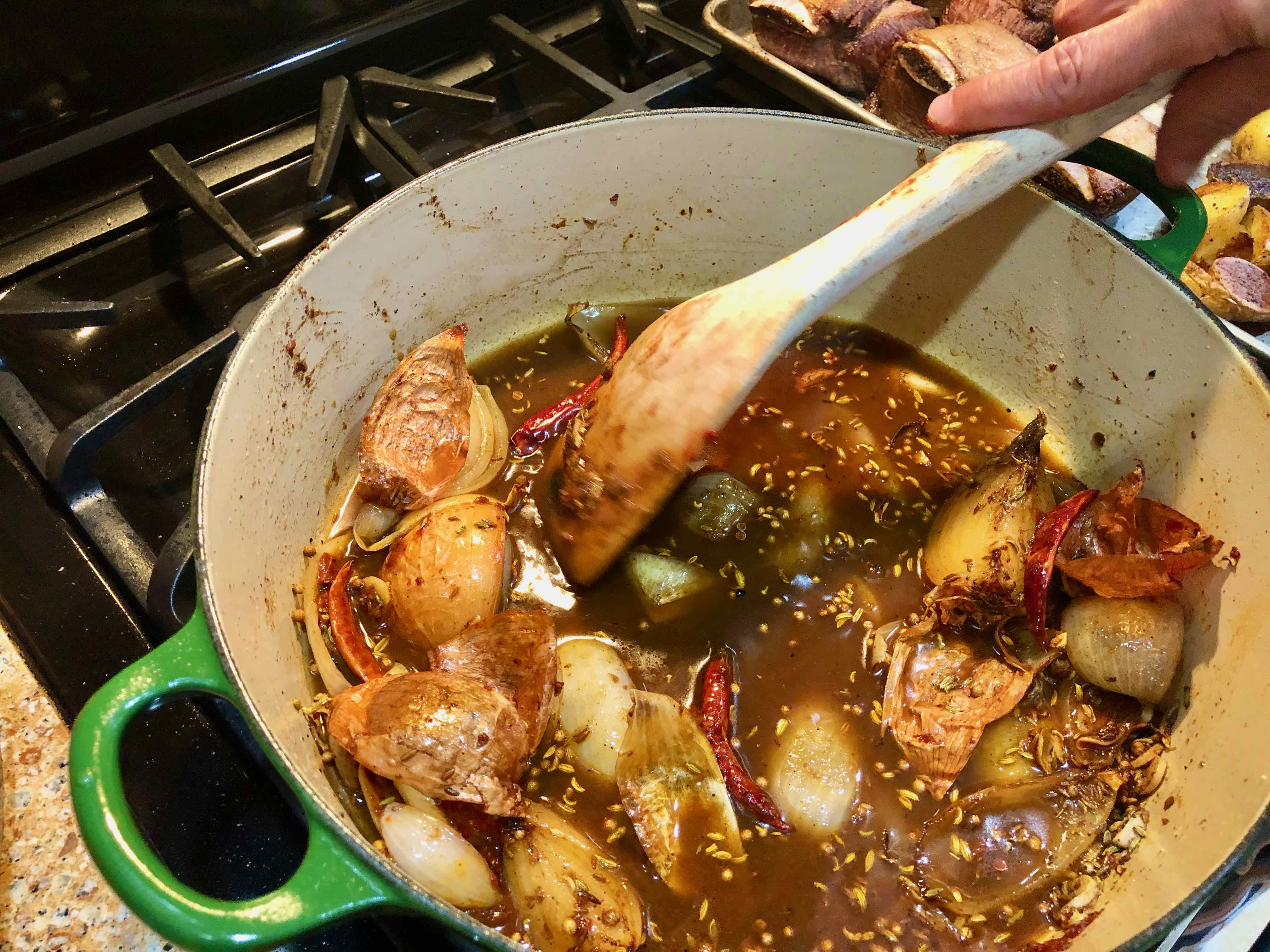 I have to admit that her choice of spices, chili de árbol, cumin seeds, fennel seeds, coriander seeds, and ground cinnamon, gave me some pause, but after watching a video of her preparing the dish, I threw caution to the wind and forged ahead. The video also led me to vary from the print recipe in two ways. Following her suggestion, I used Better than Bullion Roasted Beef base for the broth and upped the amount of finely chopped lemon. I also was relieved to find that she was forced, as I was, by an availability issue, to use a bunch of little potatoes rather than the four Yukon Golds in the print recipe.