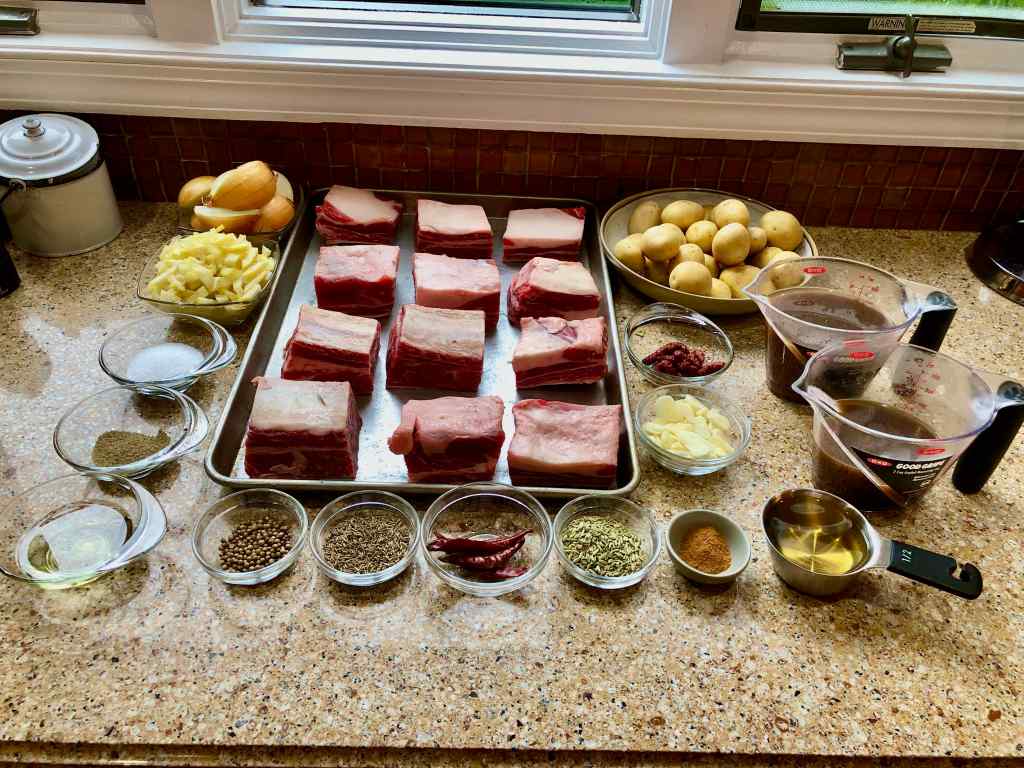 So, when the first day of fall arrived with cloudy skies and intermittent rainfall, we decided to have some friends over for dinner and serve my favorite braised dish, beef short ribs. More often than not, I braise them in wine, but after my success with last week’s slow-roasted chicken from Alison Roman’s Nothing Fancy cookbook, I thought I’d use another one of her recipes to prepare them: “Spiced and Braised Short Ribs with Creamy Potatoes.” What intrigued me most about the recipe was that rather than using the typical Italian red wine and canned tomatoes for the ribs, she opts to take them in what she calls “a spiced and citrusy direction to counter the intensity that is, well, a giant hunk of braised red meat.” Even more appealing was her suggestion to raise the oven temperature from the initial 325 degrees to 425 and cook the dish uncovered for an additional 30 minutes “to crisp up the meat and potatoes and further thicken and reduce the sauce.”