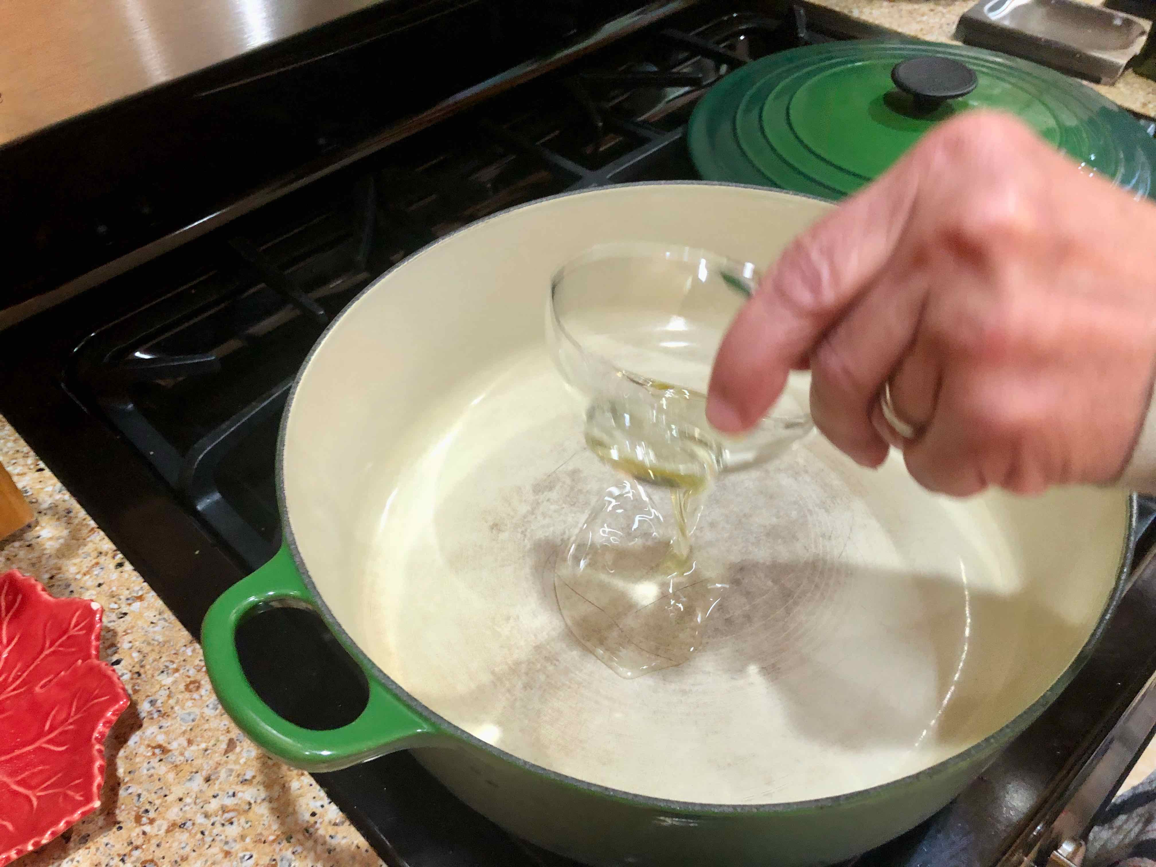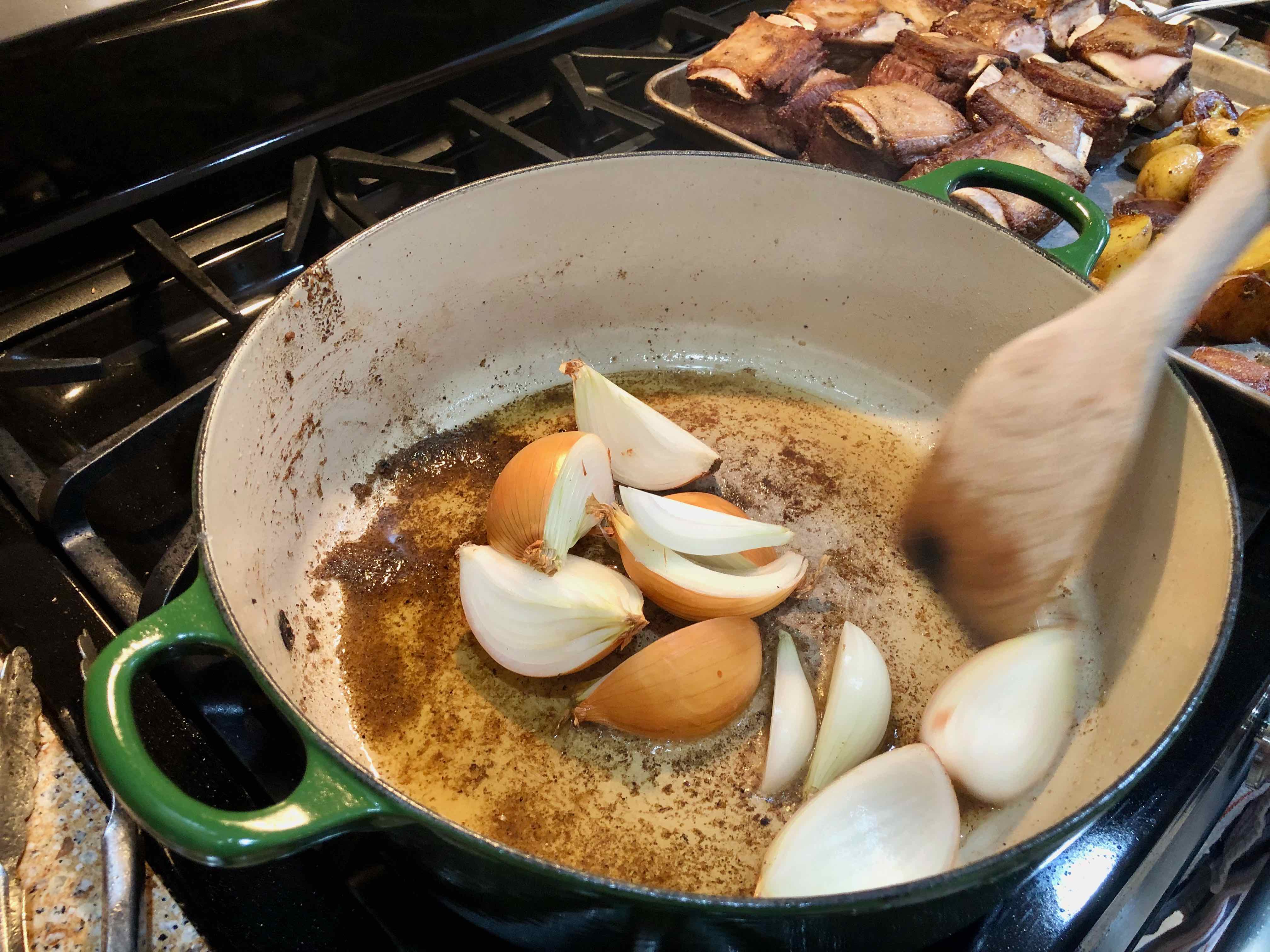 4. Carefully (the pot is hot!) drain fat from the pot, leaving behind about 2 tablespoons of fat and any of the good bits. (I drained it all to a small pot and added back about 3 tablespoons.)